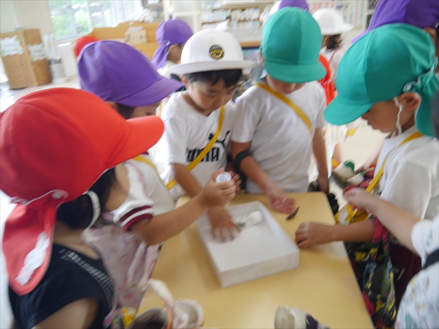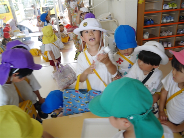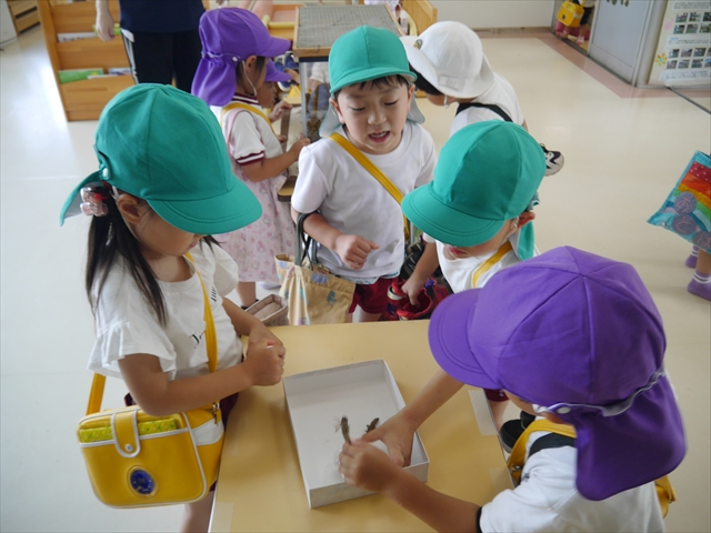 日本最大級のとんぼ「オニヤンマ」のヤゴ(幼虫)の抜け殻をいただきましたので、珍しいので玄関ホールに展示しました。子どもたちも初めて見る子がほとんどのようで、みんな興味津々でじっくり見ていました!ケースから出して持たせてあげると、みんなうれしくて引っ張りだこで、抜け殻も粉々になってしまいました!(^^;) でも、昆虫のいい観察経験になりました。みんないつか本物のオニヤンマもヤゴも捕まえてください!ヘ(^o^)/ (^_^)v