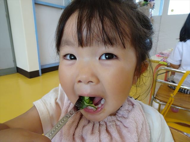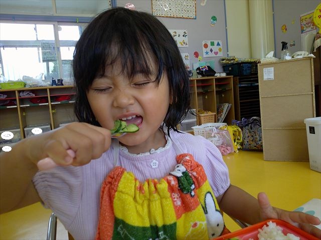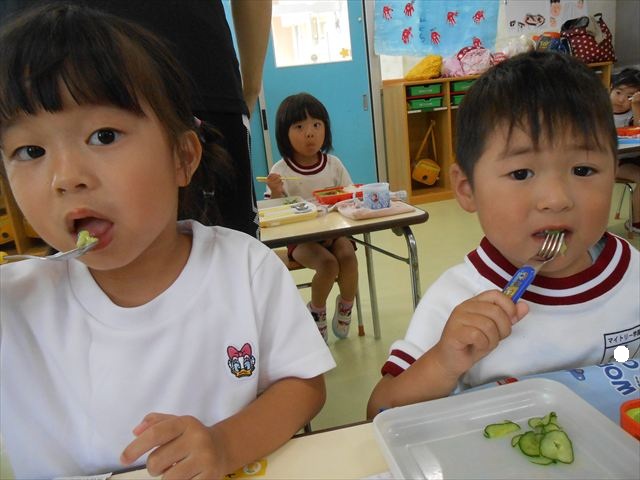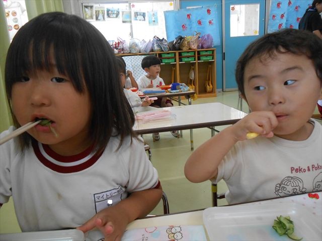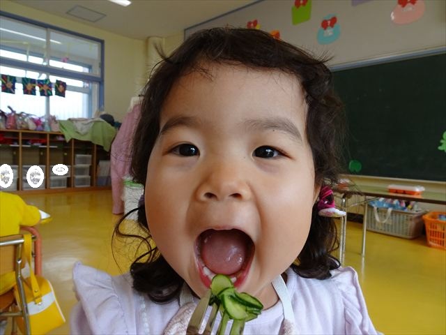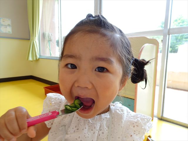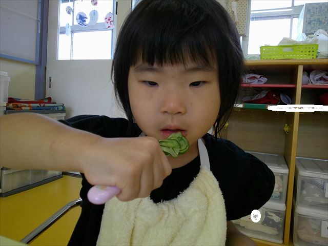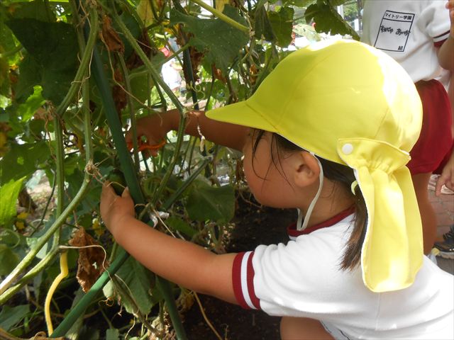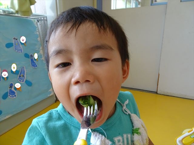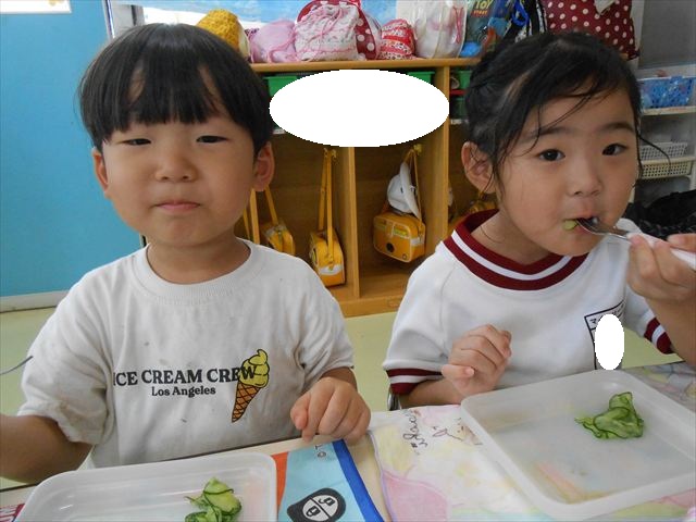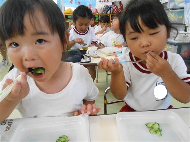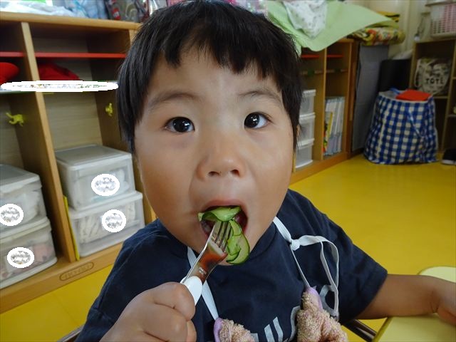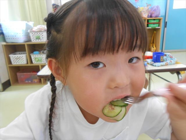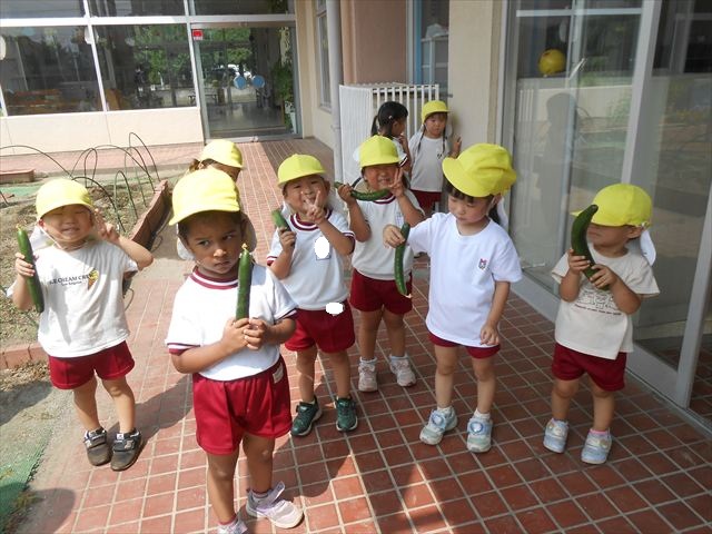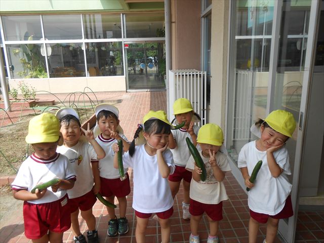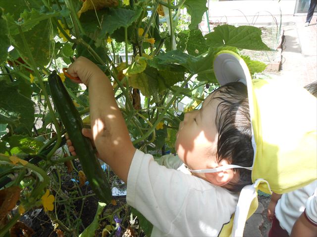 今日はきゅうりが、たくさんできていたので年少さんで収穫して塩もみにしていただきました(