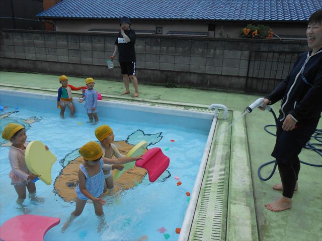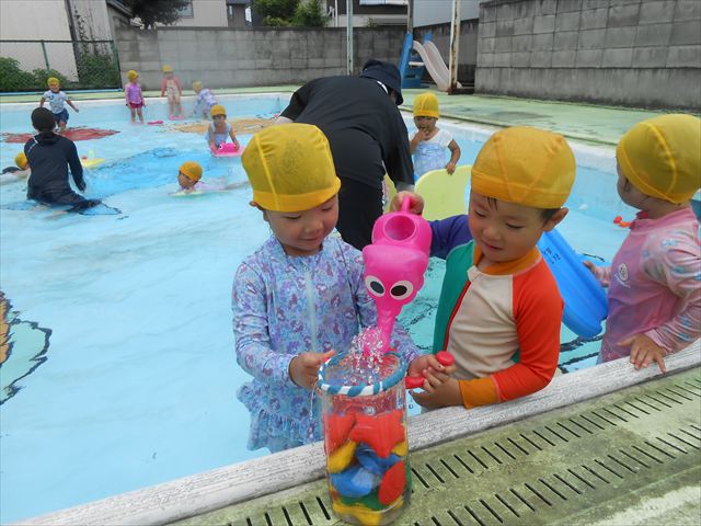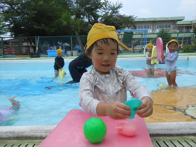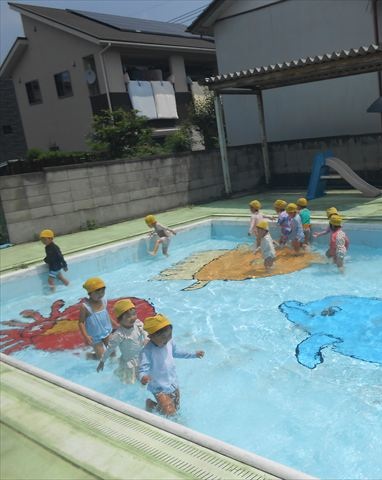 今日もプール遊びをしました!とても暑かったので、汗を流しながら楽しく遊んでいました(
