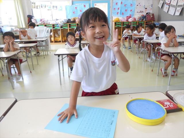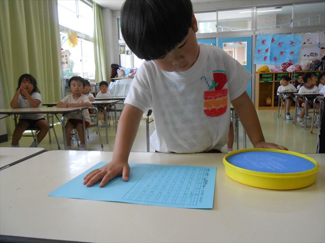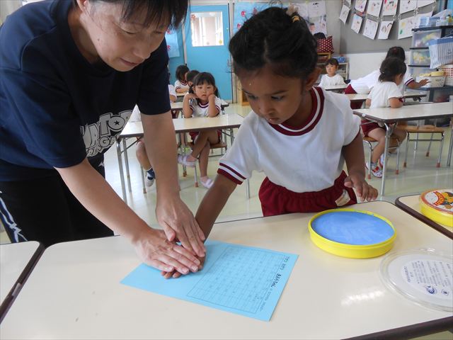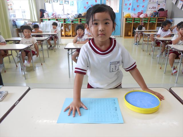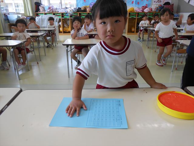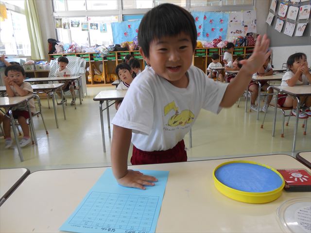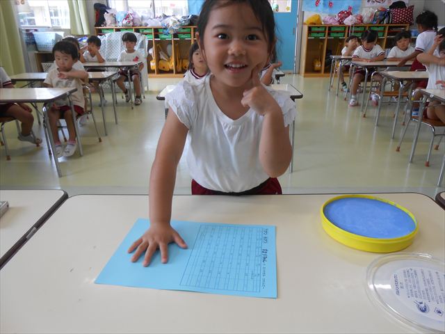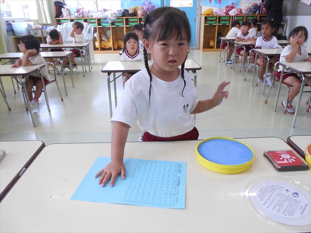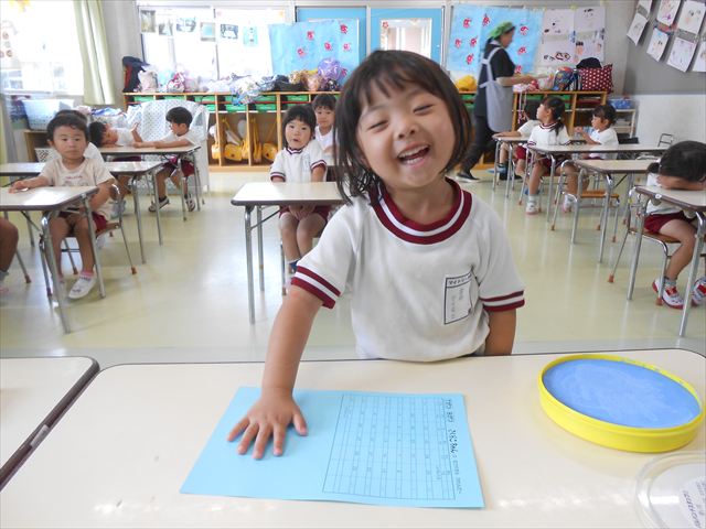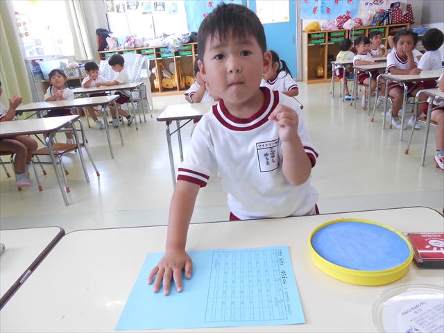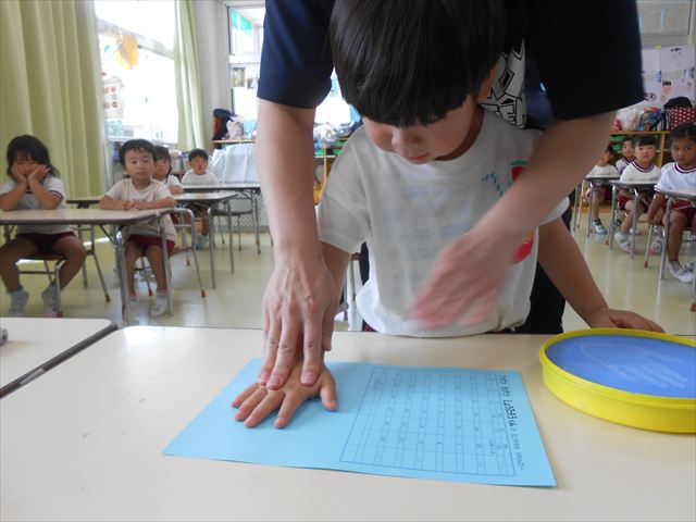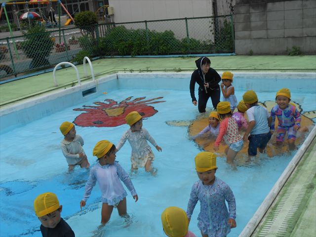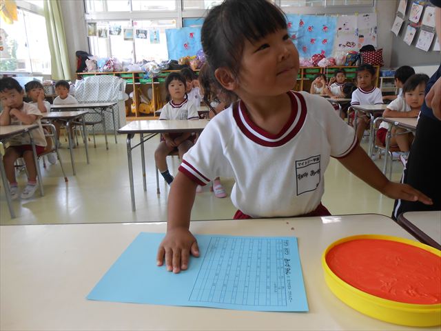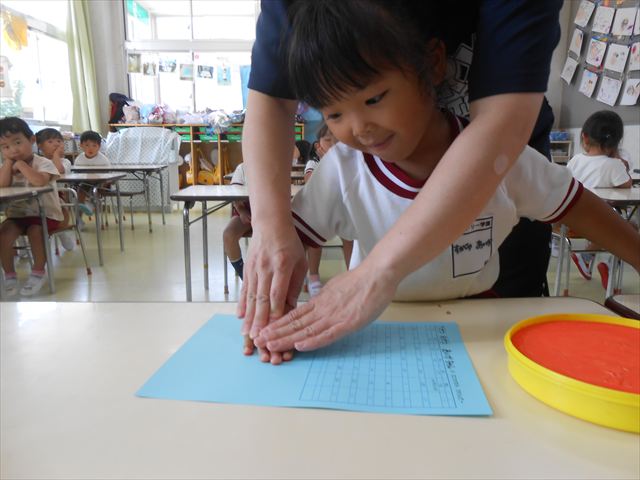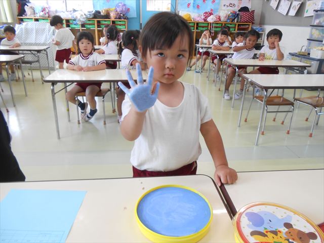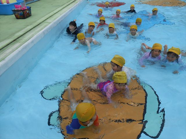 ^^)プールに慣れ、みんなワニになって泳ぐことができました。とっても気持ちよさそうでした。その後は造形活動の時間として手形スタンプをしました。今日は、魚、たこ、金魚から選んでスタンプしました(