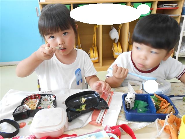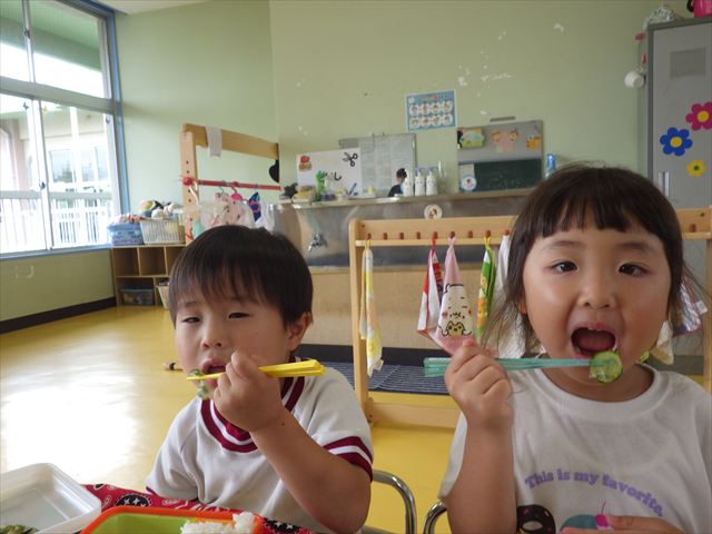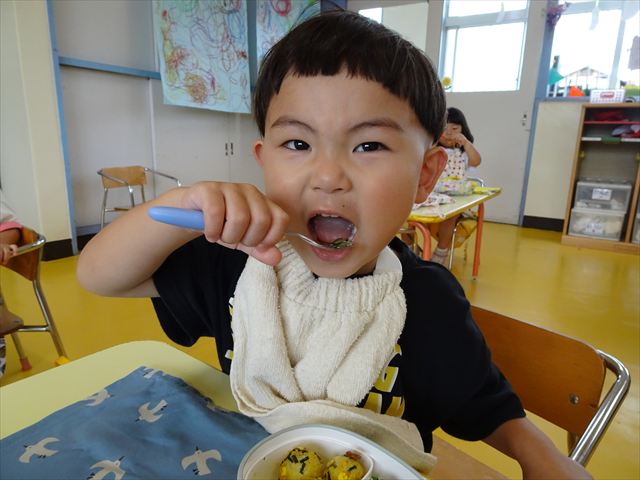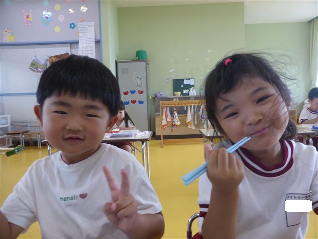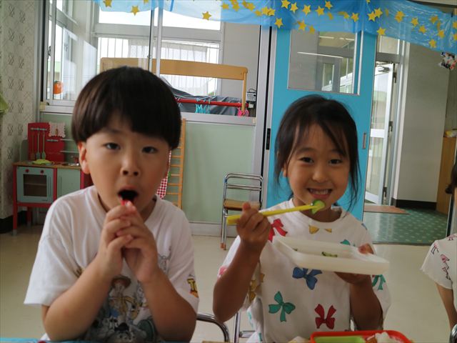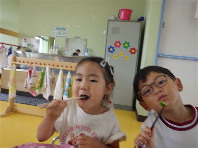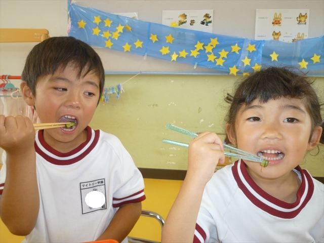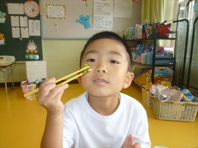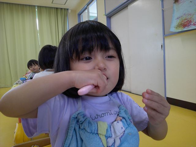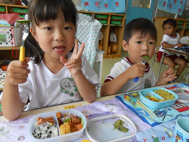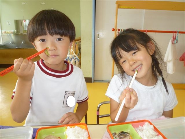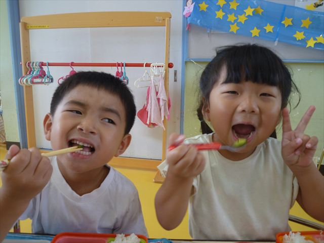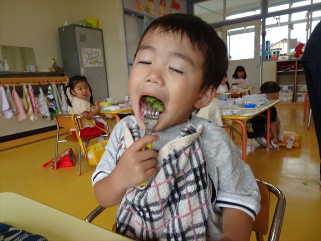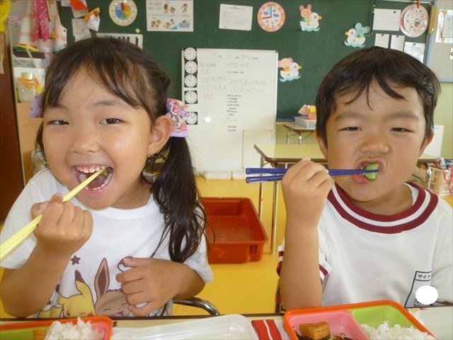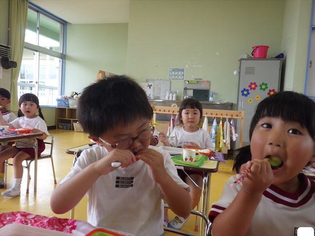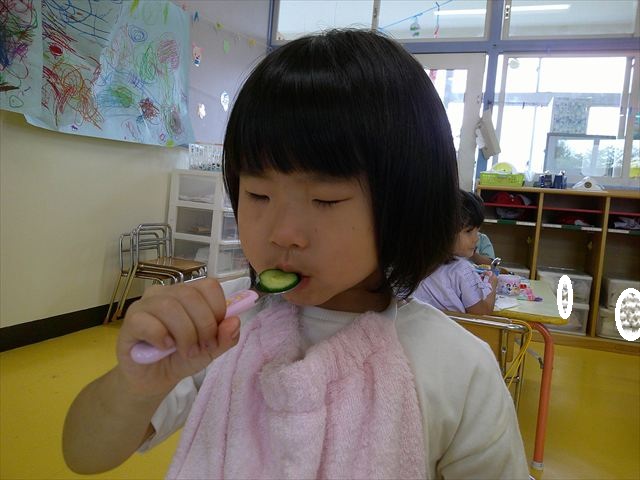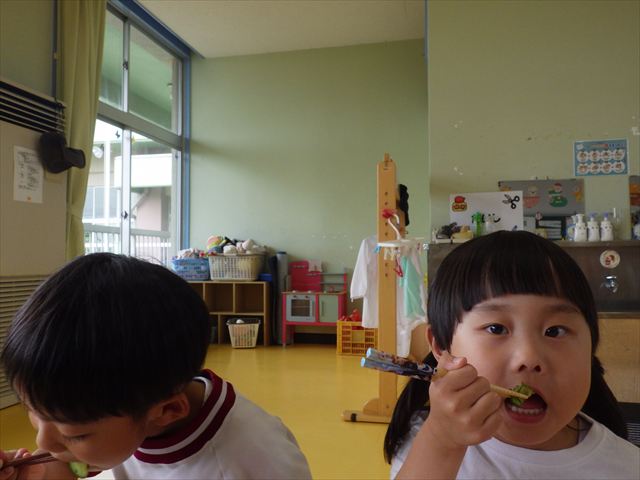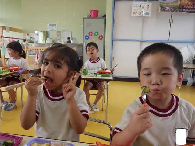 今日は園庭の畑の野菜「きゅうり、ナス、トマト、ピーマン、バジル、しそ」がたくさん実ったので収穫し、園長先生がその野菜をすべて混ぜ合わせてサラダ風漬物??を作り、全学年でいただきました。サラダオイル、塩こしょう、アジシオ、醤油等が入った独特の味の食べ物ですが、こしょうが辛いわけのに全学年、「おいしい!おいしい!」と食べてくれたようです。(^_^;) (^_^)b \(^o^)/