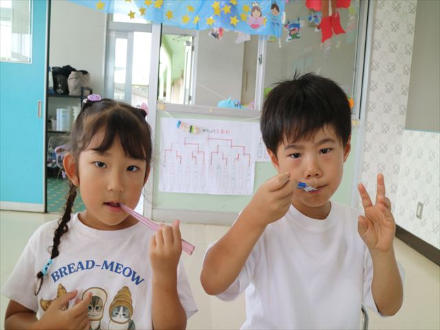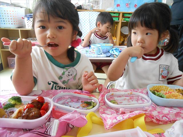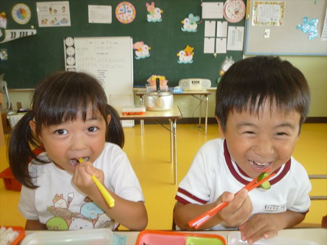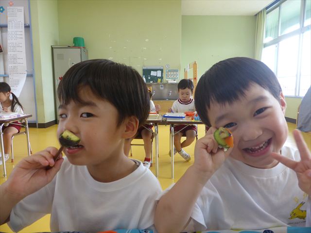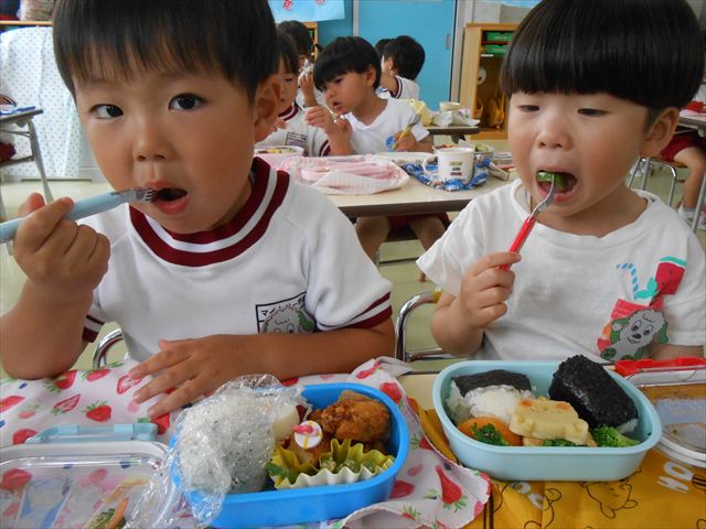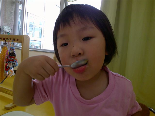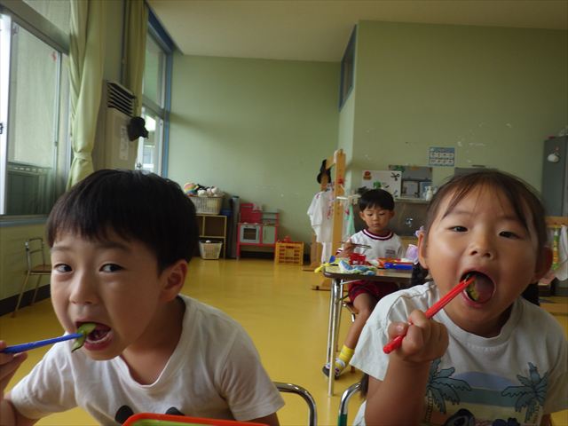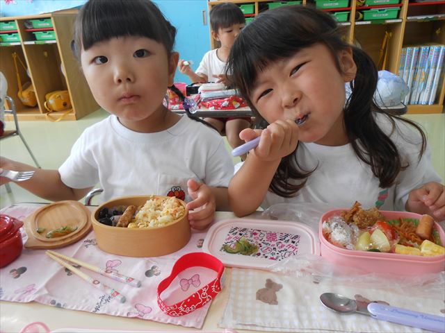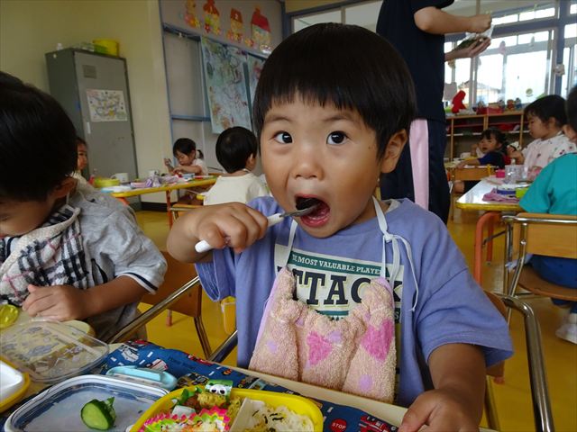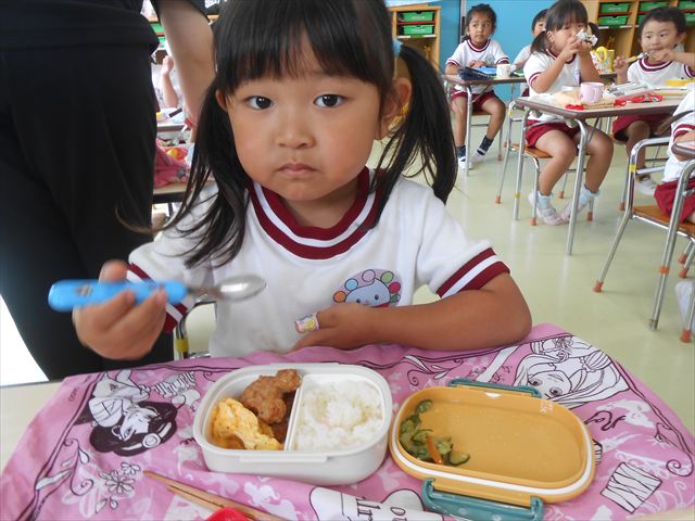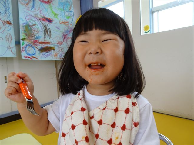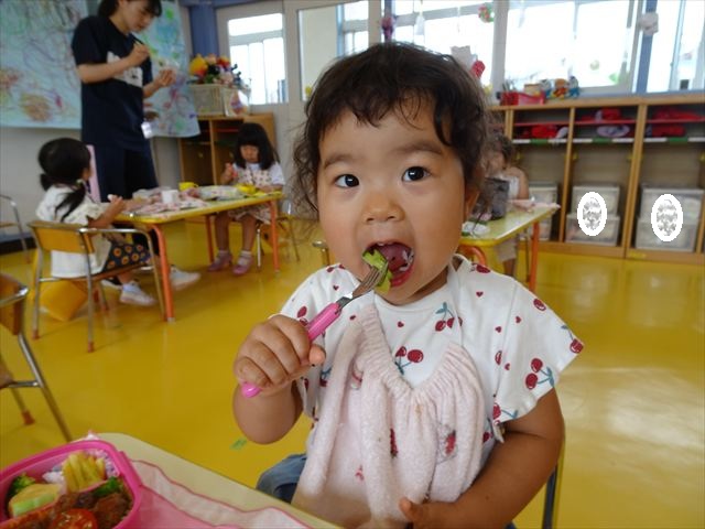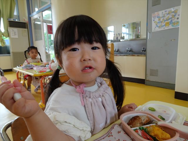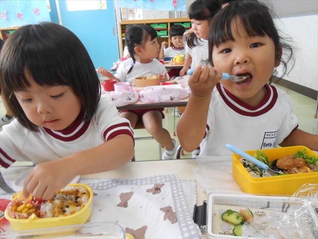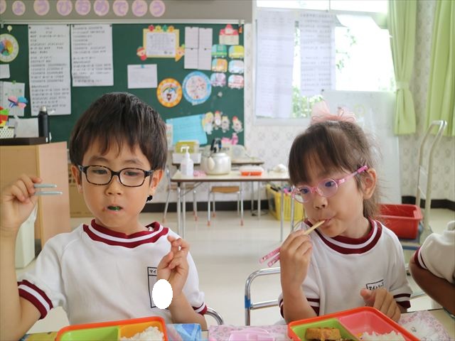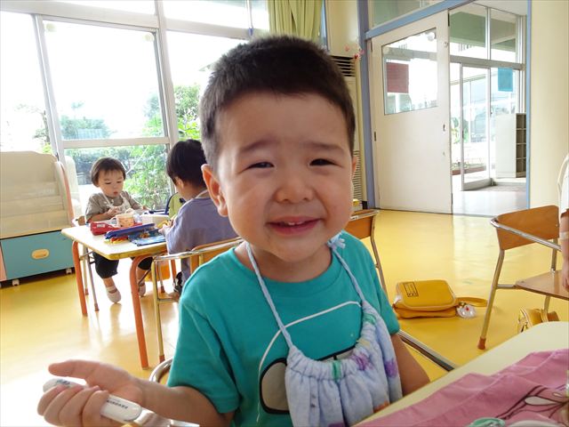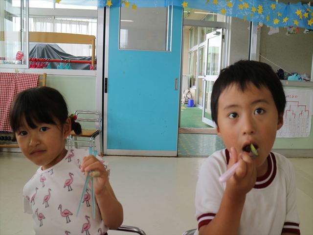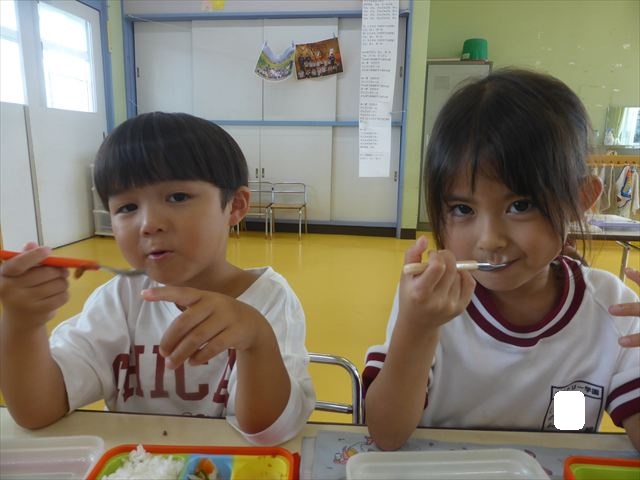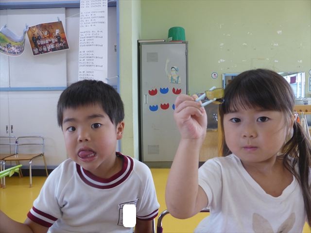 今日は園庭の畑の野菜「きゅうり、ナス、トマト、ピーマン、バジル、しそ」がたくさん実ったので収穫し、園長先生がその野菜をすべて混ぜ合わせてサラダ風漬物??を作り、全学年でいただきました。サラダオイル、塩こしょう、アジシオ、醤油等が入った独特の味の食べ物ですが、こしょうが辛いわけのに全学年、「おいしい!おいしい!」と食べてくれたようです。(^_^;) (^_^)b \(^o^)/