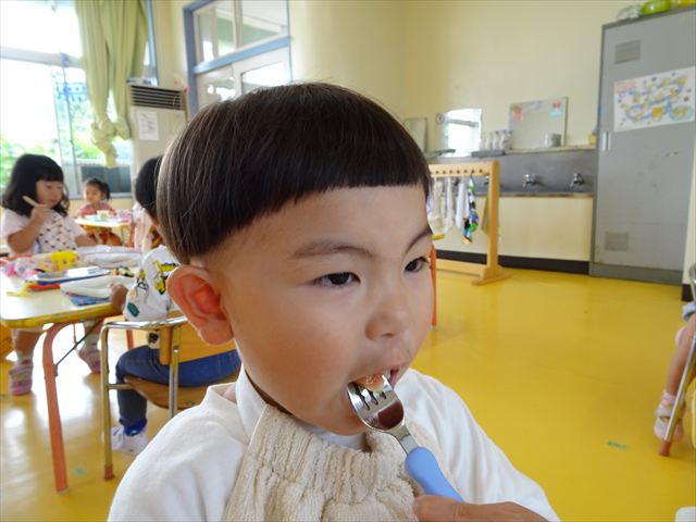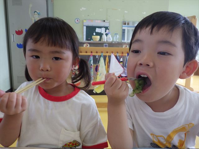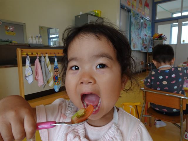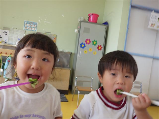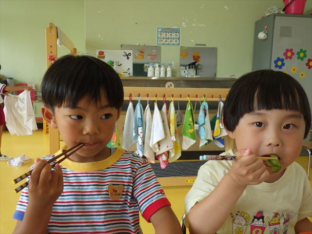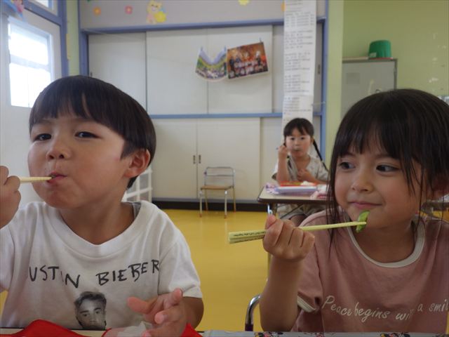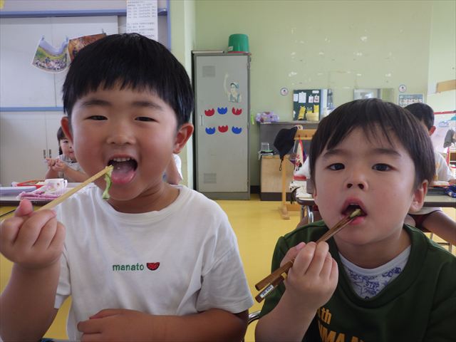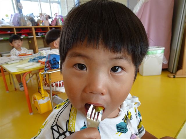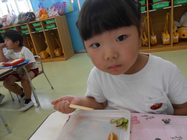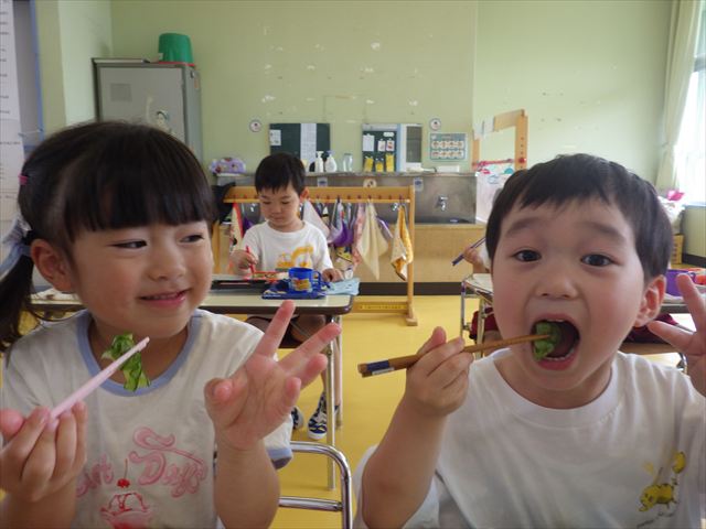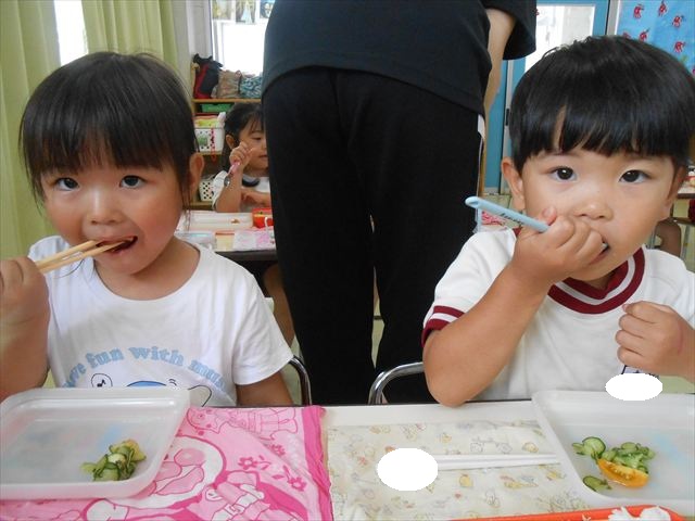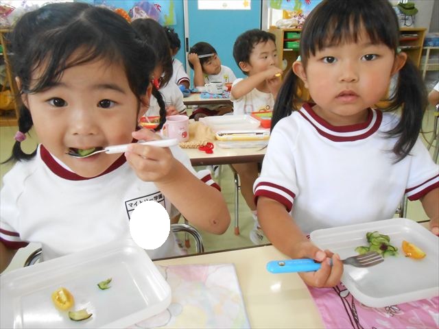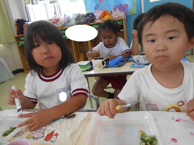 今日は、きゅうり、なす、バジル、ミニトマトが収穫できました。年少さん年中さんできゅうり、なす、バジルの塩もみを頂いて、たんぽぽさんがミニトマトを頂きました!とってもおいしかったです!