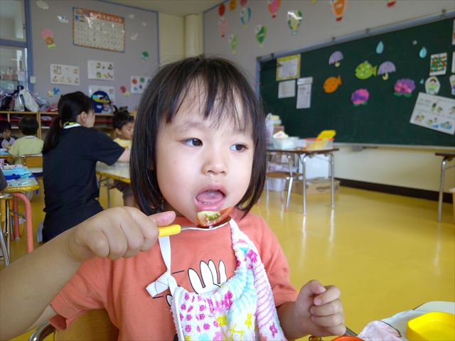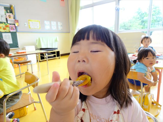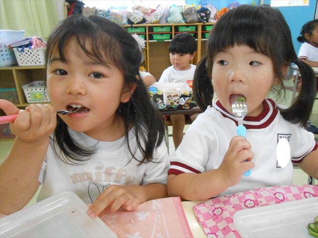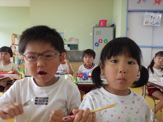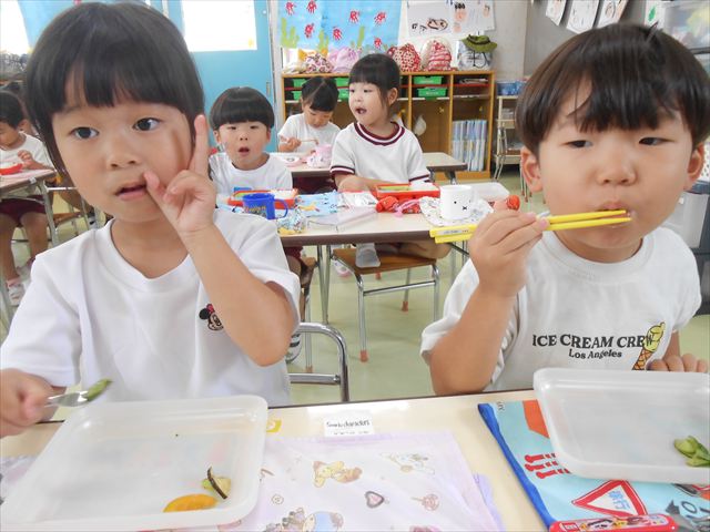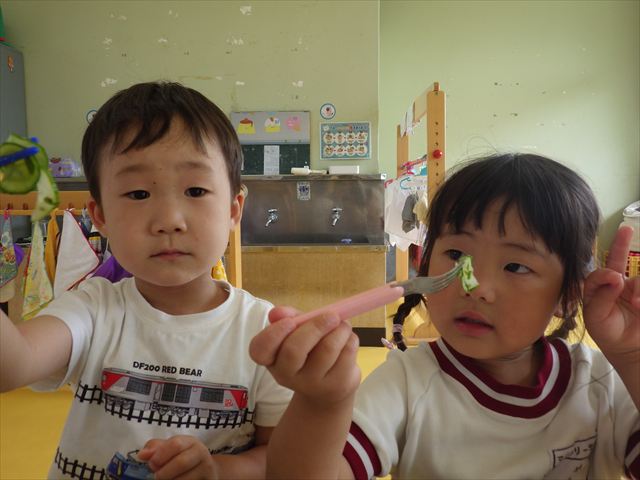 今日は、1学期最後の英語教室がありました。復習をしましtが、みんなよく覚えていて「完璧!!」と褒めてもらいました(^^)/色、食べ物、動物、10個ずつ覚えられた年少さんです。その後は、8月の月刊誌を見ました。海の生き物を見たりアイスクリームのページがあったり夏を感じることができました。午後は、主体性の時間として、自由製作遊びをしました。折り紙や色画用紙、紙皿、紙コップなどを使って年少なりに自由に表現して作ることを楽しむことができました!!