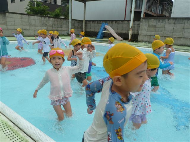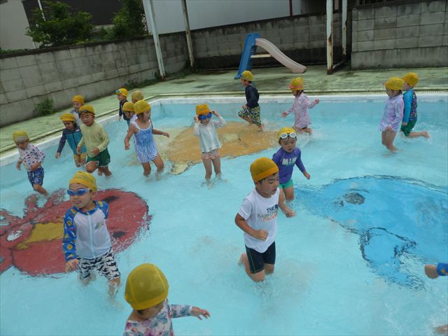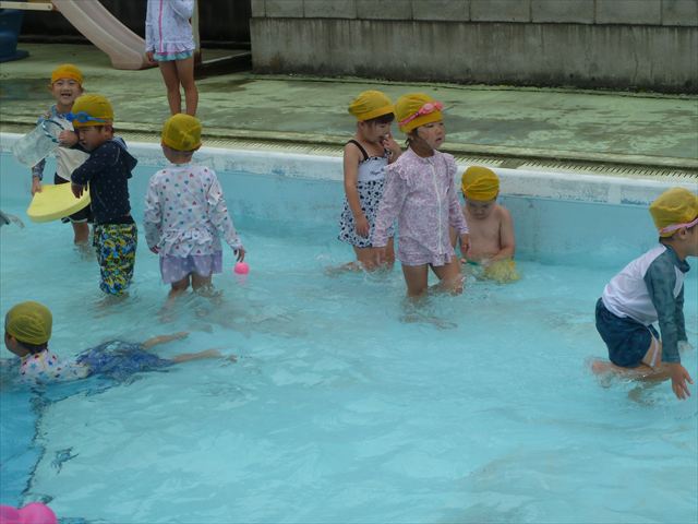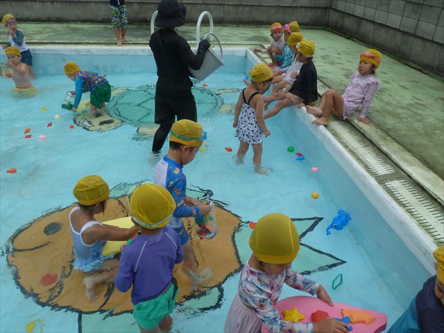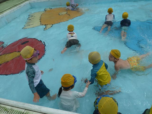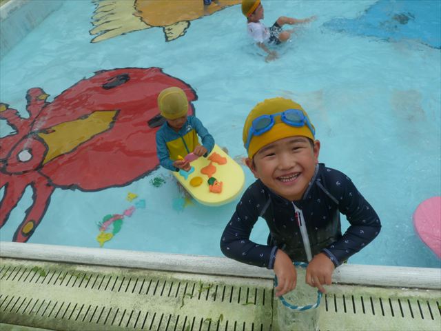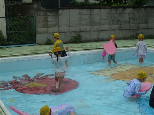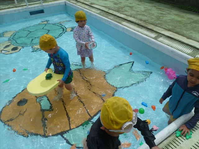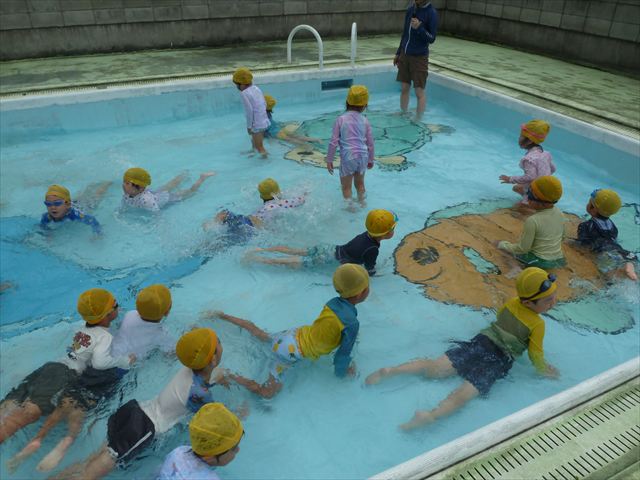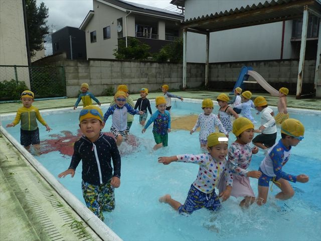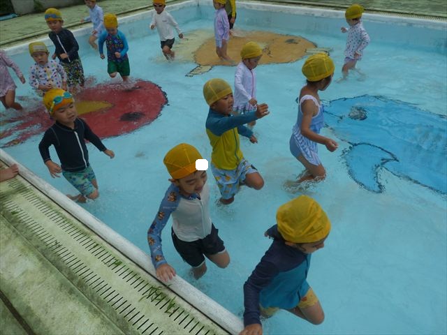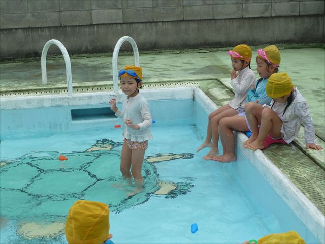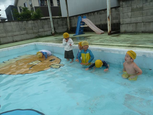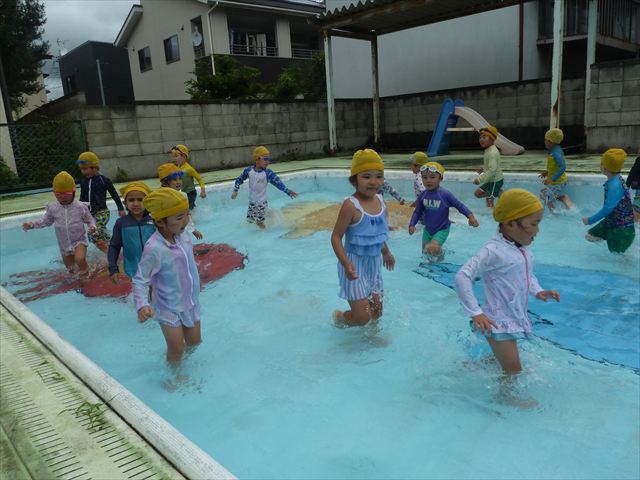 今日は年中組最後のプールに入りました。今にも雨が降ってきそうな空でしたが「プールに入りたい!」というみんなの願いが叶い無事プールに入る事が出来ました。6月のプール開きからたくさんプールに入り、水に親しみ、みんなその子なりに水に慣れてプールでの成長が見られました。プールカードや、水着の用意をありがとうございました。※夏休みの預かり保育では縦割りでプールに入ります。