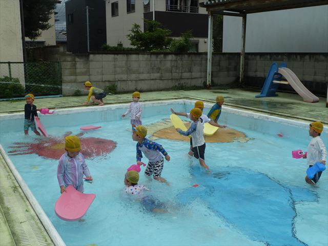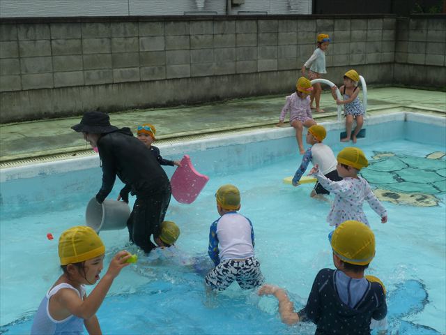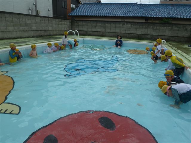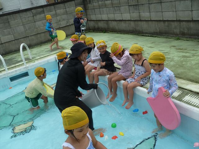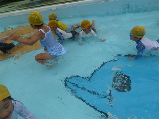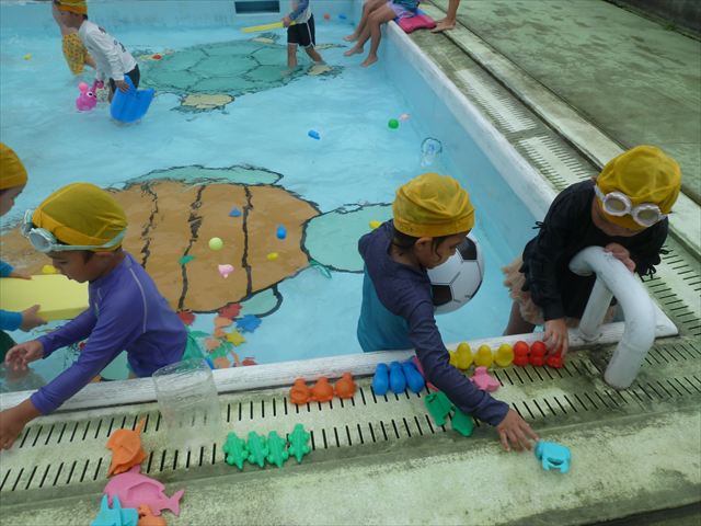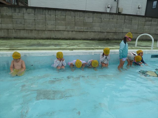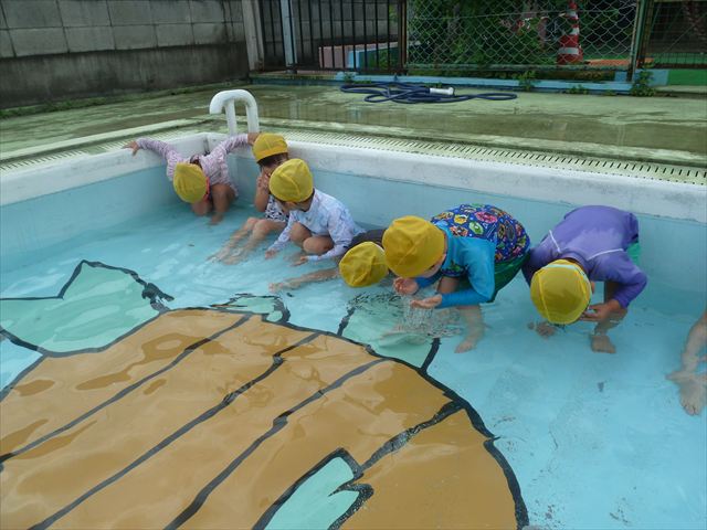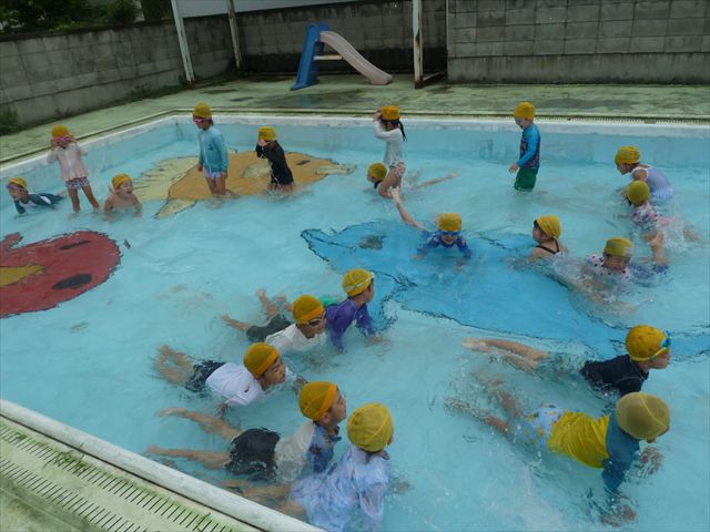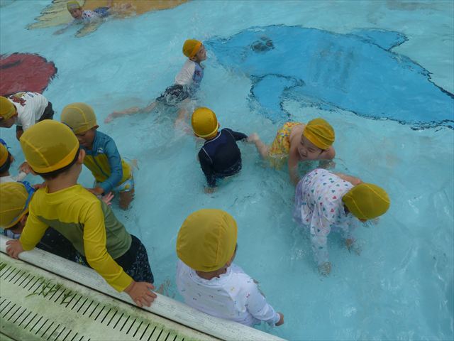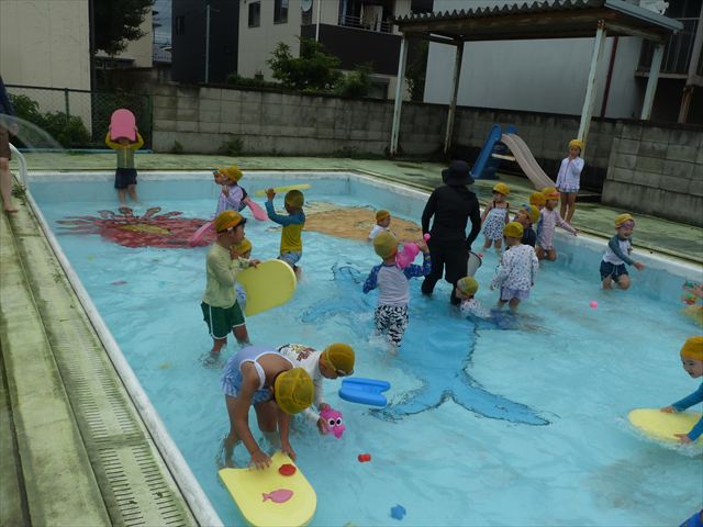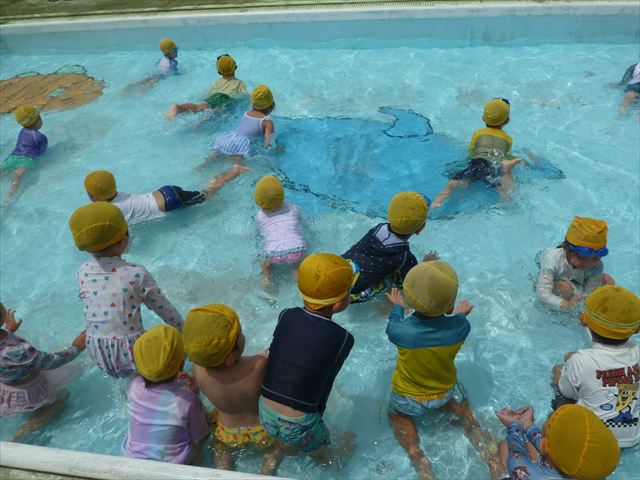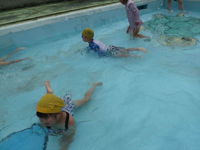 今日は年中組最後のプールに入りました。今にも雨が降ってきそうな空でしたが「プールに入りたい!」というみんなの願いが叶い無事プールに入る事が出来ました。6月のプール開きからたくさんプールに入り、水に親しみ、みんなその子なりに水に慣れてプールでの成長が見られました。プールカードや、水着の用意をありがとうございました。※夏休みの預かり保育では縦割りでプールに入ります。