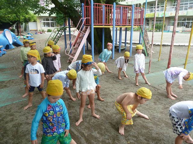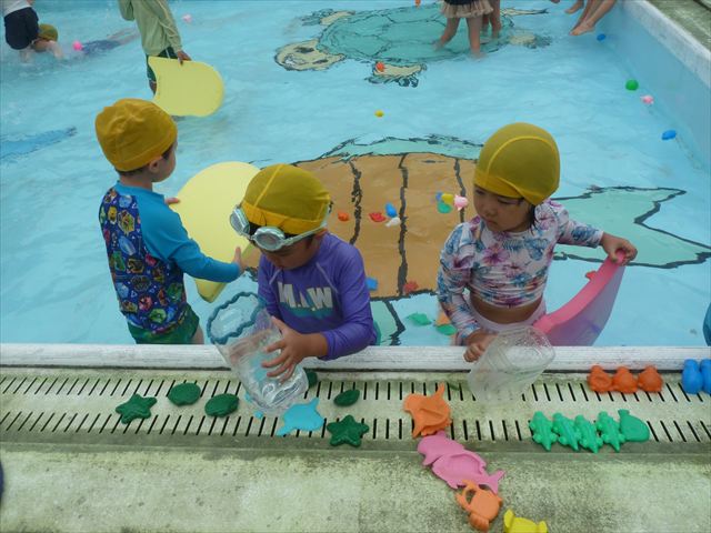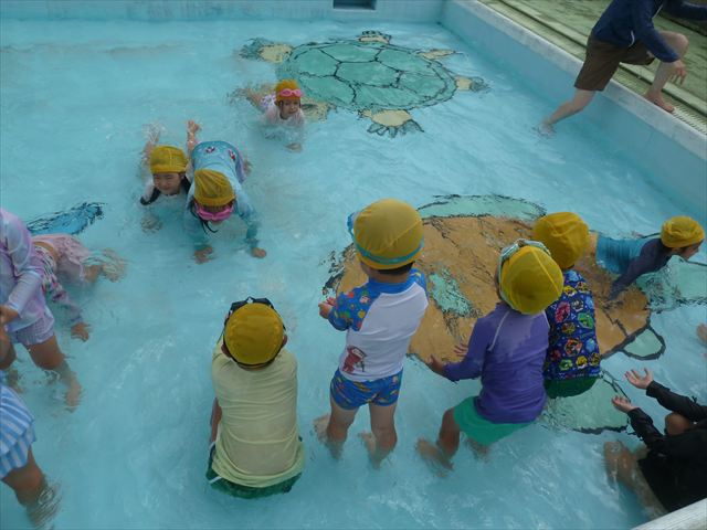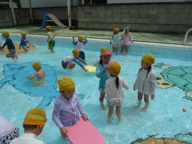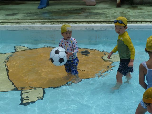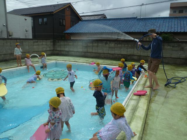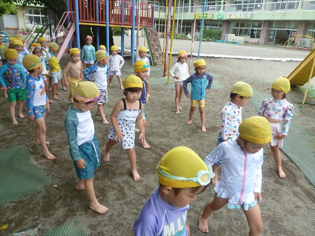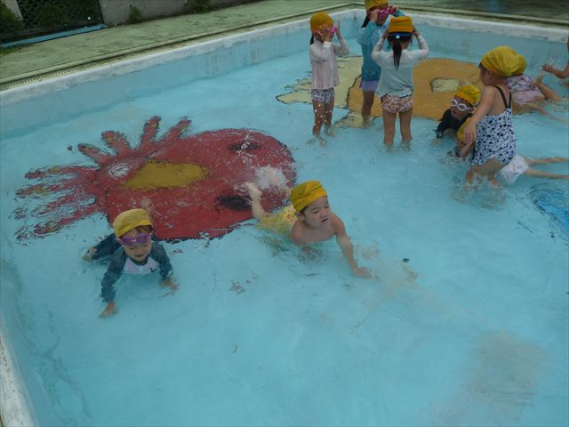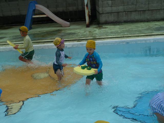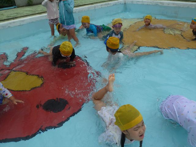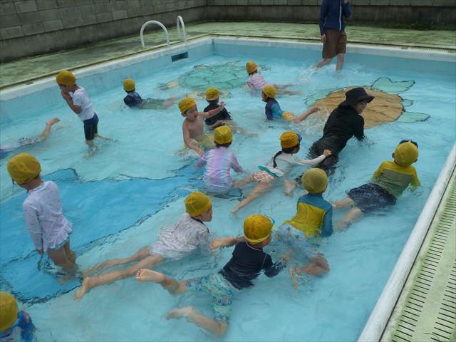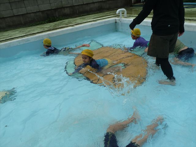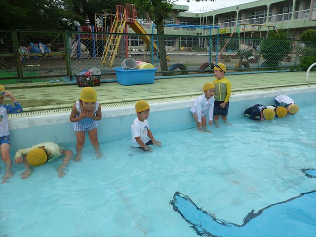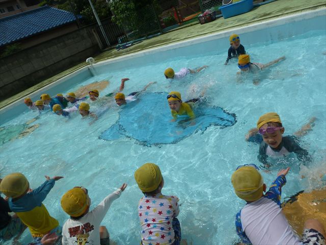 今日は年中組最後のプールに入りました。今にも雨が降ってきそうな空でしたが「プールに入りたい!」というみんなの願いが叶い無事プールに入る事が出来ました。6月のプール開きからたくさんプールに入り、水に親しみ、みんなその子なりに水に慣れてプールでの成長が見られました。プールカードや、水着の用意をありがとうございました。※夏休みの預かり保育では縦割りでプールに入ります。