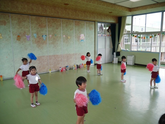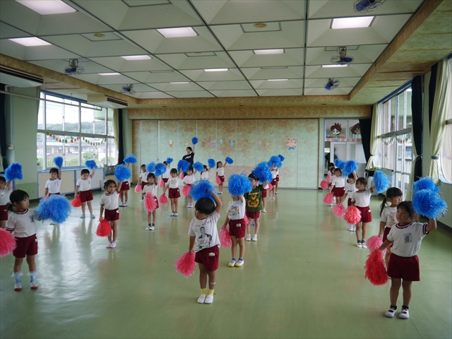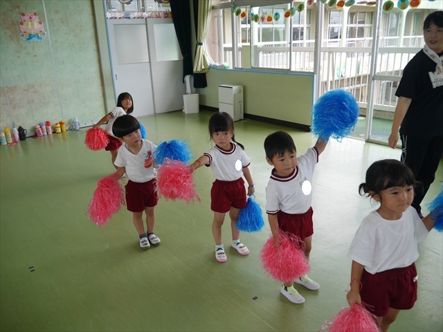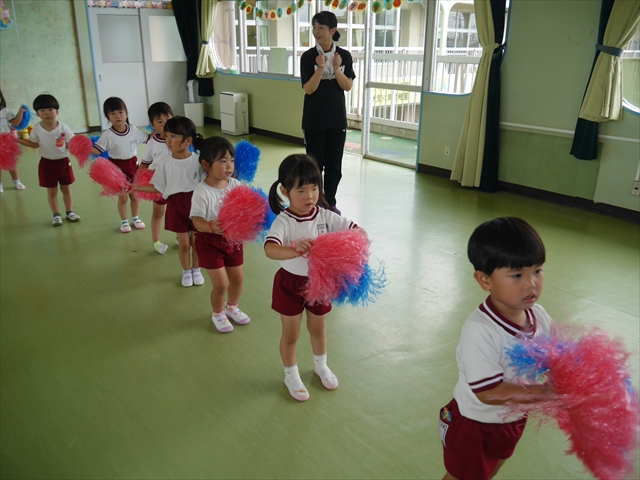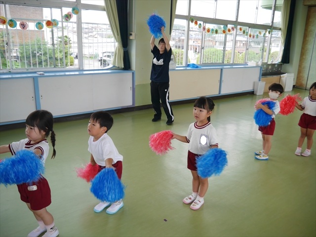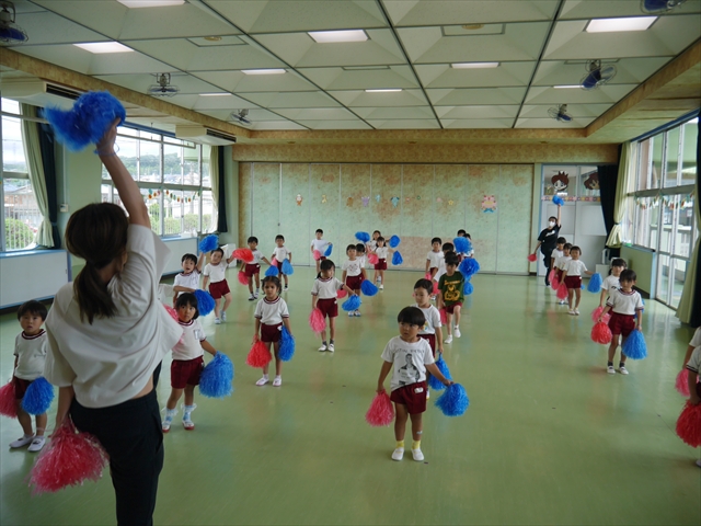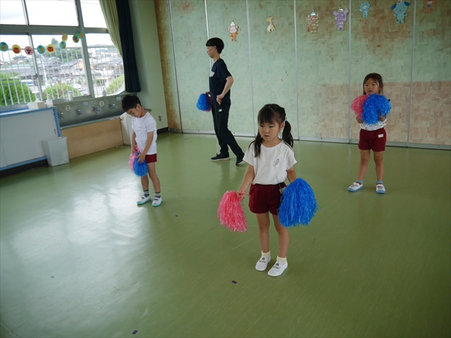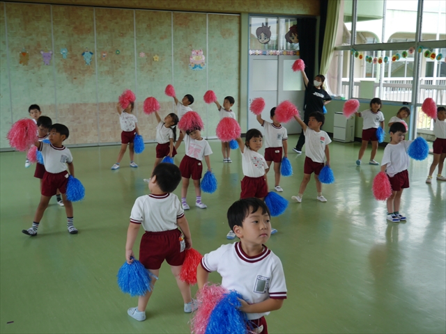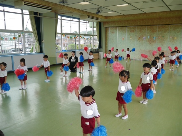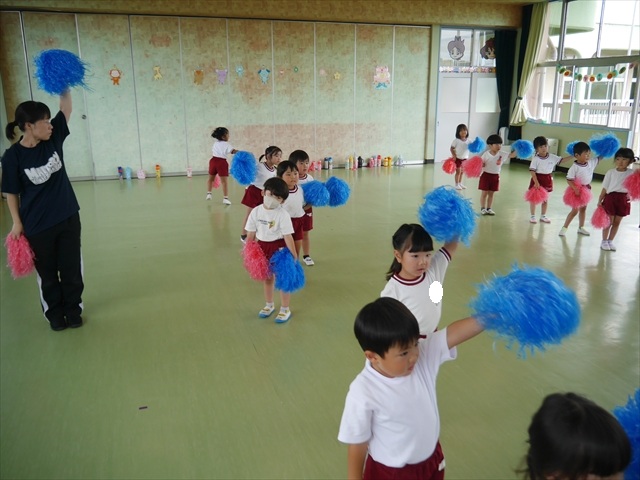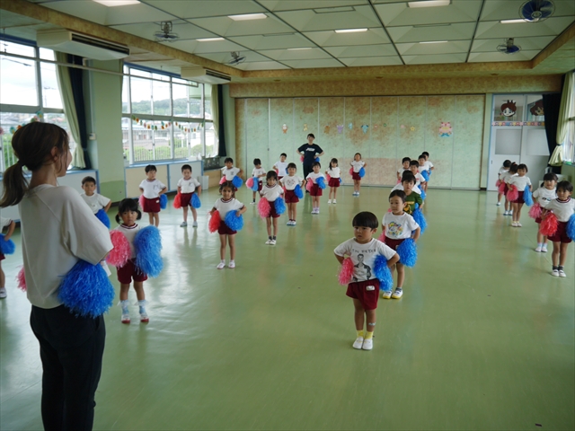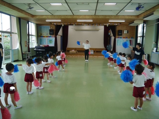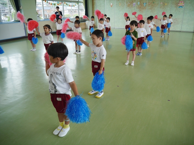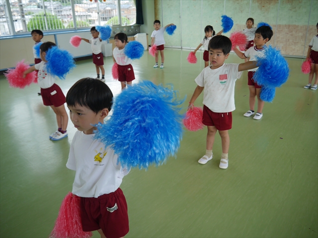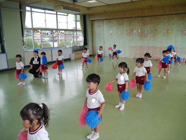 今日は、年長さん・年中さん・年少さんの「ダンス教室」を行いました!「ダンス教室」は、チアダンスの指導者である講師の島倉月弓(まゆみ)先生にお願いし、みんな頑張って取り組みました。また、年長組は公開授業も兼ねて実施しました。とにかく子どもたちは、楽しみながら様々な動きのある「ヒップホップダンス」やポンポンを持って笑顔で踊る「チアダンス」に意欲的に取り組みました。リズム感のある音楽にのって、子どもたちは元気いっぱい踊り、いい汗をかきました。みんな目一杯身体を動かし、楽しんでくれて何よりでした!体力・調整力・リズム感が身についたかな?(^_^)b \(^_^)/ 島倉先生ありがとうございました!m(_ _)m 子どもたち、次回をお楽しみに!(^_^)b ヘ(^o^)/