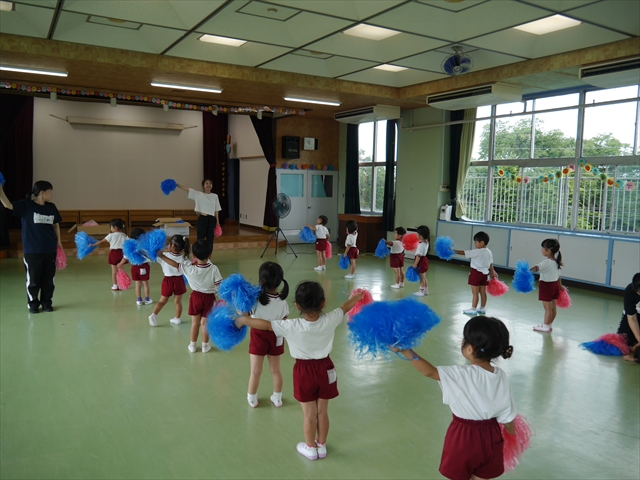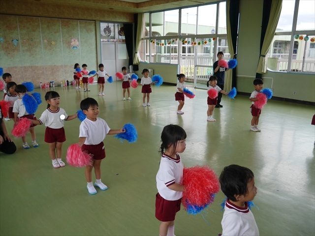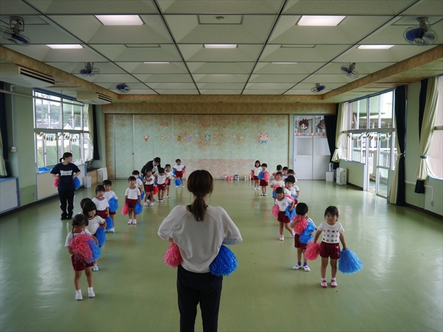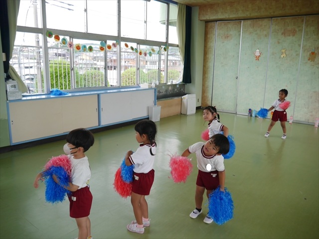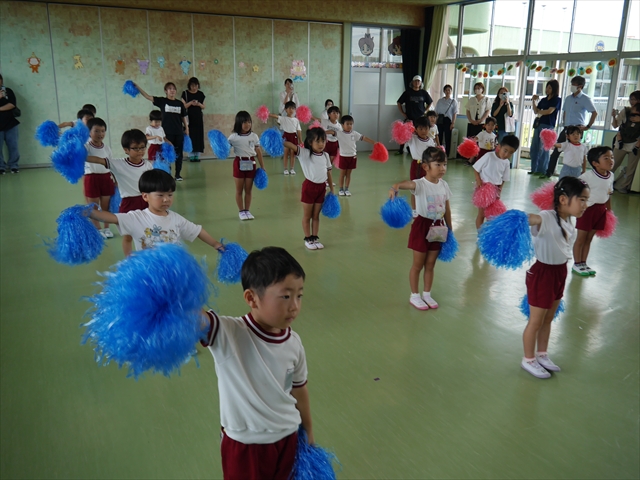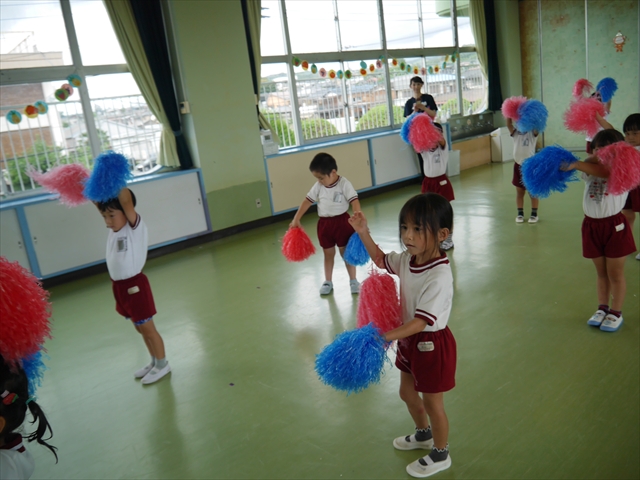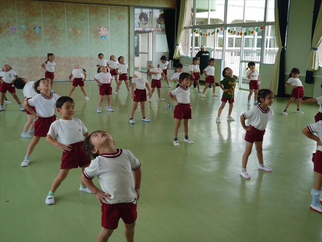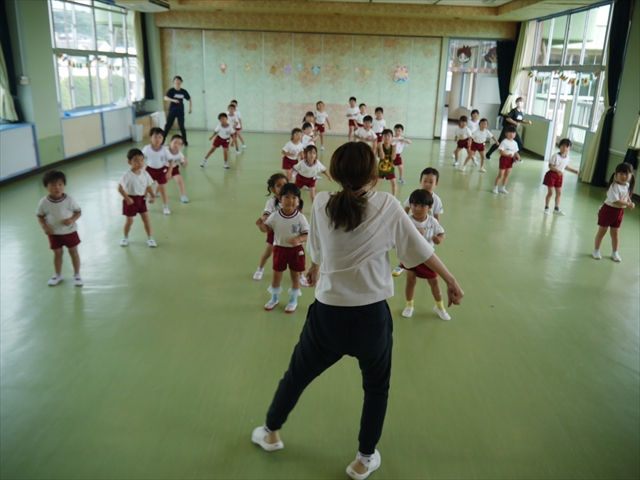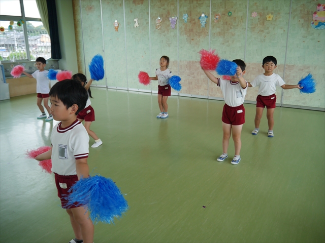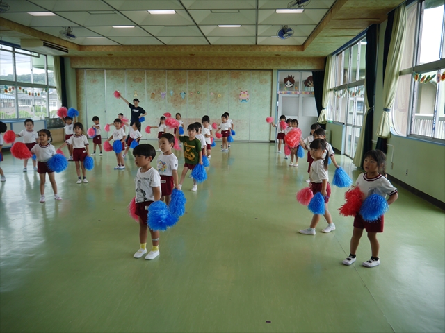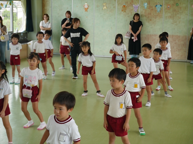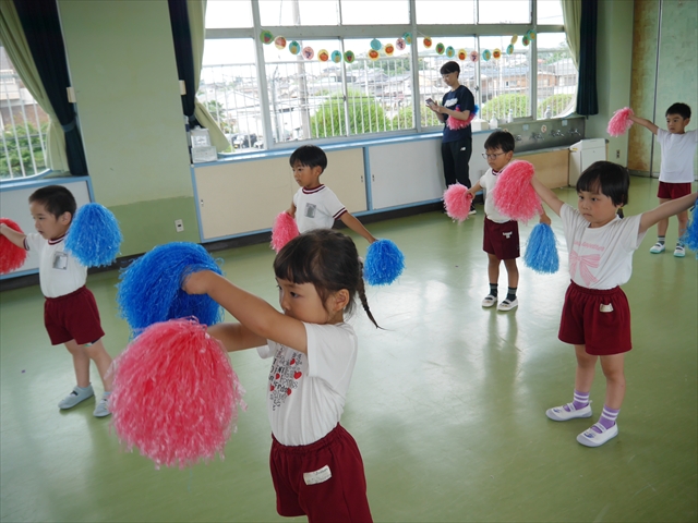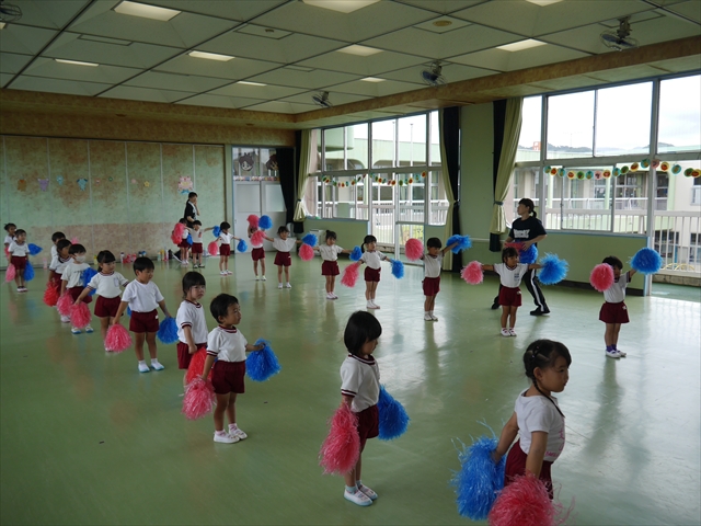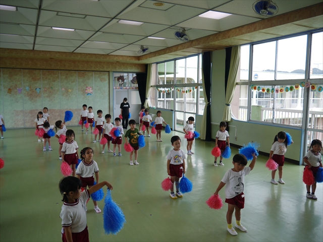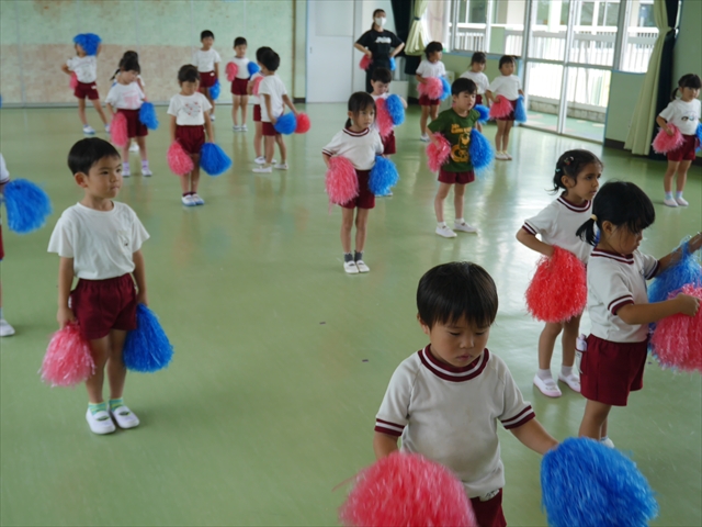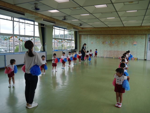 今日は、年長さん・年中さん・年少さんの「ダンス教室」を行いました!「ダンス教室」は、チアダンスの指導者である講師の島倉月弓(まゆみ)先生にお願いし、みんな頑張って取り組みました。また、年長組は公開授業も兼ねて実施しました。とにかく子どもたちは、楽しみながら様々な動きのある「ヒップホップダンス」やポンポンを持って笑顔で踊る「チアダンス」に意欲的に取り組みました。リズム感のある音楽にのって、子どもたちは元気いっぱい踊り、いい汗をかきました。みんな目一杯身体を動かし、楽しんでくれて何よりでした!体力・調整力・リズム感が身についたかな?(^_^)b \(^_^)/ 島倉先生ありがとうございました!m(_ _)m 子どもたち、次回をお楽しみに!(^_^)b ヘ(^o^)/
