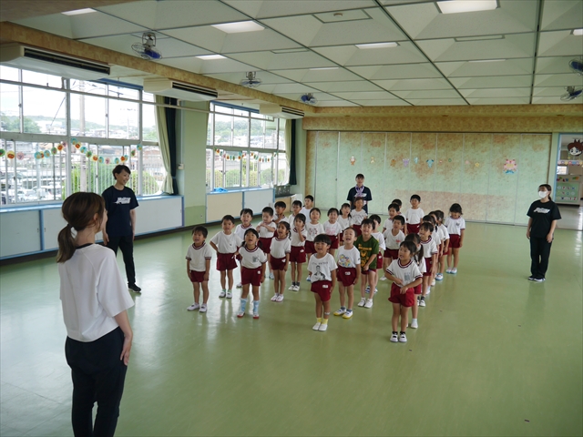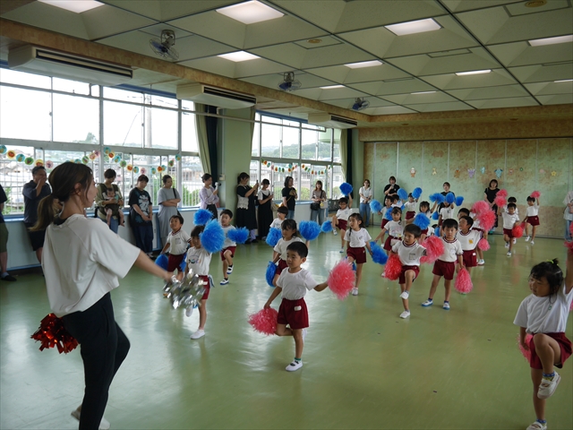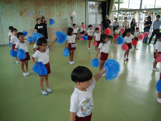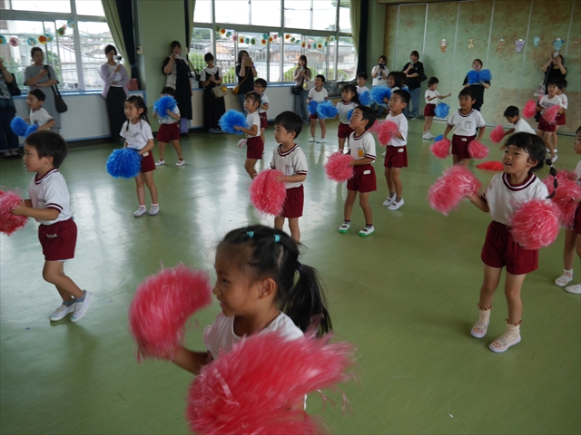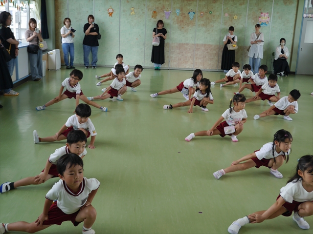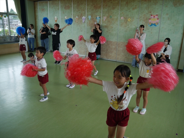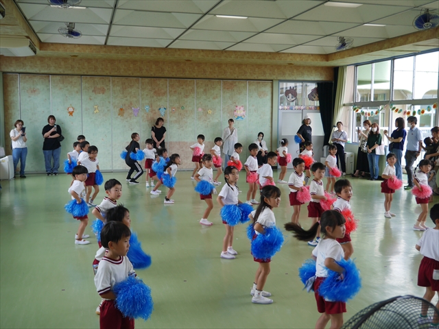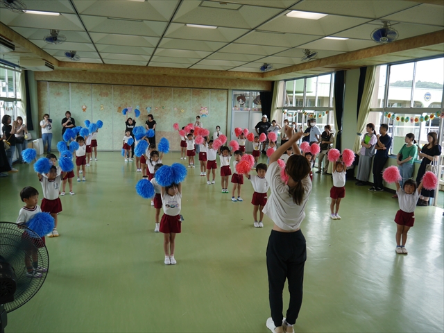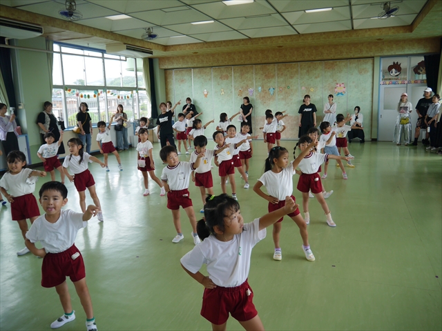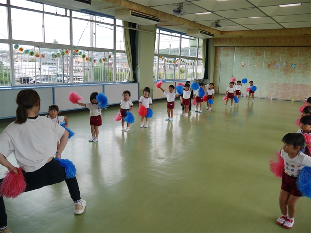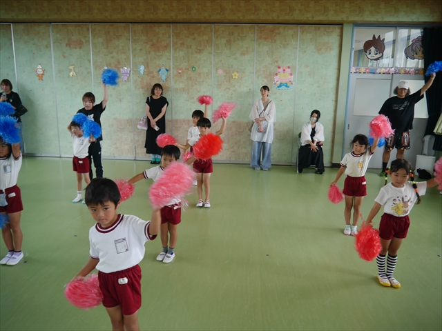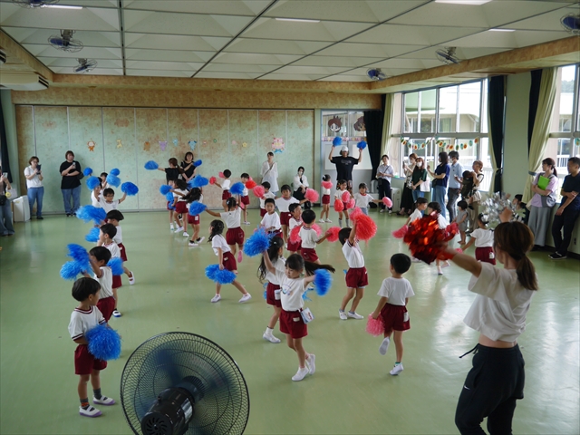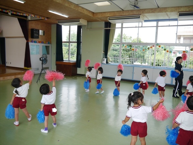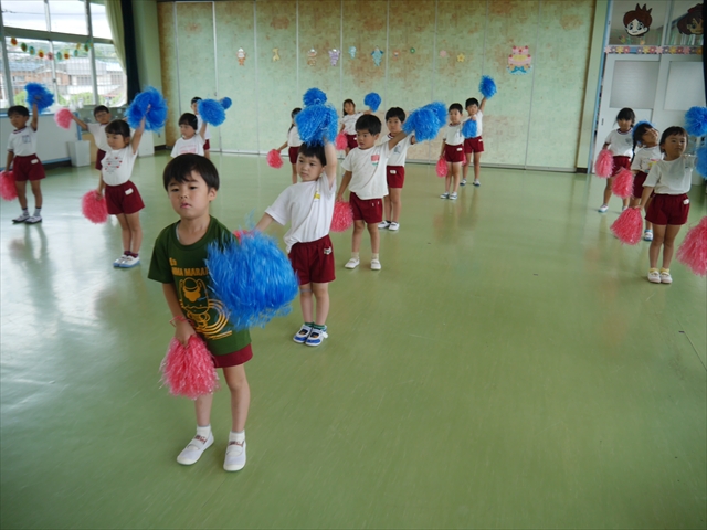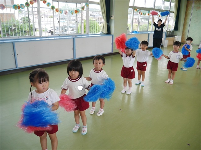 今日は、年長さん・年中さん・年少さんの「ダンス教室」を行いました!「ダンス教室」は、チアダンスの指導者である講師の島倉月弓(まゆみ)先生にお願いし、みんな頑張って取り組みました。また、年長組は公開授業も兼ねて実施しました。とにかく子どもたちは、楽しみながら様々な動きのある「ヒップホップダンス」やポンポンを持って笑顔で踊る「チアダンス」に意欲的に取り組みました。リズム感のある音楽にのって、子どもたちは元気いっぱい踊り、いい汗をかきました。みんな目一杯身体を動かし、楽しんでくれて何よりでした!体力・調整力・リズム感が身についたかな?(^_^)b \(^_^)/ 島倉先生ありがとうございました!m(_ _)m 子どもたち、次回をお楽しみに!(^_^)b ヘ(^o^)/