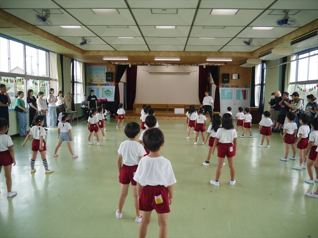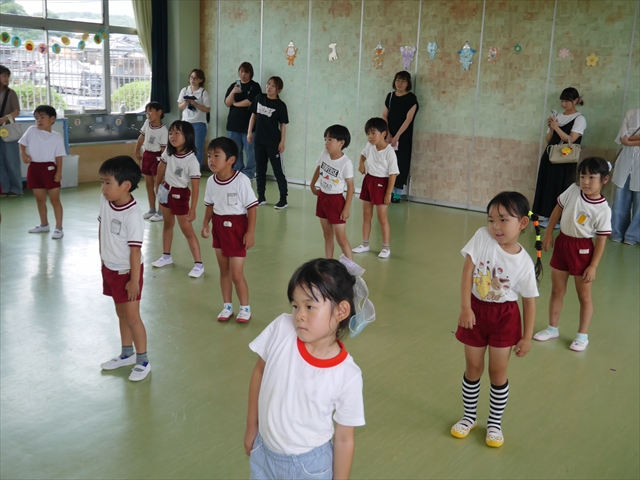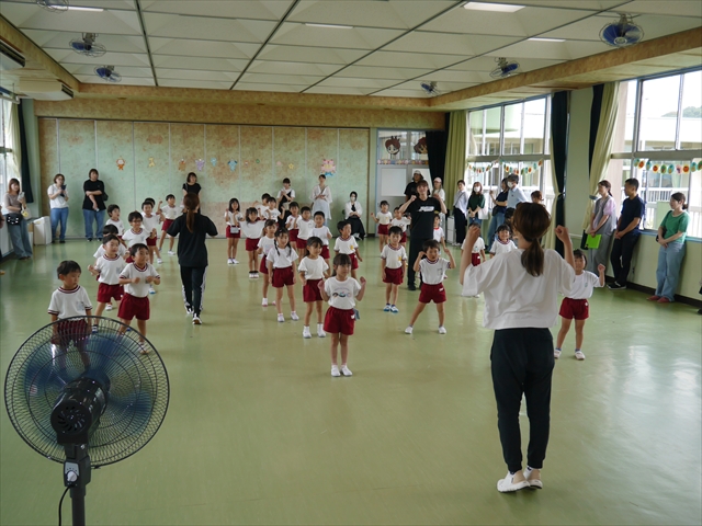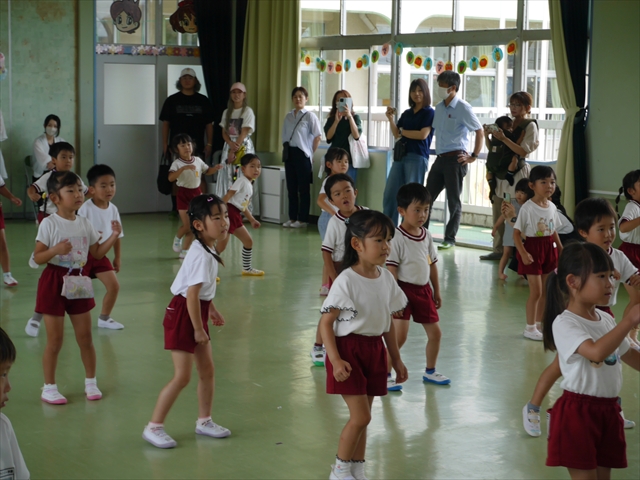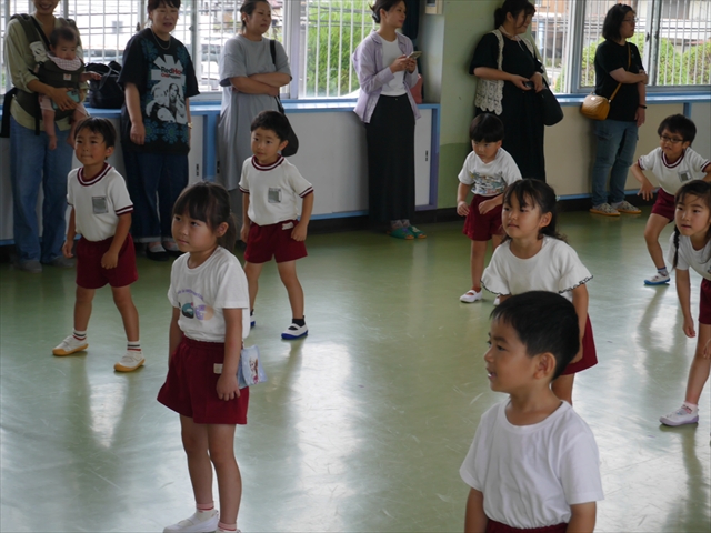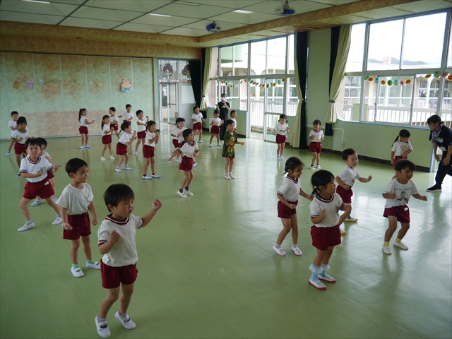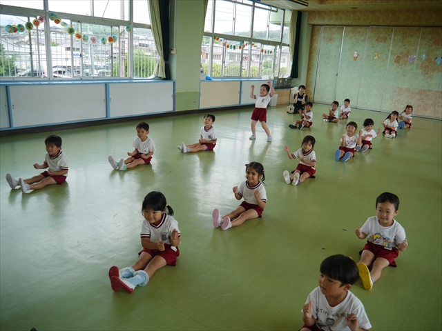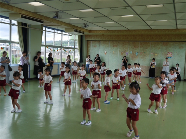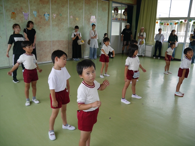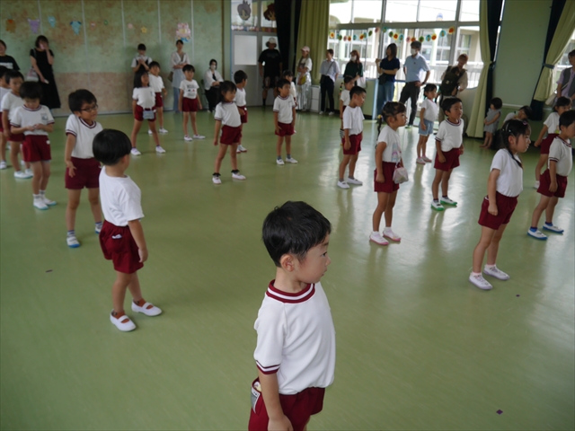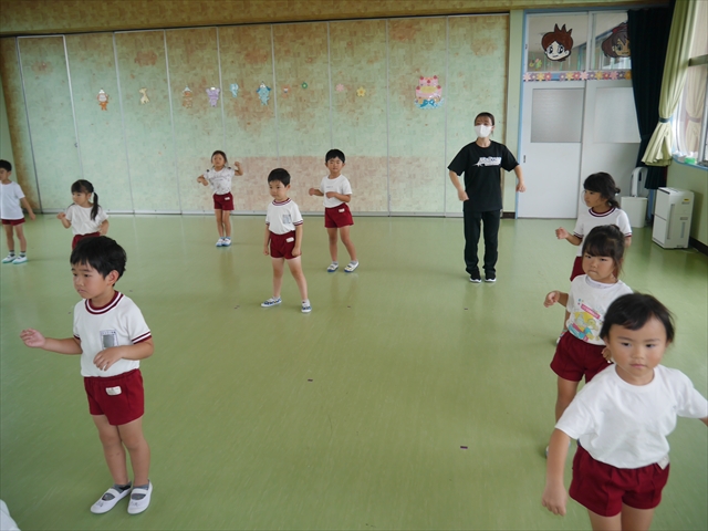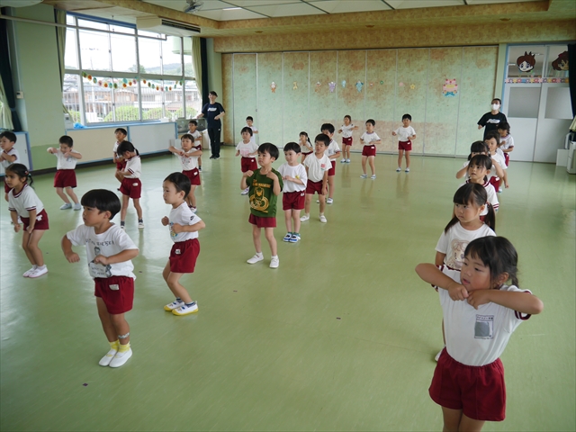 次回の第3回は、9月9日(火)に実施しますが、10:15~10:45が年少組、11:30~12:00が年中組の「公開授業」にしますので、是非ご参観いただき、保護者の皆さんも参観がてら一緒にダンスして下さい!ヘ(^o^)/ (*^_^*)