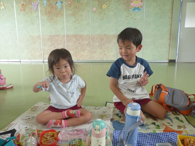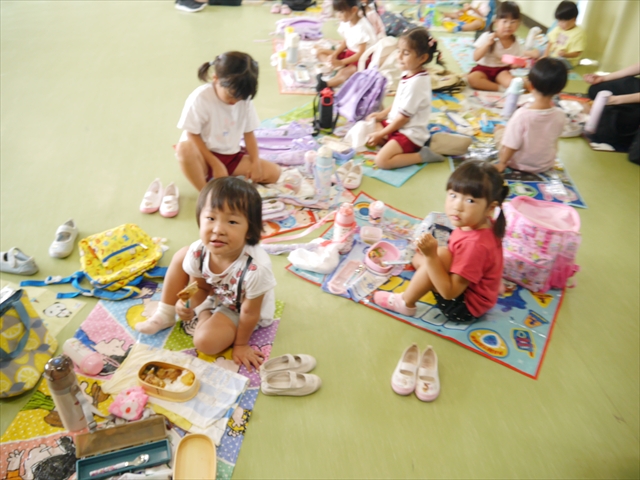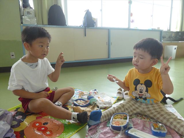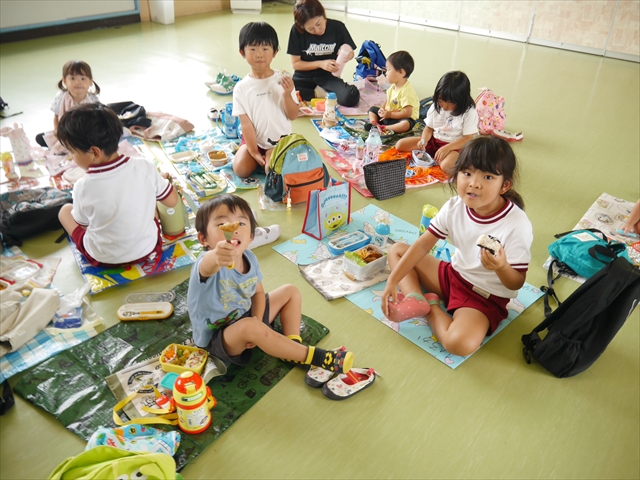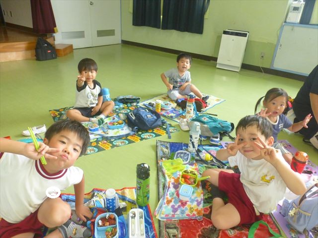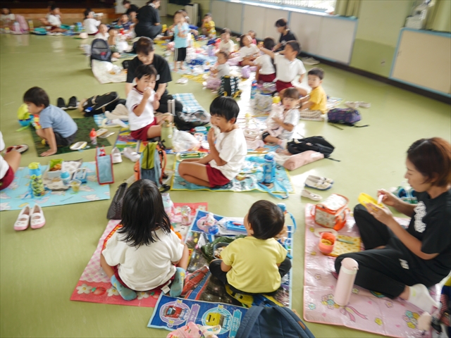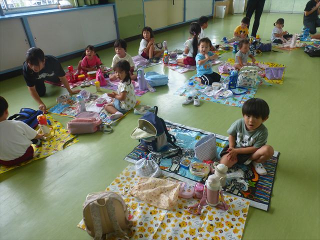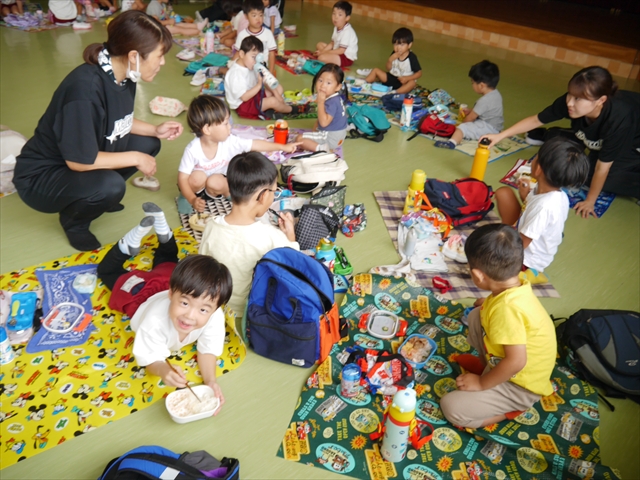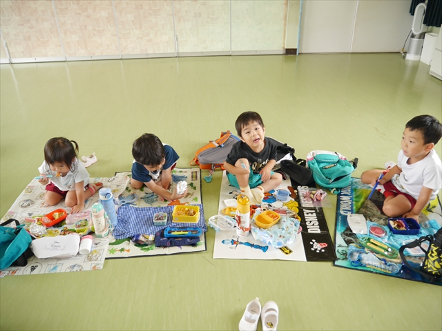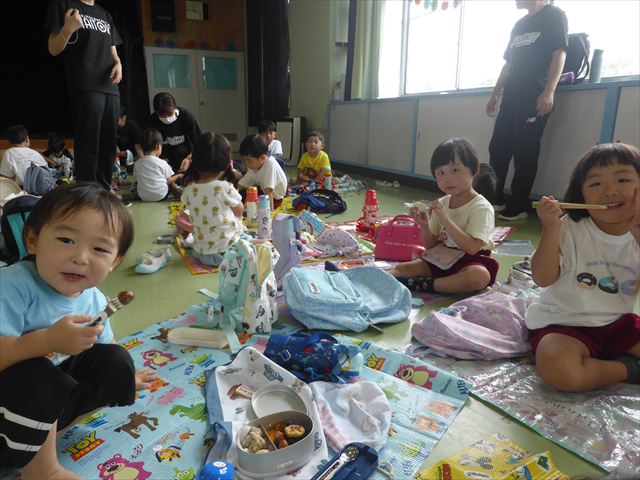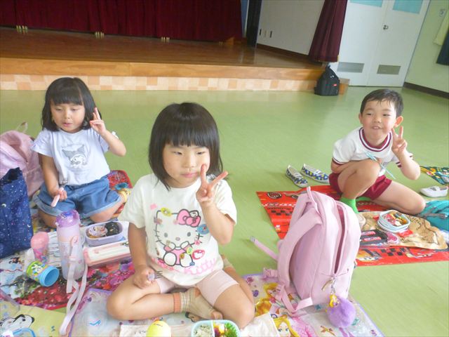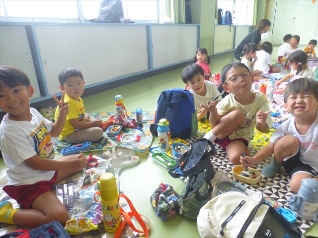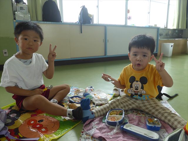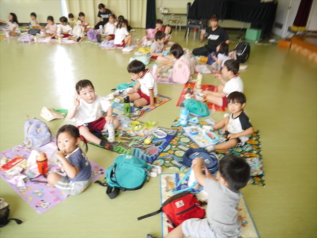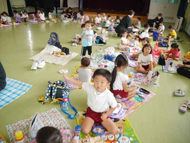 しかし、お家の人が愛情込めて作ってくれた「手作り弁当」は、ありますので、遊戯室で年中さんとたんぽぽさんの「縦割り会食」は、実施しました。みんな楽しく「美味しい、美味しい!」とパクパクいただきました!(^