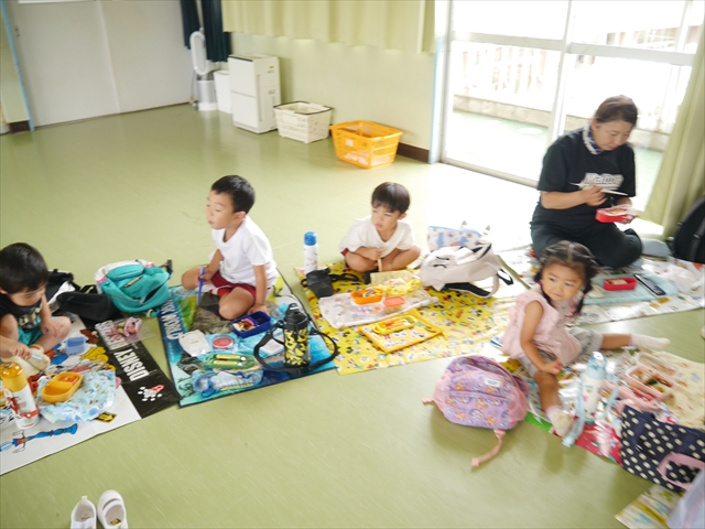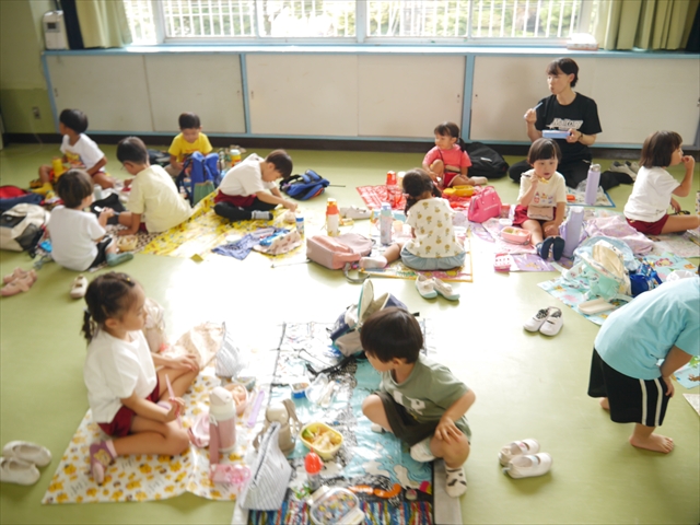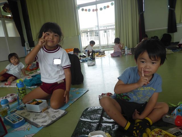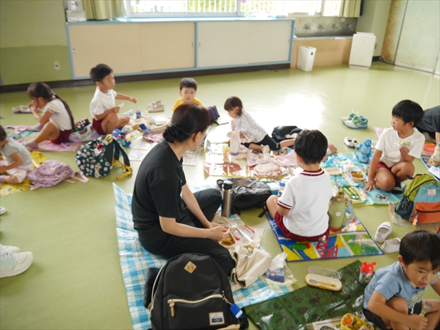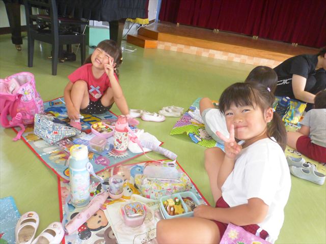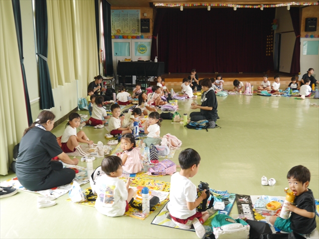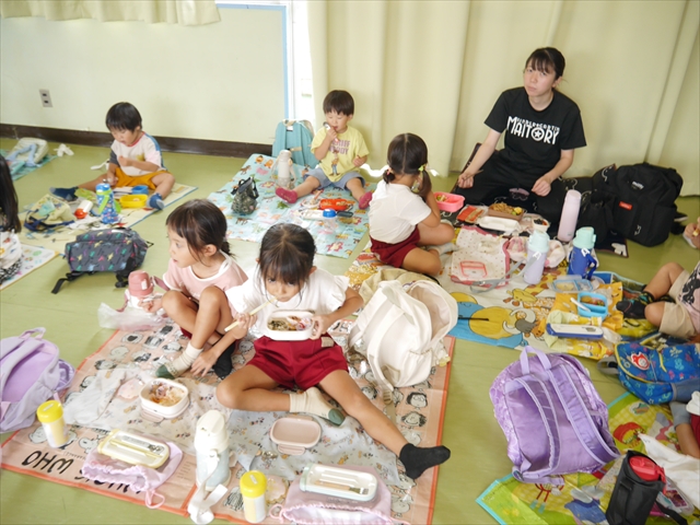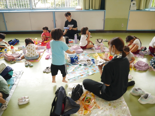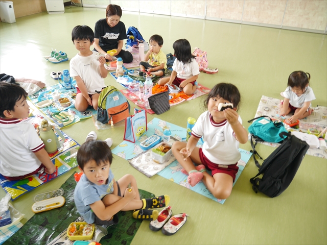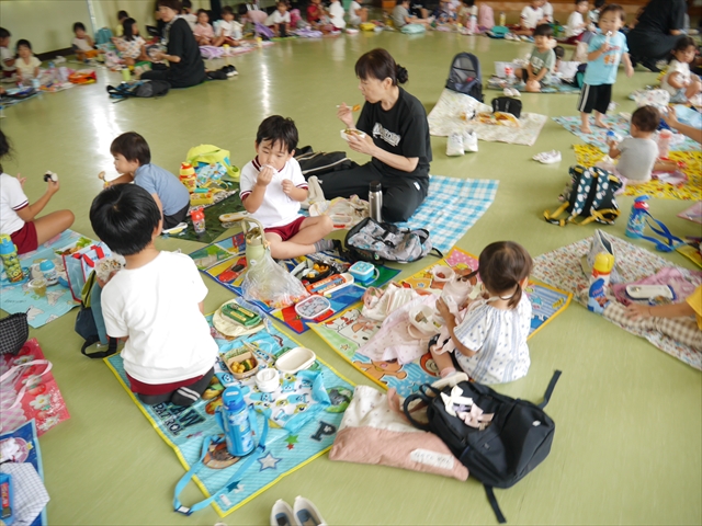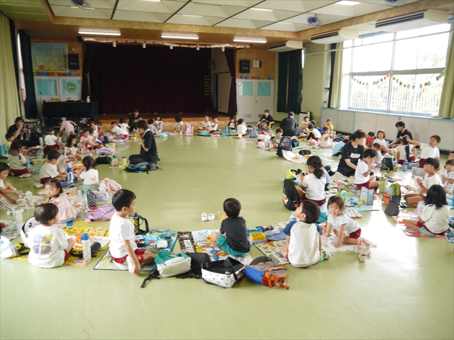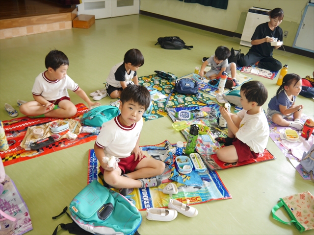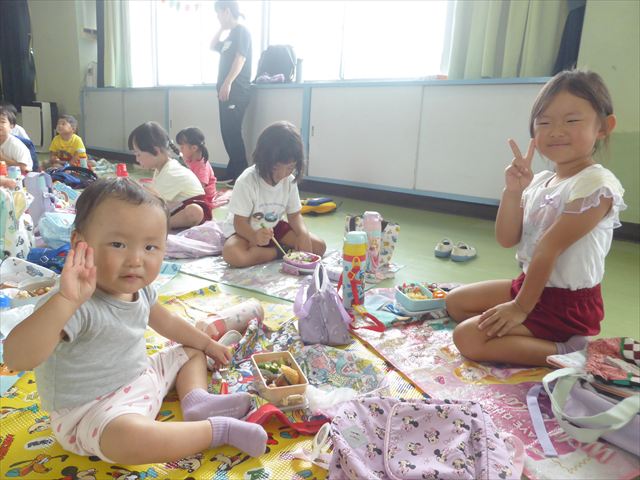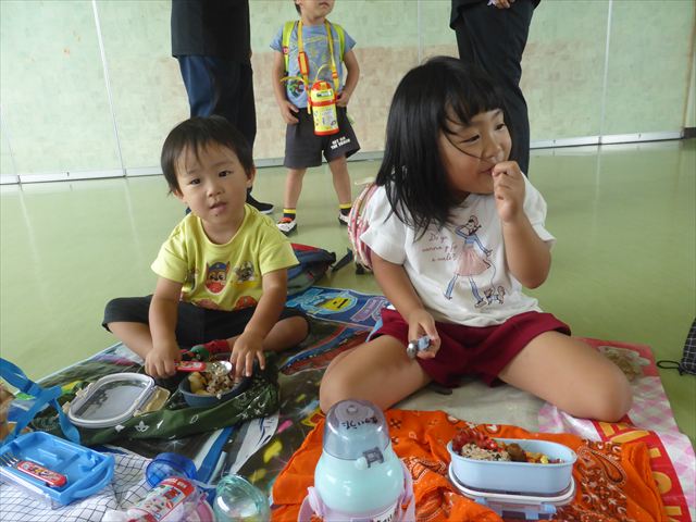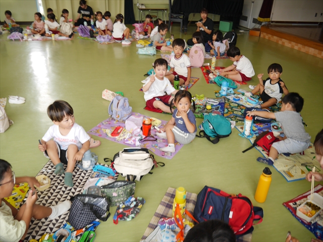 しかし、お家の人が愛情込めて作ってくれた「手作り弁当」は、ありますので、遊戯室で年中さんとたんぽぽさんの「縦割り会食」は、実施しました。みんな楽しく「美味しい、美味しい!」とパクパクいただきました!(^