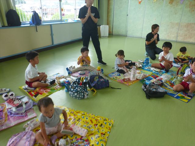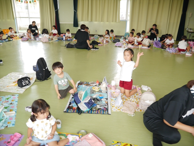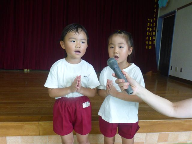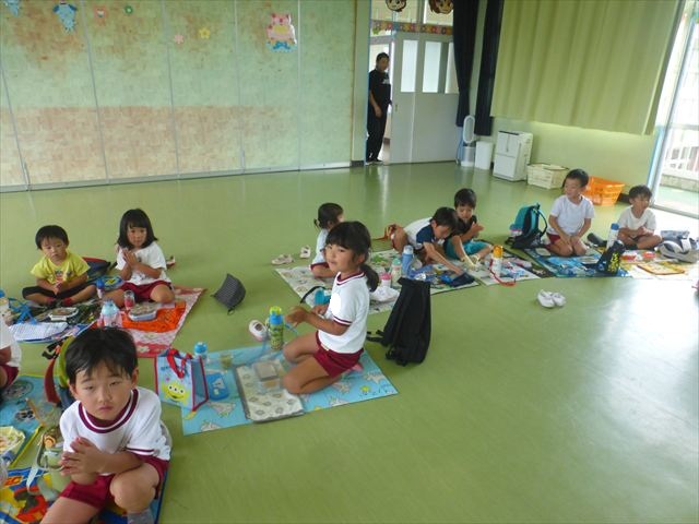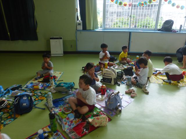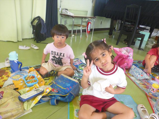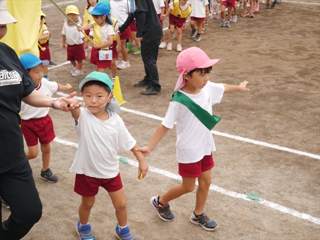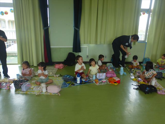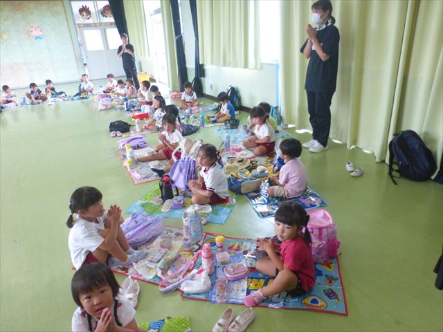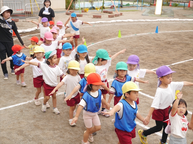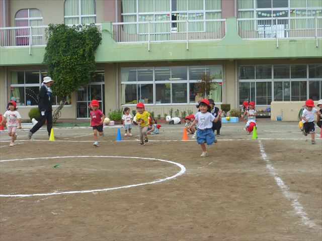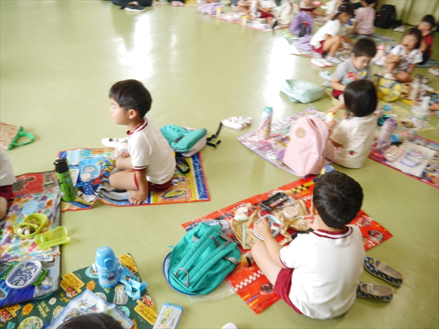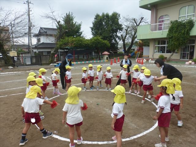 今日は「青空自然体験学習」が中止となり、子どもたちもがっかりだったのですが、雨も上がったので、運動会の練習をしました。「開会式入場行進」「やんちゃ怪獣どっかーん体操」「縦割りリレー」の練習をみんな頑張りました。体操の前に園長先生から「みんなとんぼ捕りが中止となり残念でした。でも、みんながかわいそうなので来週は晴れそうだから、来週全学年ともとんぼ捕りに出かけます!楽しみにしていて下さい。」と話がありました。みんな大喜びでした。晴れるといいね!ヘ(^o^)/ (^_^)v