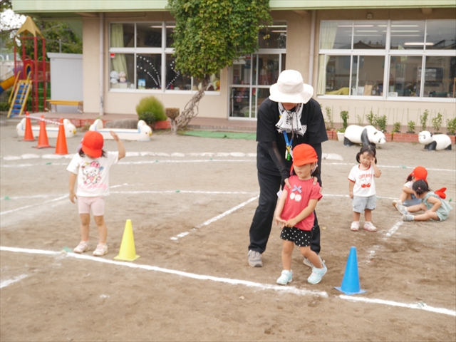 親子競技の「台風の目」の練習をしました。台風のようにコーンを回る練習をしました!今日はクラスの担任が保護者役をしてやってみました。どう走れば小さくコーンを回れるのかなど、子どもたちルールやコツを伝えましたので、お子さんに聞いてみて作戦会議をしてみてください(^O^)