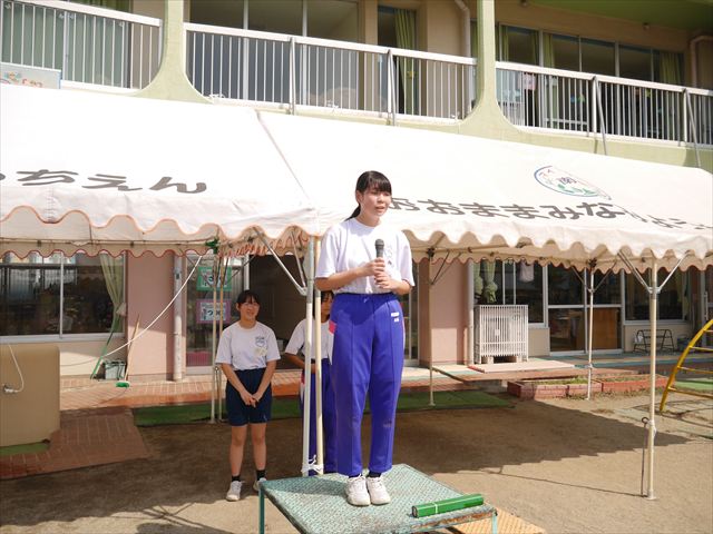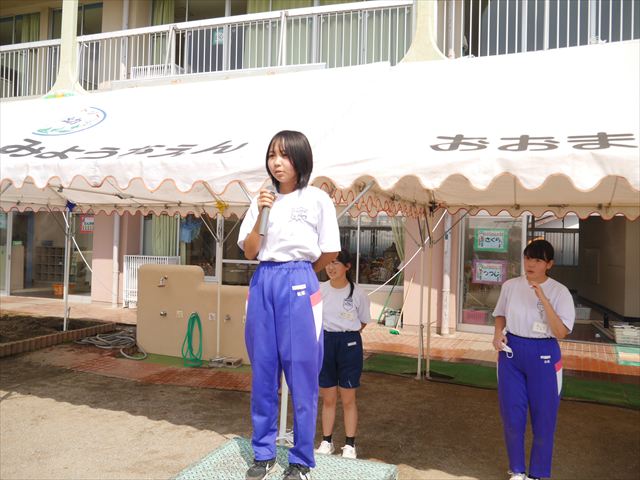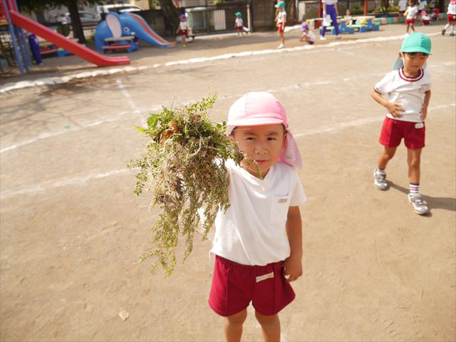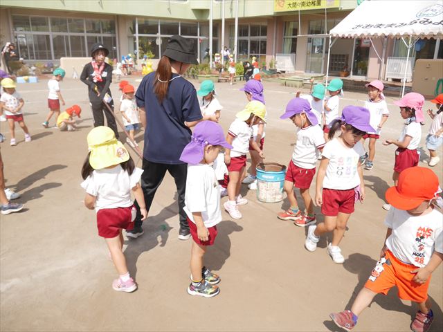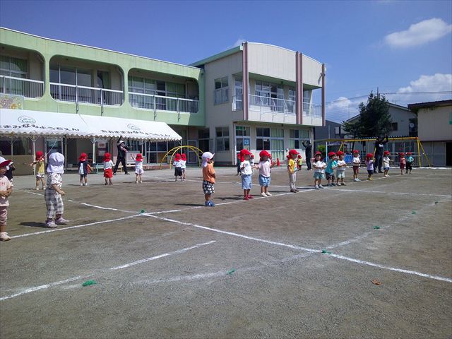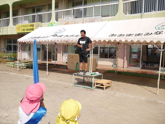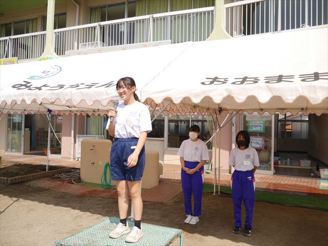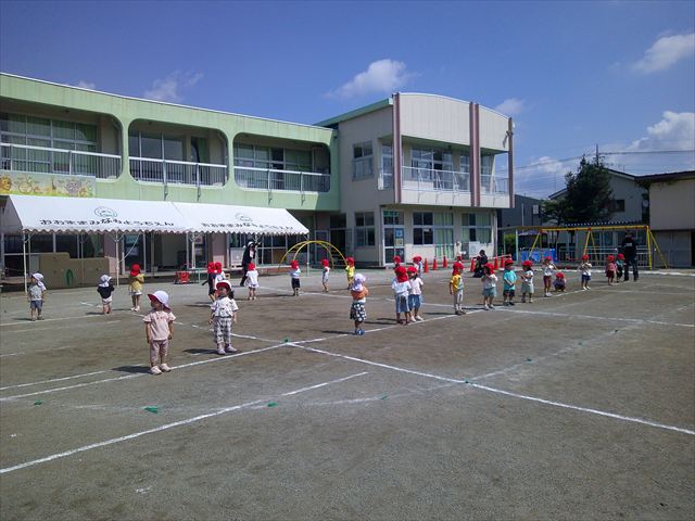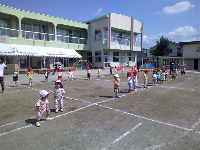 今日も朝から猛暑で、園庭の日陰でも34度もありました。は朝礼を行い、大間々東中学校職場体験学習を行う2年生の生徒2名を紹介しました。2人とも大間々南幼稚園を卒園した先輩たちです。みんな仲良くして下さい!(^