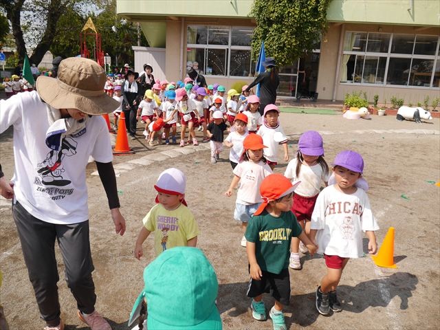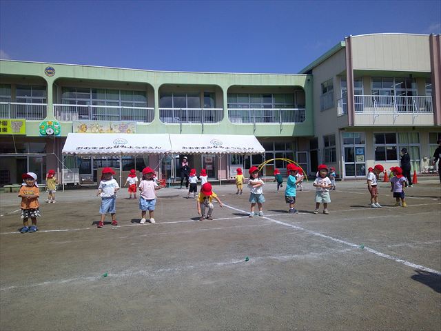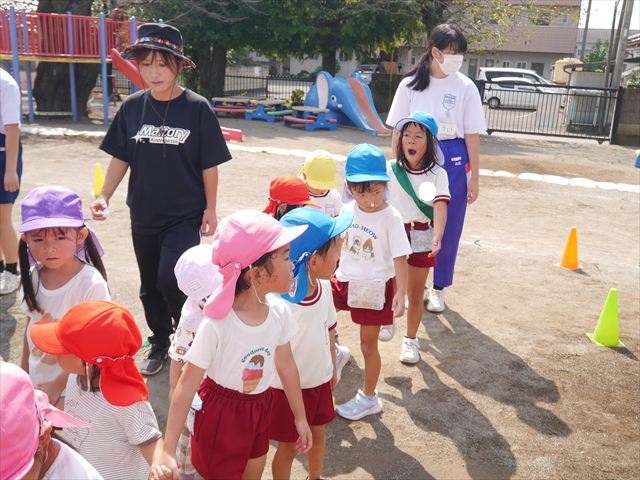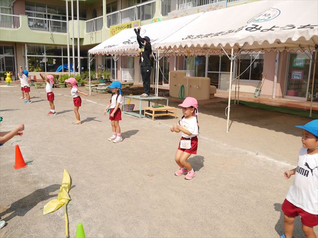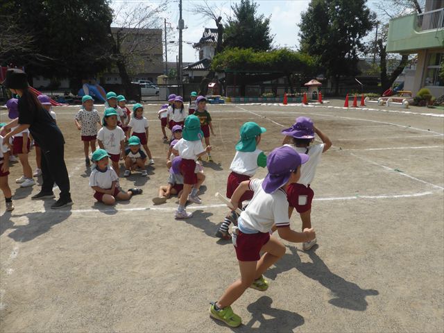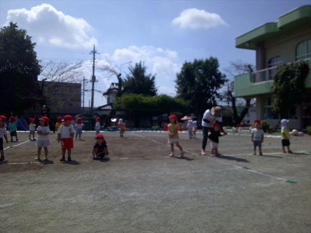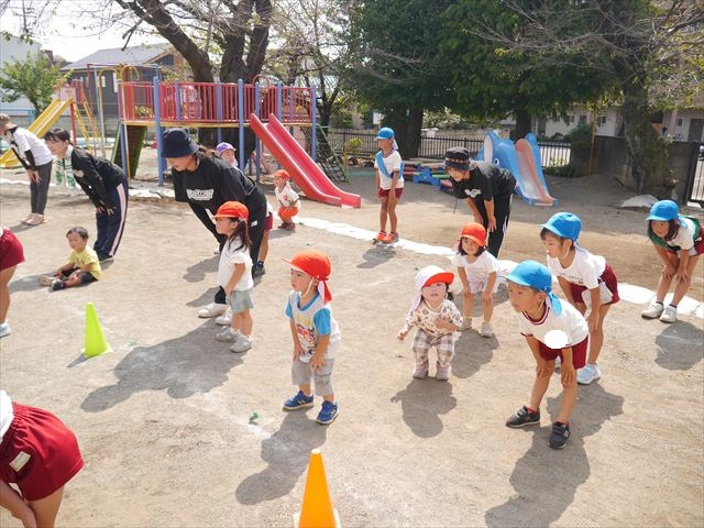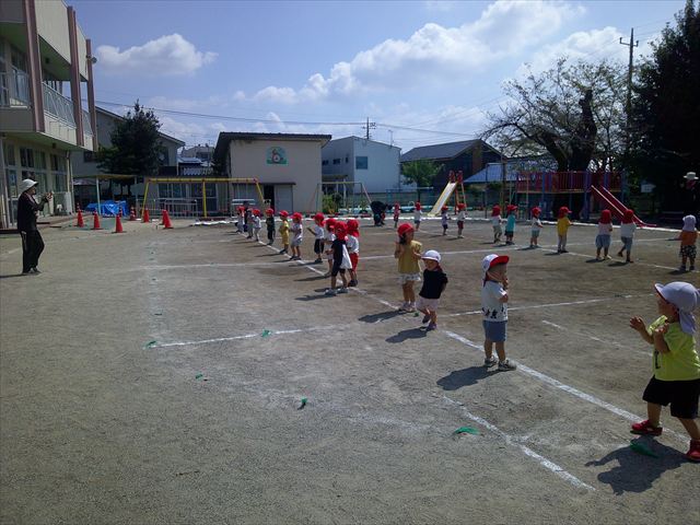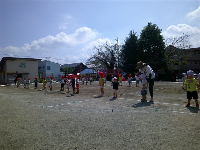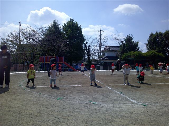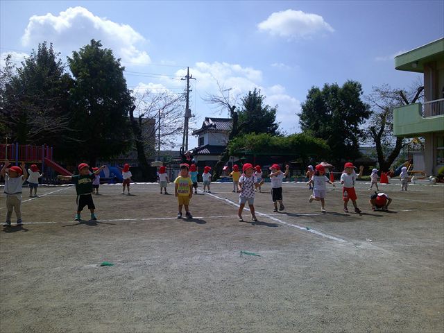 今日は初めて園庭で運動会の練習をしてみました!まずはかけっこの練習です。「位置について、よーい、ピッ!」の掛け声と笛の音に合わせて、ゴールに向かって一直線!お部屋での練習の成果もあり、お外でも上手に走っていました♪先生たちも夢中で、かけっこの写真を撮り忘れてしまいました…申し訳ありませんm(__)m その後は、遊戯のエビカニクスの練習もしました。お外だと緊張するのか、いつもより動きが控えめなたんぽぽさん(笑)たくさん練習を重ねて、お外でも元気いっぱいに動けるようにしていきたいと思います!