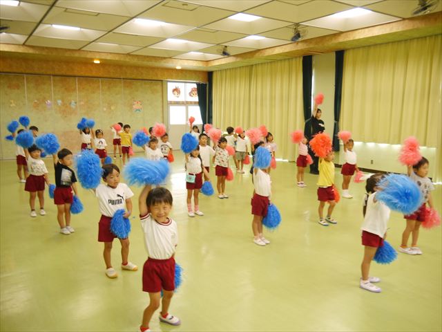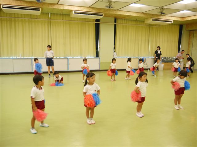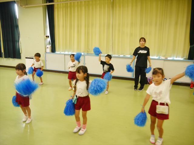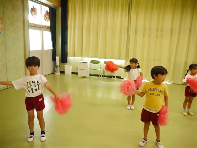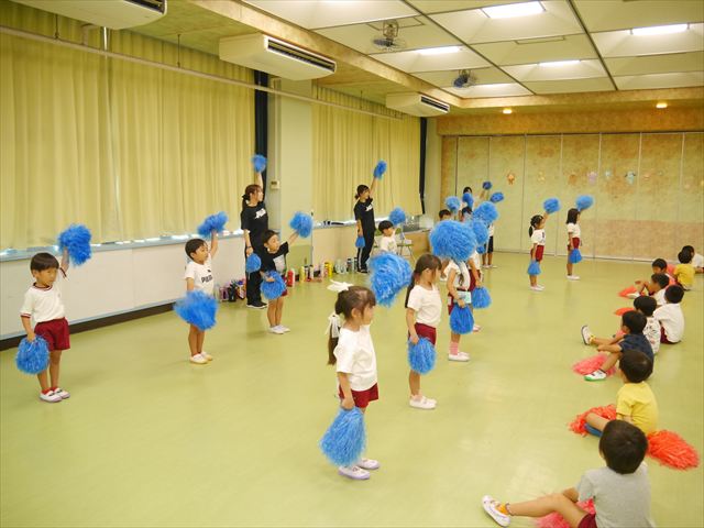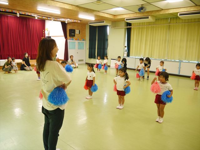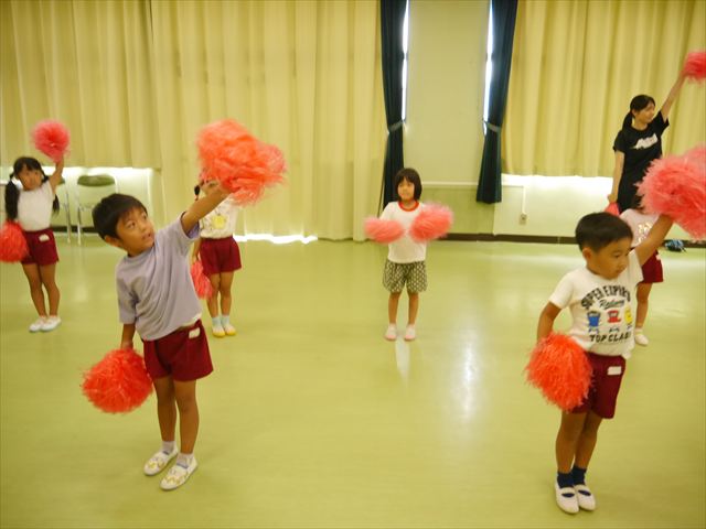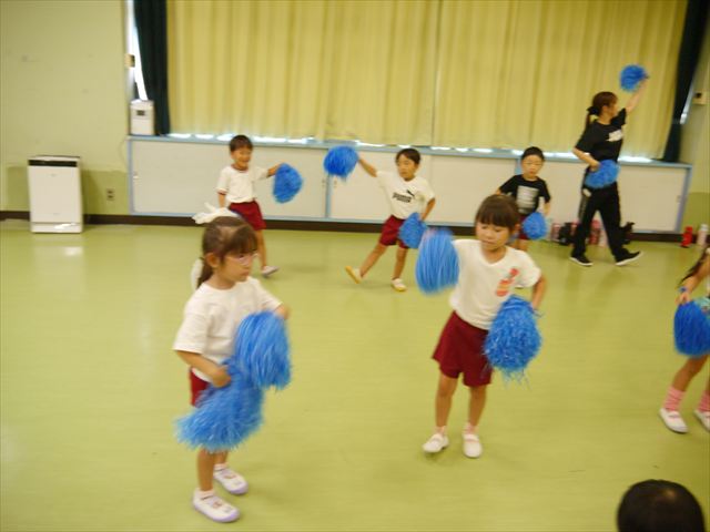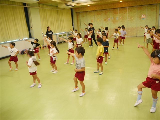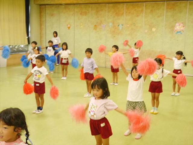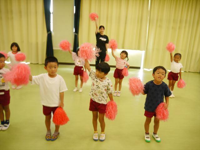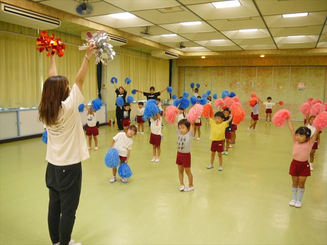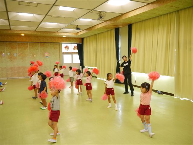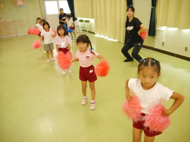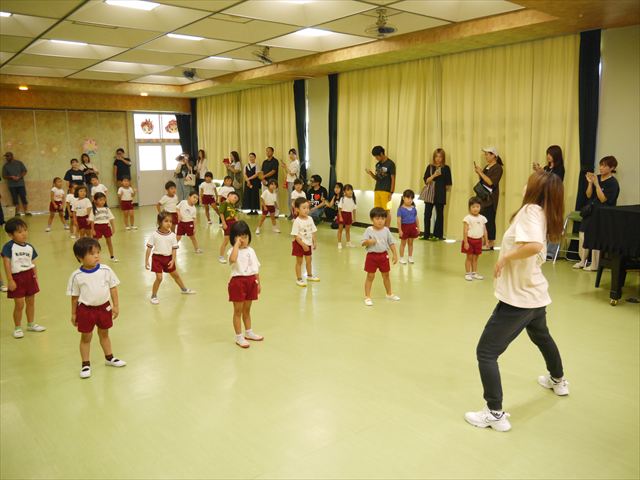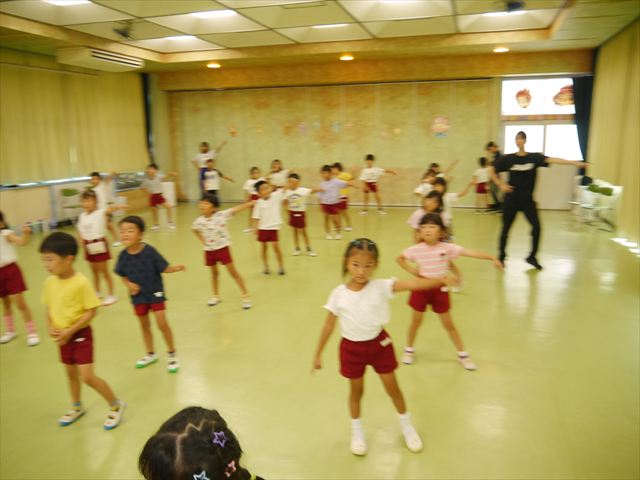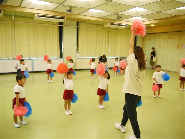 今日は、たんぽぽ組を除く全学年の「ダンス教室」を行いました。また、年少さん・年中さんは「公開授業」として実施し、島倉まゆみ先生に「ヒップホップ」や「チアダンス」を教えていただきました。3回目なので前回のことを覚えている子が多いはずでしたが、周りにお母さん、お父さんがいたり、夏休みもあったりしたので、年少さんや年中さんたちはちょっと集中が足りず、かつ忘れてしまった子も多かったかな・・・(^^;) でも、みんなすぐに思い出し、元気に楽しみながら様々な動きのある「ヒップホップダンス」やポンポンを持って笑顔で踊る「チアダンス」を体験しました。リズム感のある音楽にのって、子どもたちは元気いっぱい踊り、いい汗をかきました。年少さんたちは22日(月)も「ダンス教室」を行い、「運動会」の発表に向けて全力で頑張ってくれるわけなのですが、・・・(^^;) 果たしてどこまで頑張れるのでしょうか?保護者の皆さん、運動会当日をお楽しみに・・・!(^_^;) 年長さんも年中さんも第5回最終回(1月28日)の「ダンス教室」では、年少さんと同じ「チアダンス」を完成させることになっており、動画を撮影しホームページにアップする予定です。こちらの方もお楽しみに!(^_^)v ヘ(^o^)/