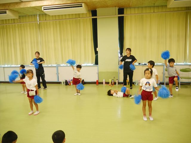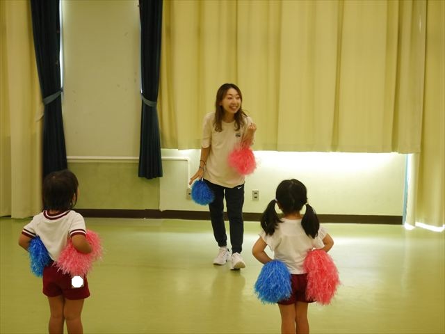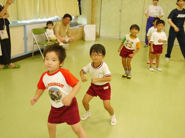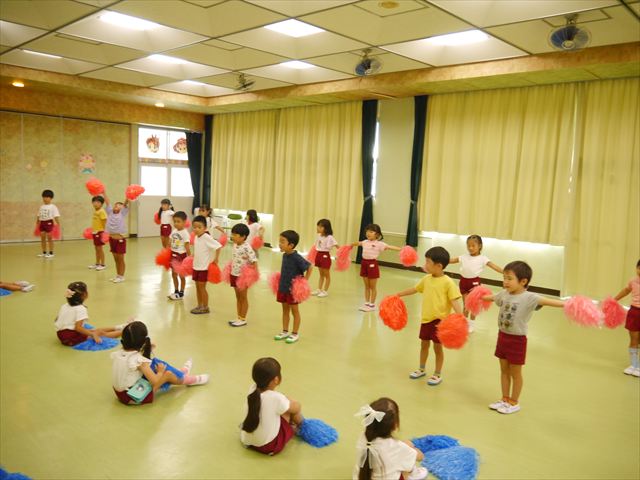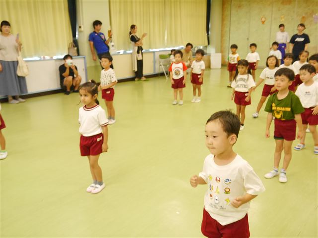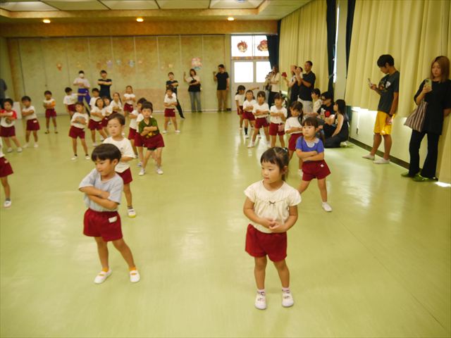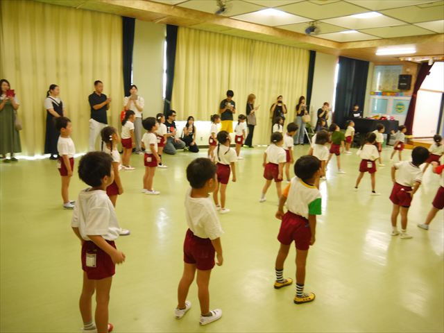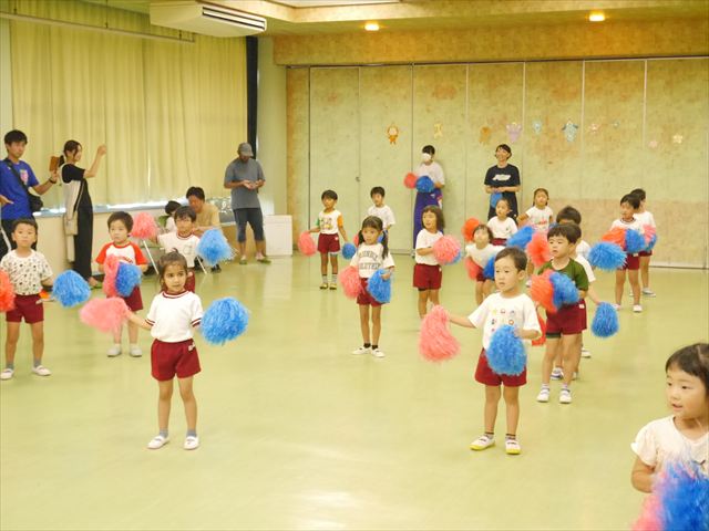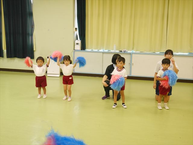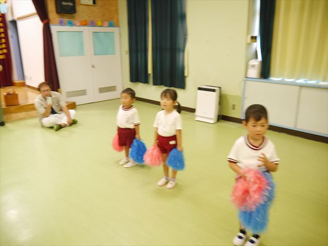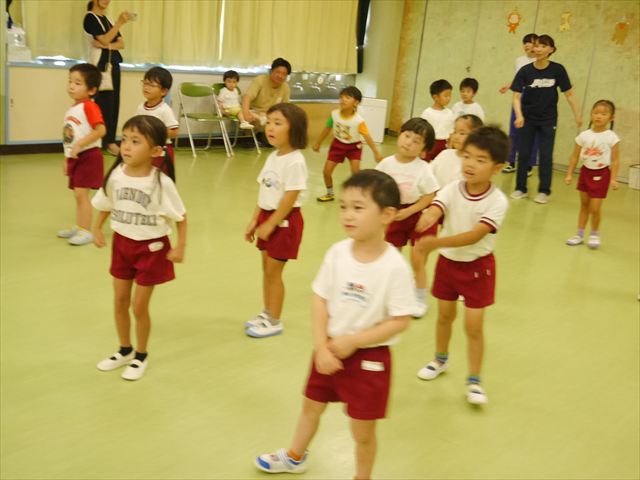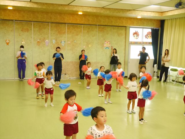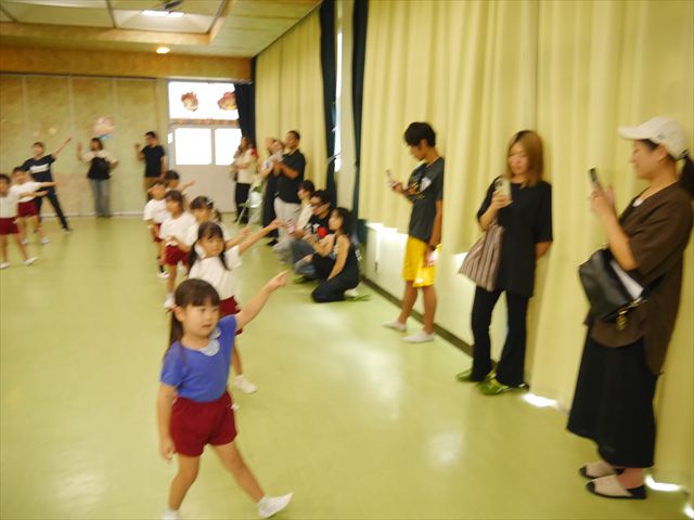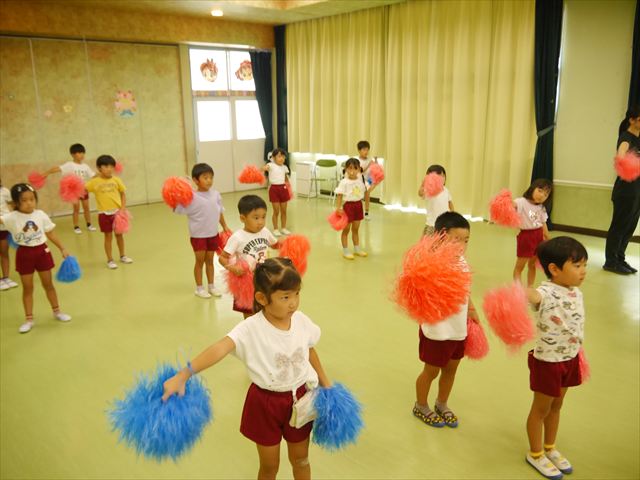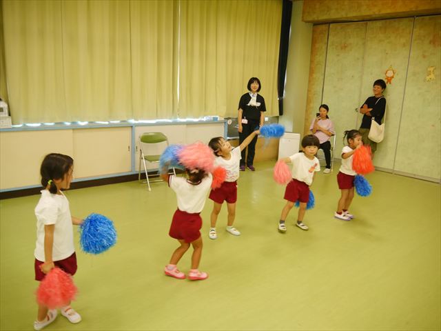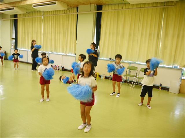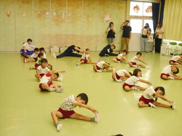 今日は、たんぽぽ組を除く全学年の「ダンス教室」を行いました。また、年少さん・年中さんは「公開授業」として実施し、島倉まゆみ先生に「ヒップホップ」や「チアダンス」を教えていただきました。3回目なので前回のことを覚えている子が多いはずでしたが、周りにお母さん、お父さんがいたり、夏休みもあったりしたので、年少さんや年中さんたちはちょっと集中が足りず、かつ忘れてしまった子も多かったかな・・・(^^;) でも、みんなすぐに思い出し、元気に楽しみながら様々な動きのある「ヒップホップダンス」やポンポンを持って笑顔で踊る「チアダンス」を体験しました。リズム感のある音楽にのって、子どもたちは元気いっぱい踊り、いい汗をかきました。年少さんたちは22日(月)も「ダンス教室」を行い、「運動会」の発表に向けて全力で頑張ってくれるわけなのですが、・・・(^^;) 果たしてどこまで頑張れるのでしょうか?保護者の皆さん、運動会当日をお楽しみに・・・!(^_^;) 年長さんも年中さんも第5回最終回(1月28日)の「ダンス教室」では、年少さんと同じ「チアダンス」を完成させることになっており、動画を撮影しホームページにアップする予定です。こちらの方もお楽しみに!(^_^)v ヘ(^o^)/