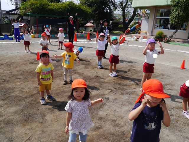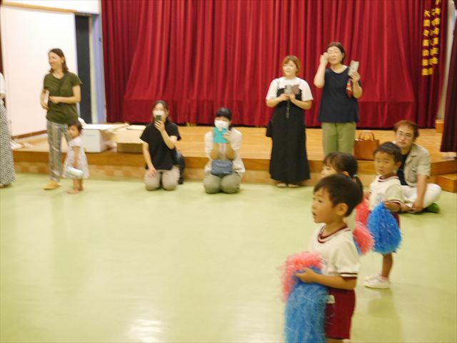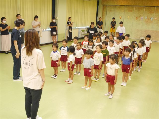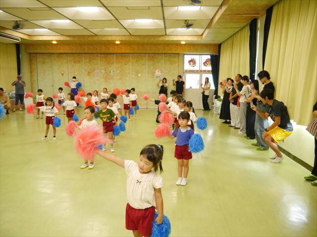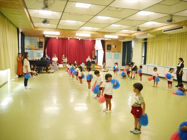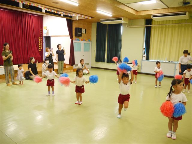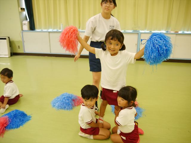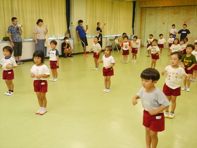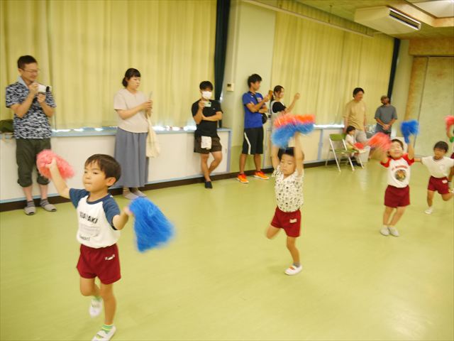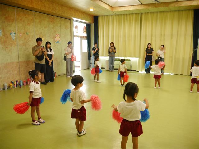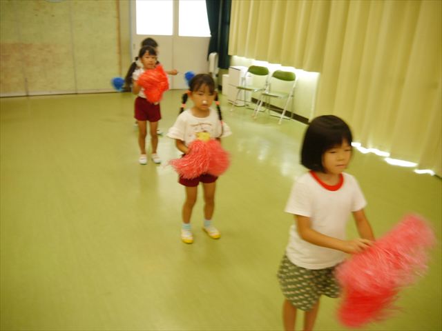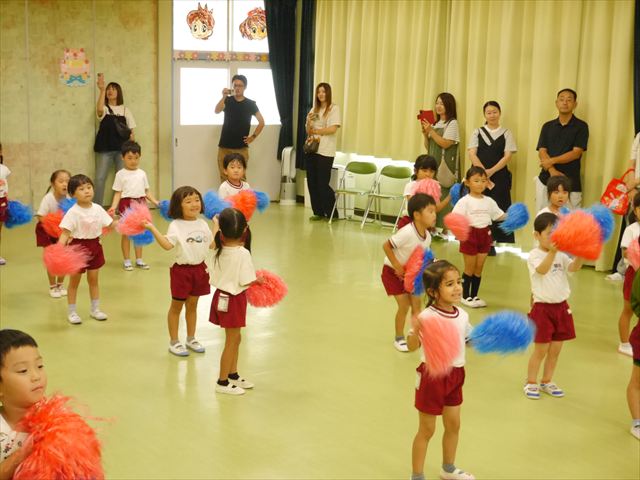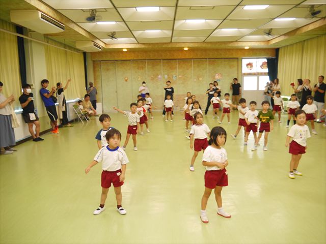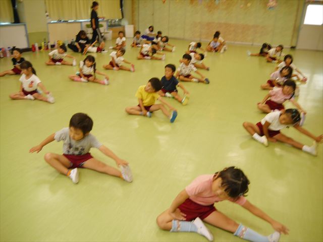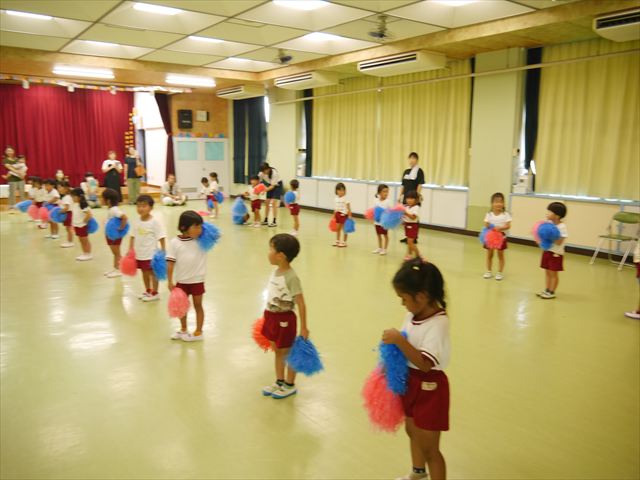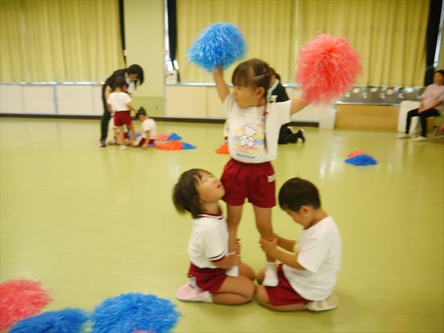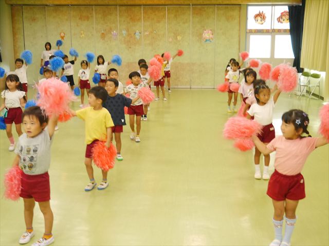 今日は、たんぽぽ組を除く全学年の「ダンス教室」を行いました。また、年少さん・年中さんは「公開授業」として実施し、島倉まゆみ先生に「ヒップホップ」や「チアダンス」を教えていただきました。3回目なので前回のことを覚えている子が多いはずでしたが、周りにお母さん、お父さんがいたり、夏休みもあったりしたので、年少さんや年中さんたちはちょっと集中が足りず、かつ忘れてしまった子も多かったかな・・・(^^;) でも、みんなすぐに思い出し、元気に楽しみながら様々な動きのある「ヒップホップダンス」やポンポンを持って笑顔で踊る「チアダンス」を体験しました。リズム感のある音楽にのって、子どもたちは元気いっぱい踊り、いい汗をかきました。年少さんたちは22日(月)も「ダンス教室」を行い、「運動会」の発表に向けて全力で頑張ってくれるわけなのですが、・・・(^^;) 果たしてどこまで頑張れるのでしょうか?保護者の皆さん、運動会当日をお楽しみに・・・!(^_^;) 年長さんも年中さんも第5回最終回(1月28日)の「ダンス教室」では、年少さんと同じ「チアダンス」を完成させることになっており、動画を撮影しホームページにアップする予定です。こちらの方もお楽しみに!(^_^)v ヘ(^o^)/
