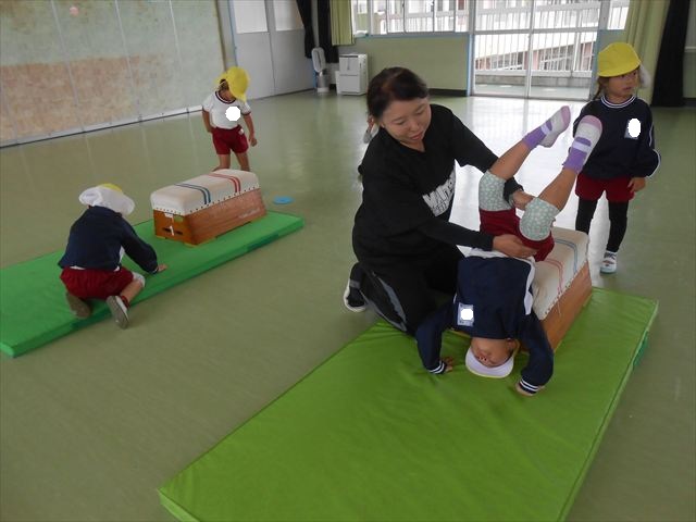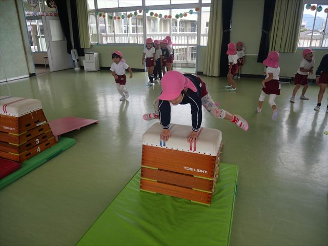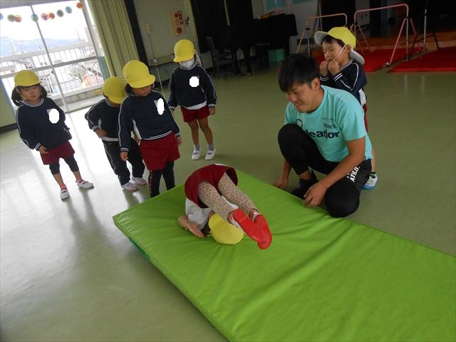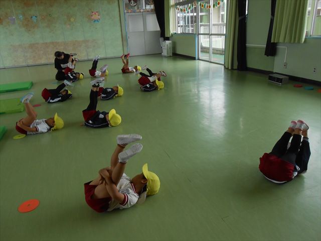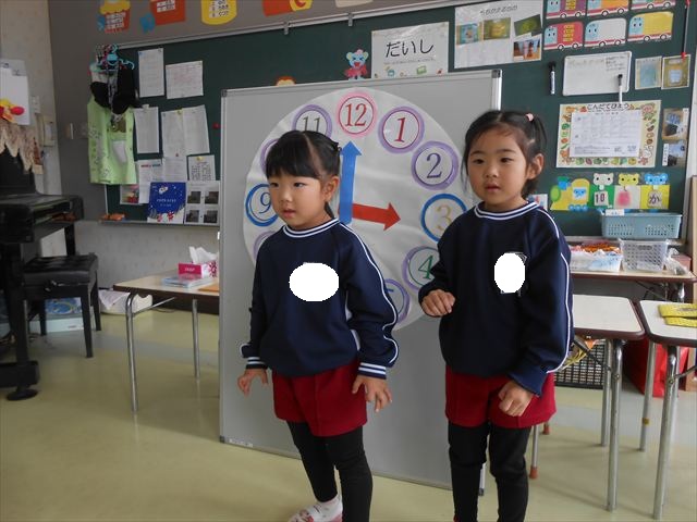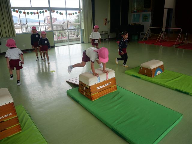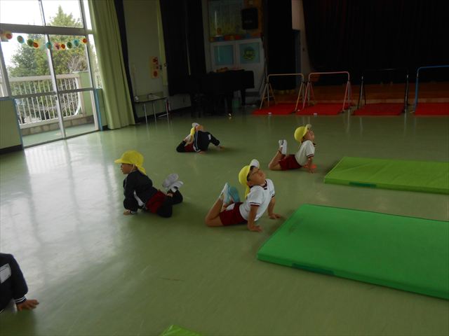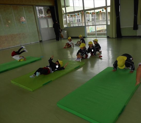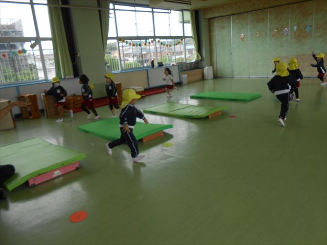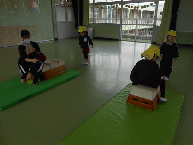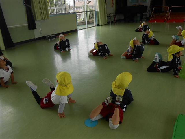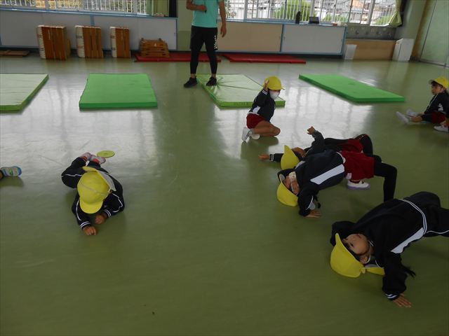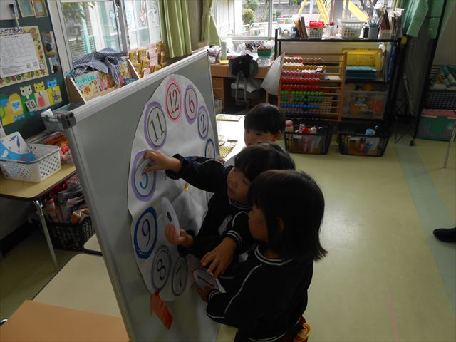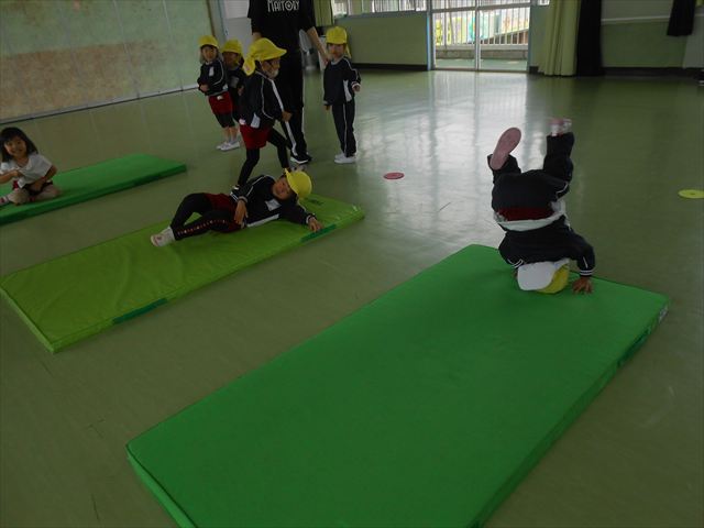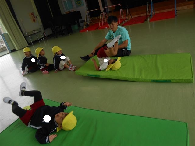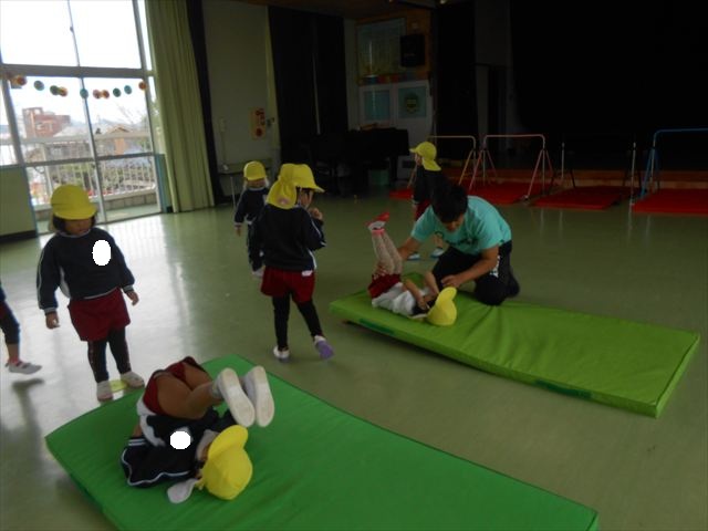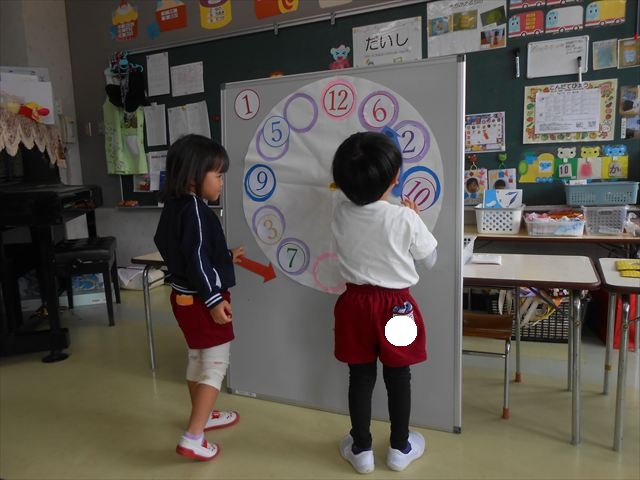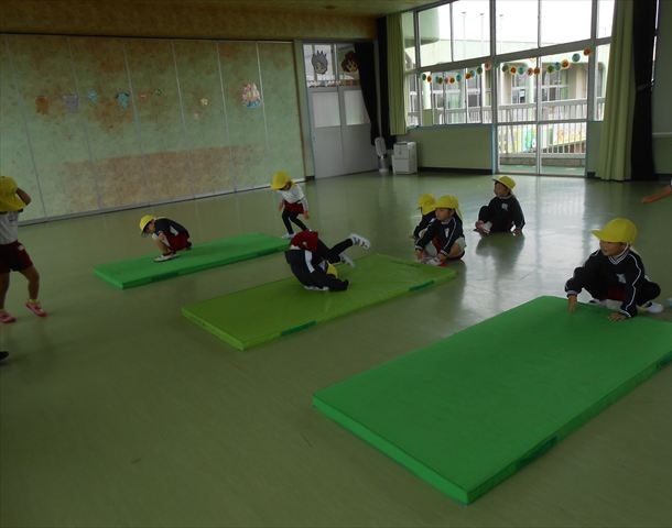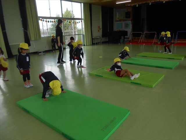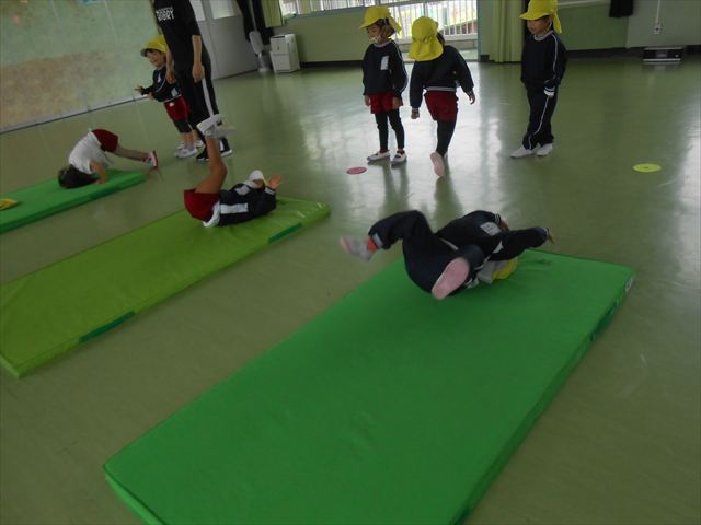 今日は、運動教室を行ないました。マットで前回りの復習と後ろ回りを教えていただきました。飛び箱を使ったり坂道をを使ったりしながら練習をしました。鉄棒では前回りと足抜きをしました。個人差はありますがそれぞれ頑張る姿が見られました(^^♪その後は、算数の時間で時計をしました。ばらばらになってしまった時計の数字を並び替えました。お友だちと協力しながら完成させることができました。午後は、室内遊びを楽しみました(