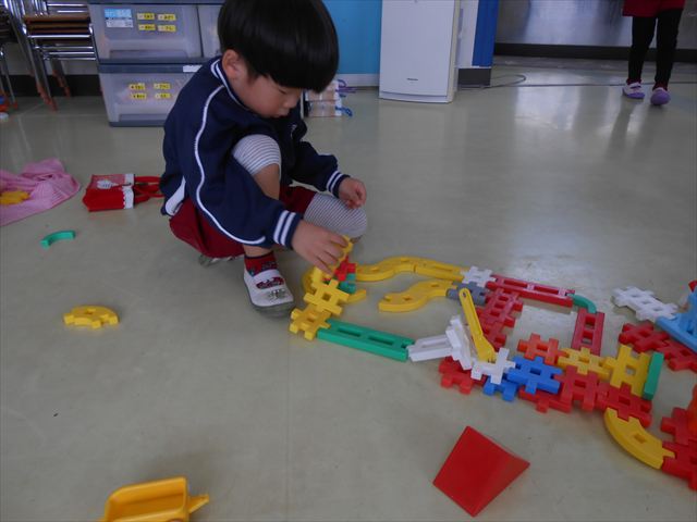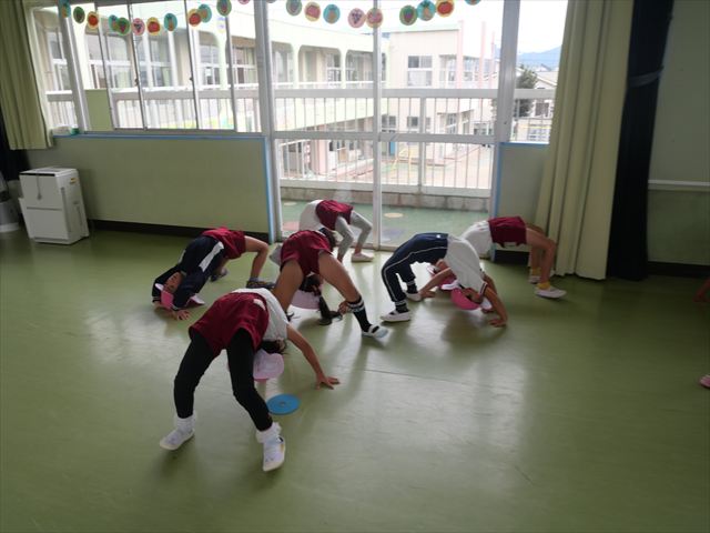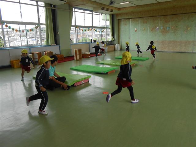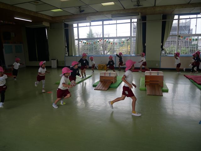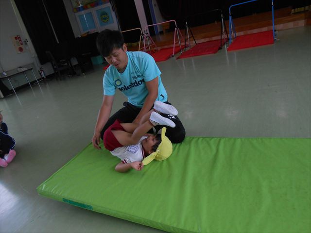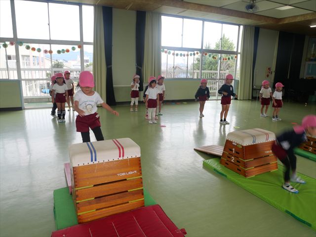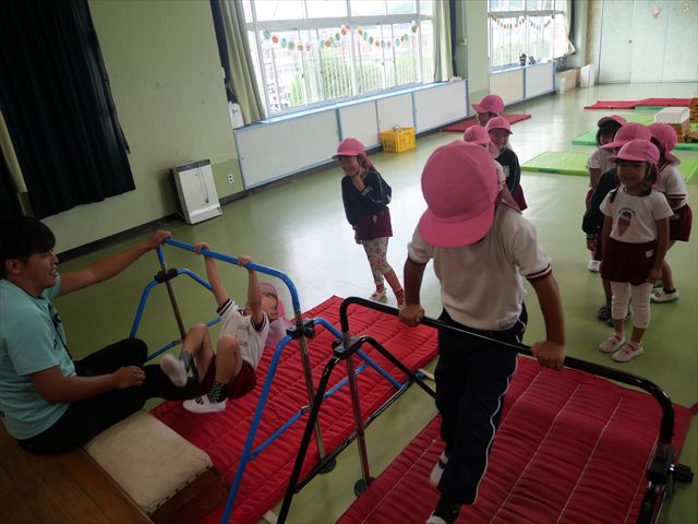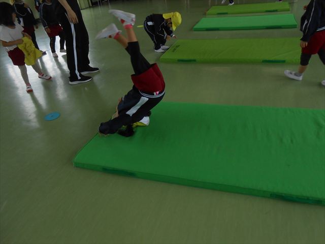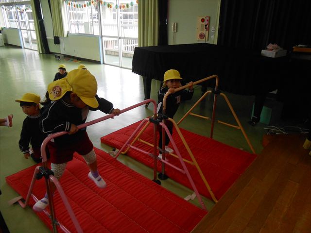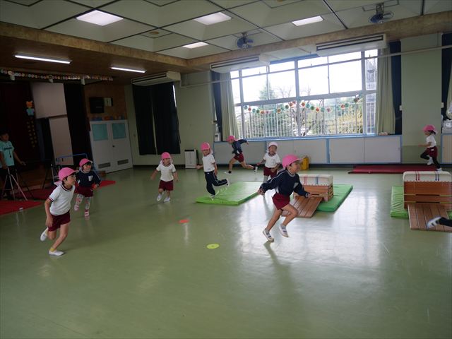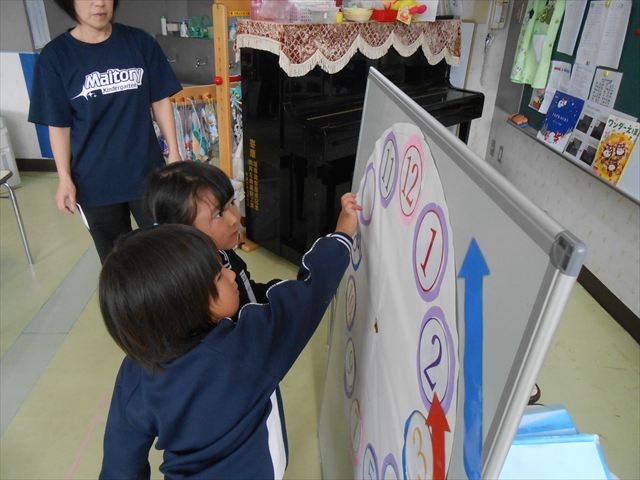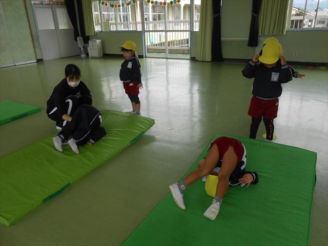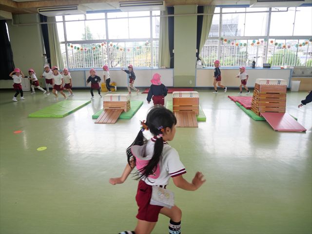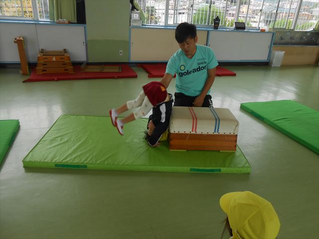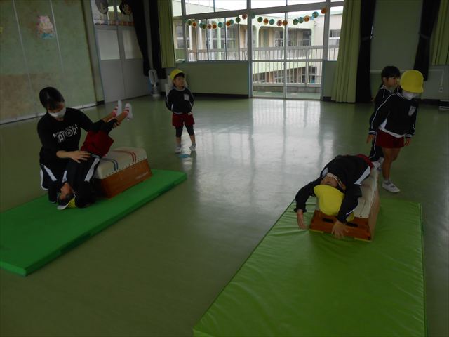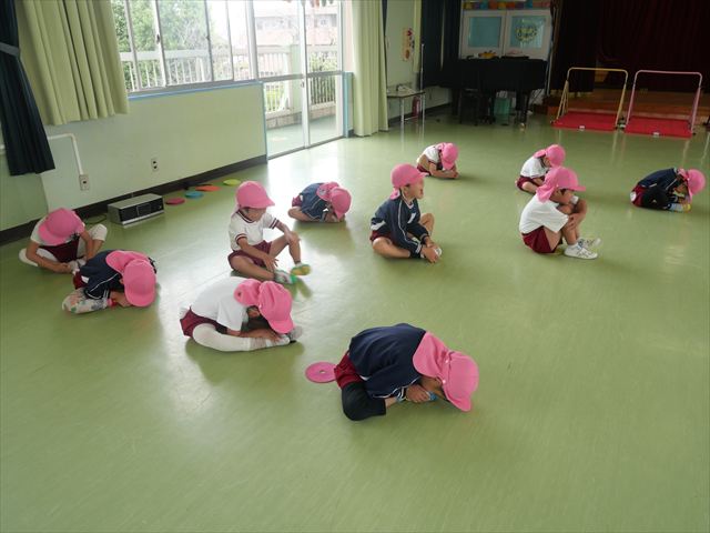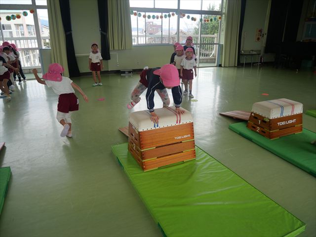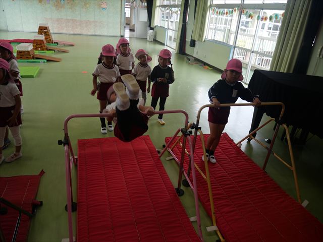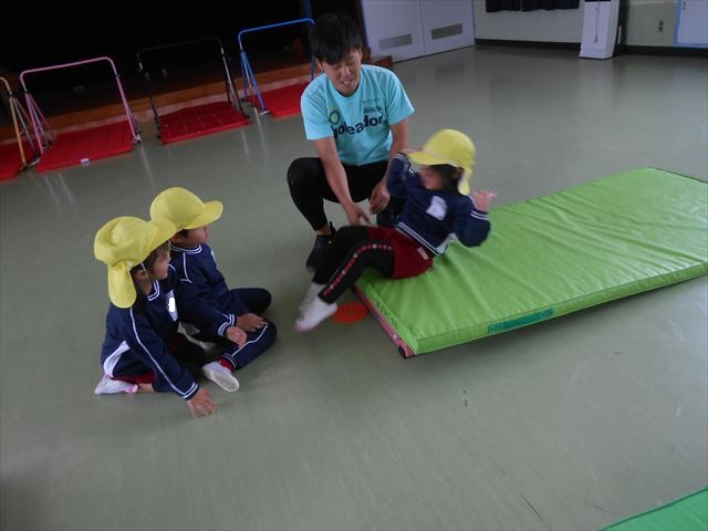 今日は、運動教室を行ないました。マットで前回りの復習と後ろ回りを教えていただきました。飛び箱を使ったり坂道をを使ったりしながら練習をしました。鉄棒では前回りと足抜きをしました。個人差はありますがそれぞれ頑張る姿が見られました(^^♪その後は、算数の時間で時計をしました。ばらばらになってしまった時計の数字を並び替えました。お友だちと協力しながら完成させることができました。午後は、室内遊びを楽しみました(