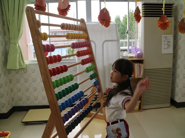 今回は算数の時間で10のかたまりをやりました。大型そろばんを使って「1と9で10になる」というように10になる組み合わせを考えました!最後には虫食いクイズもして、楽しく学ぶことが出来ました!