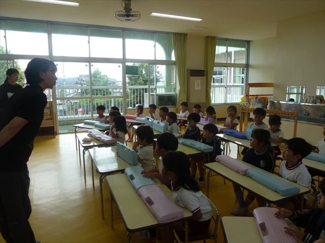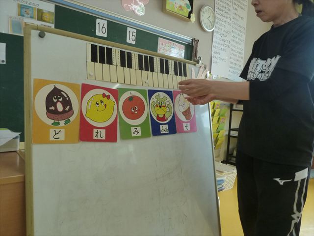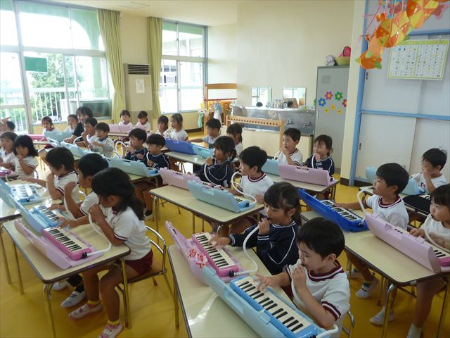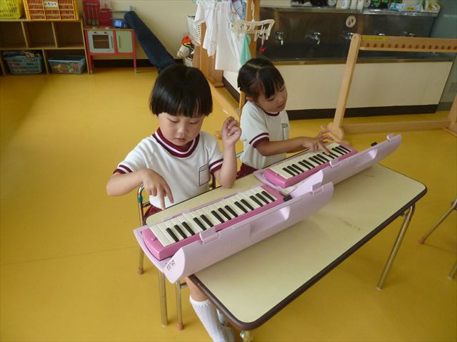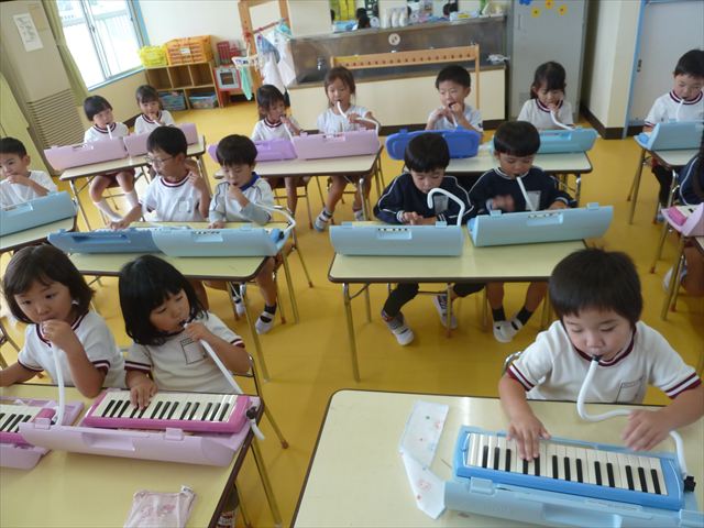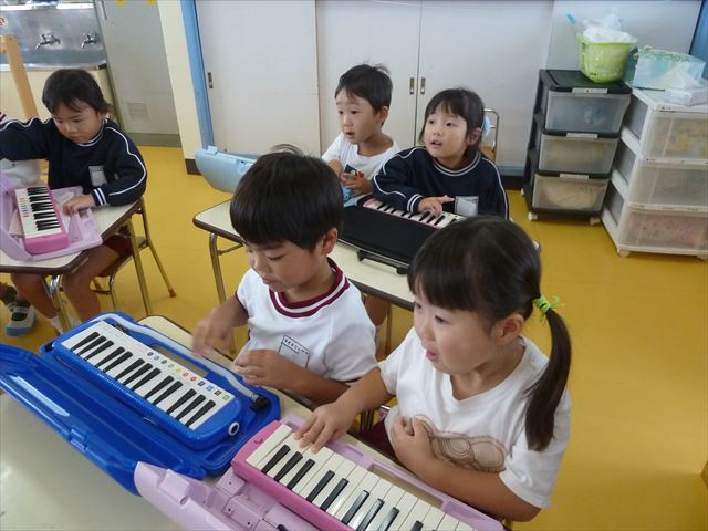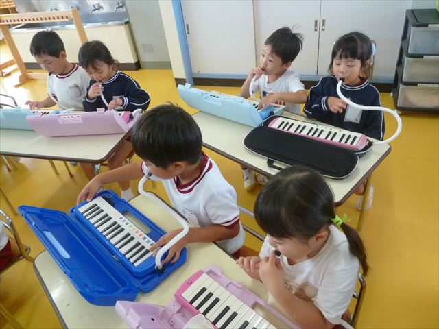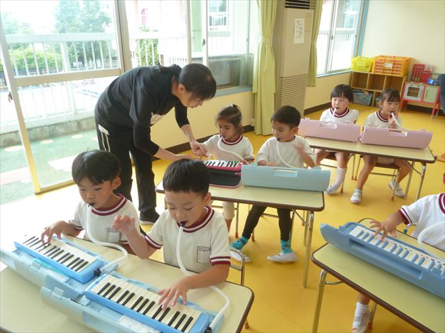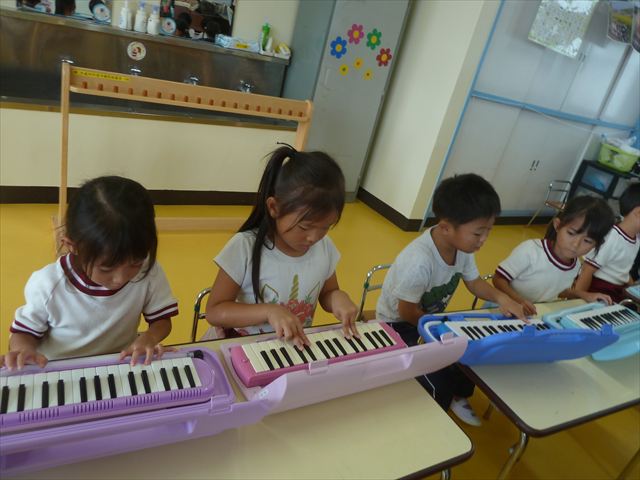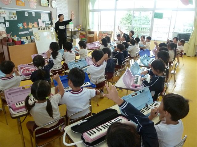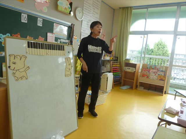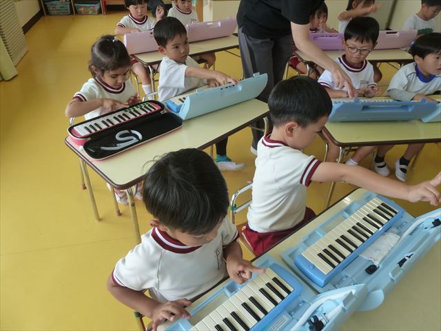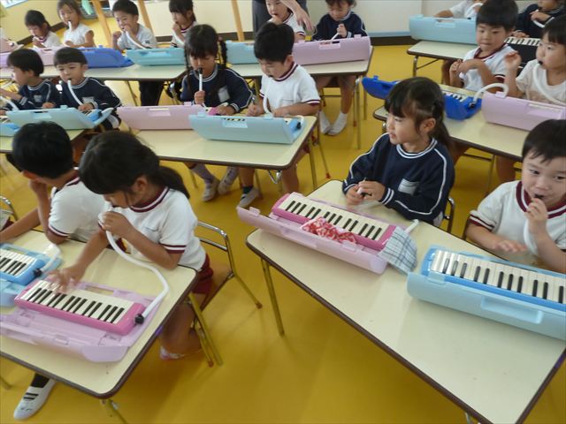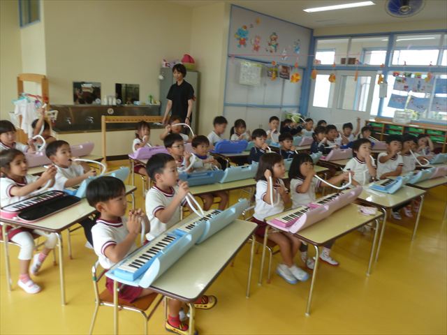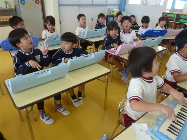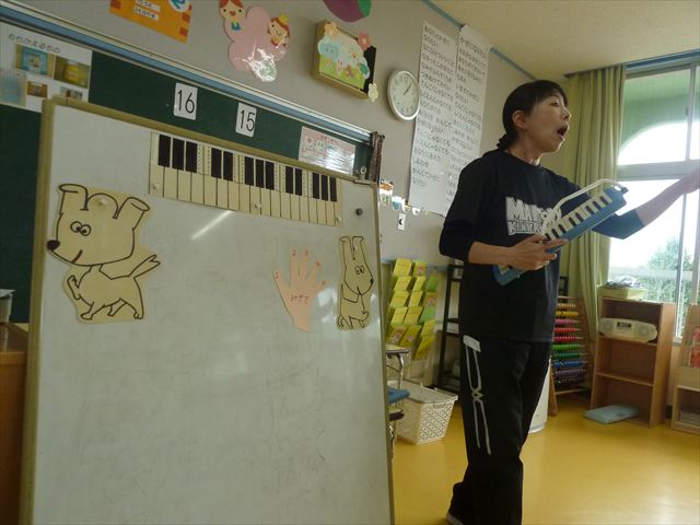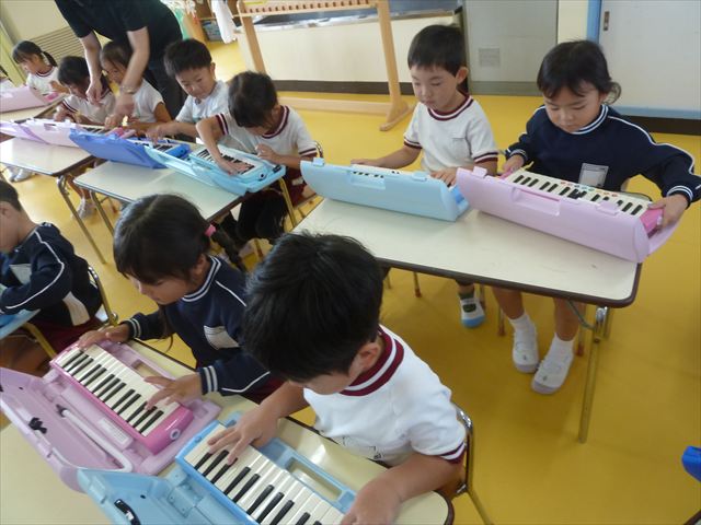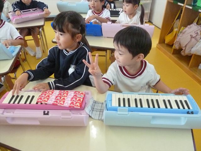 午後は鍵盤ハーモニカ教室を牧野先生にしてもらいました。けんちゃん、ばんちゃんと言うキャラクターを使って、黒鍵が2個の所と3個の所があるお話や、2個の黒鍵を一度に押して吹くと車のクラクションの音になるねーと曲に合わせながら実際に音を鳴らしてみたりしました。