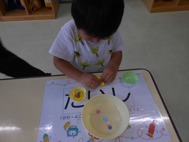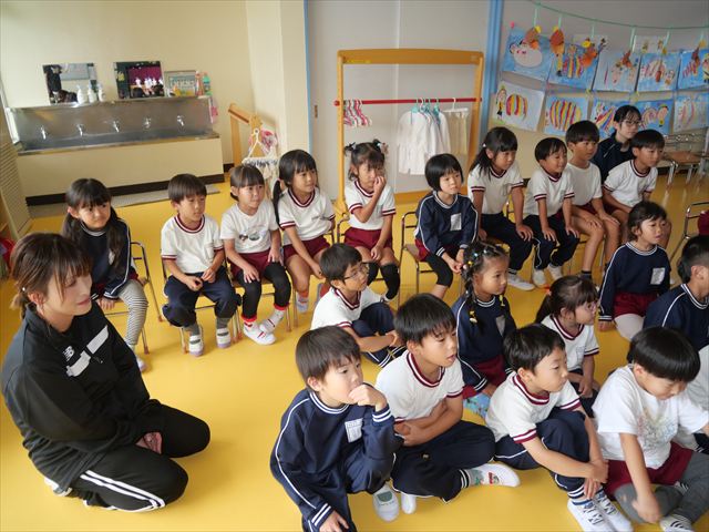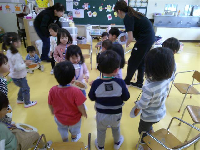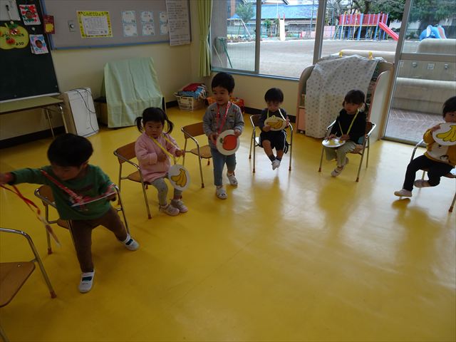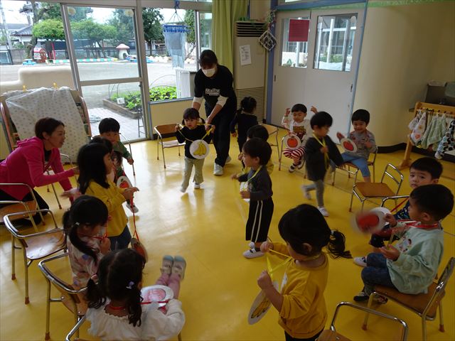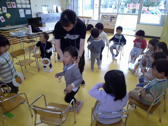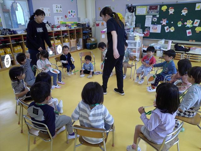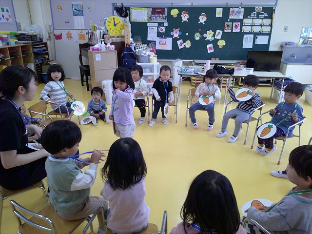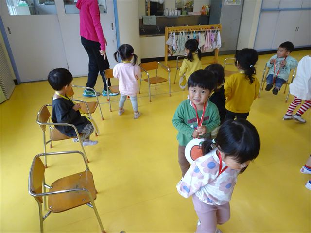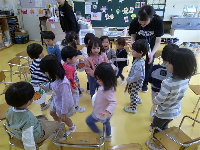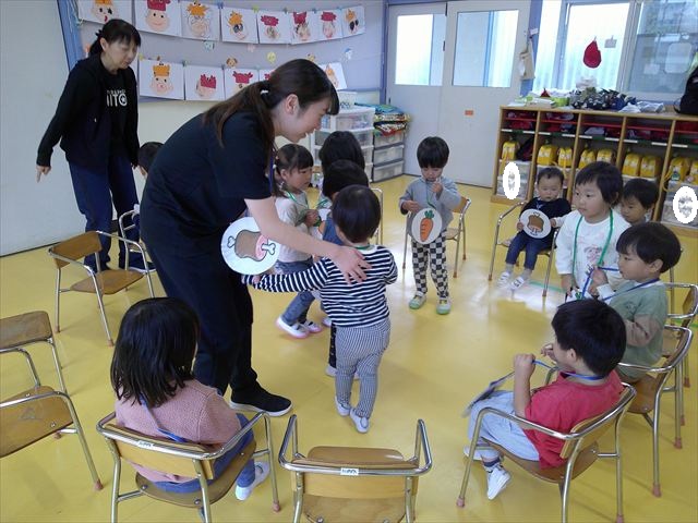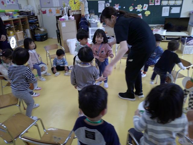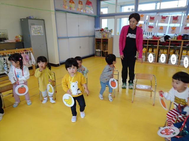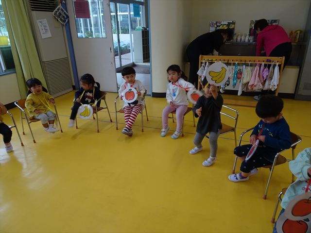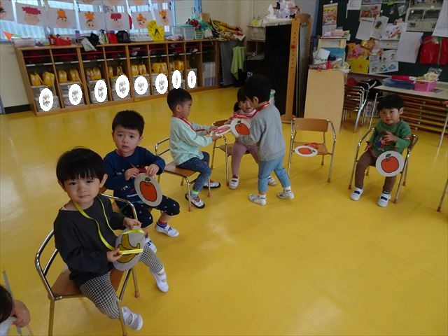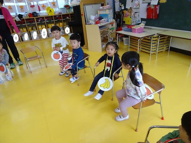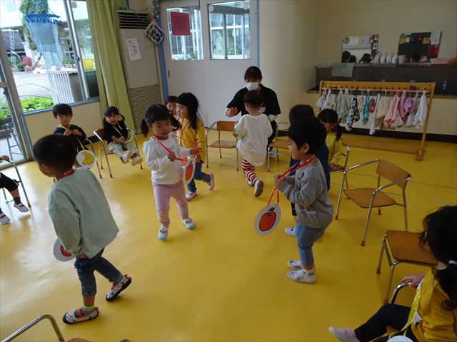 その後は、集団遊びでフルーツバスケットをしました。運動会の親子競技で使う予定だったペンダントを使い、それぞれのチームに分かれてやってみました。自分のチームの食べ物が言われたら動くのですが、慣れるまでは難しくて自分のチームでなくてもずっと動いてしまうお友だちも(笑)最後は少しずつルールを覚えてきて、動けるようになってきました!今度はカードを増やしたり、AB合同でやってみたいと思います♪