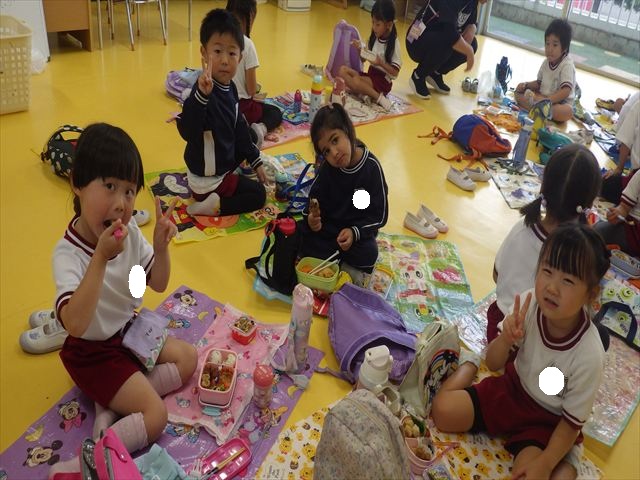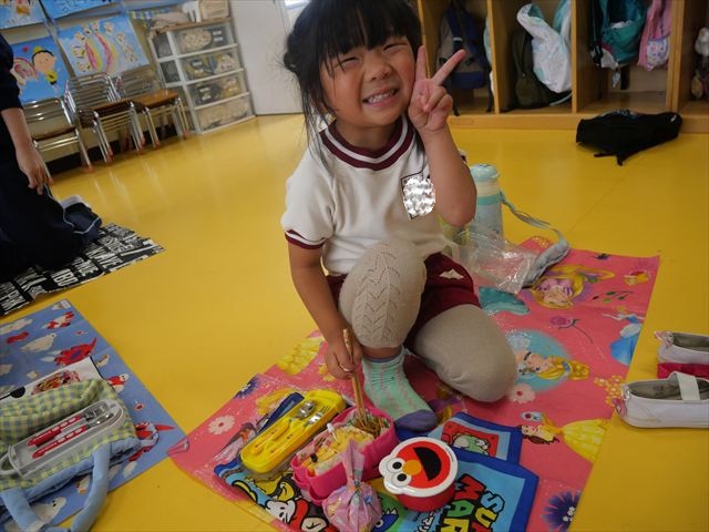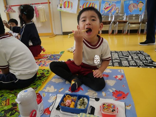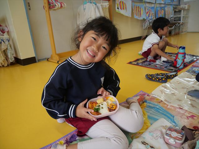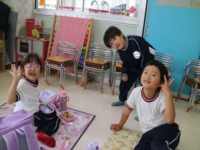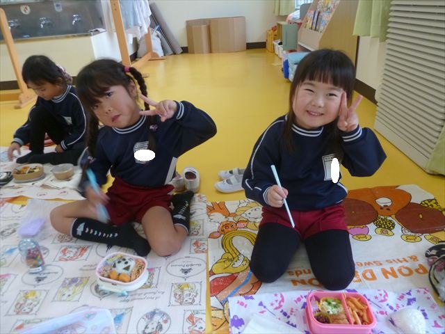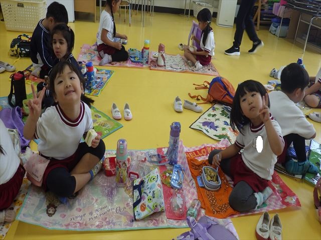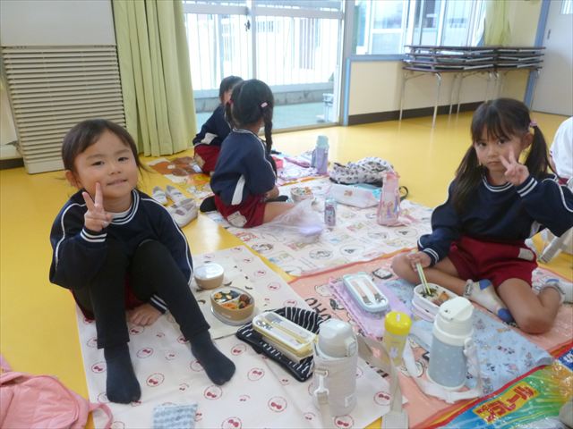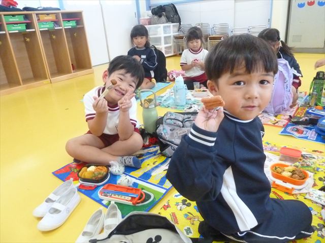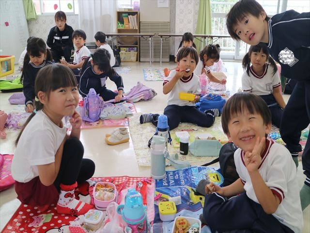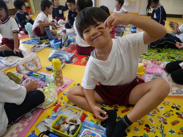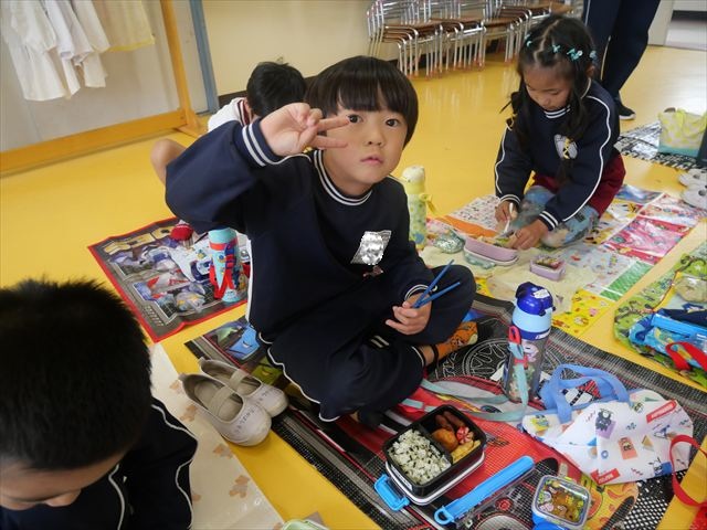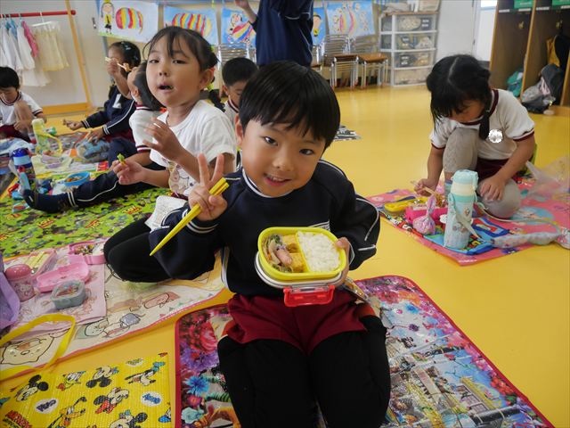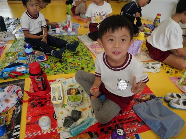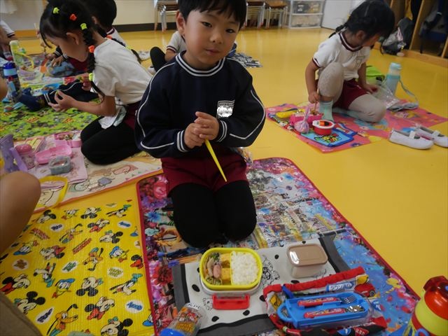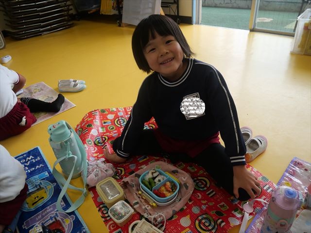 今日はいもほり遠足が延期になったので教室でシートを敷いてお弁当を食べました!愛情たっぷりの手作りお弁当を食べて幸せそうな様子でした!午後は室内遊びを楽しみました!