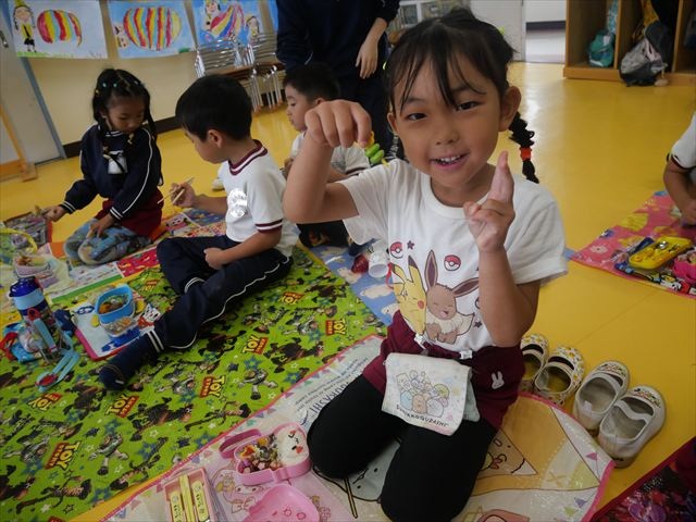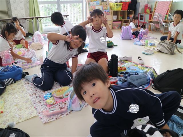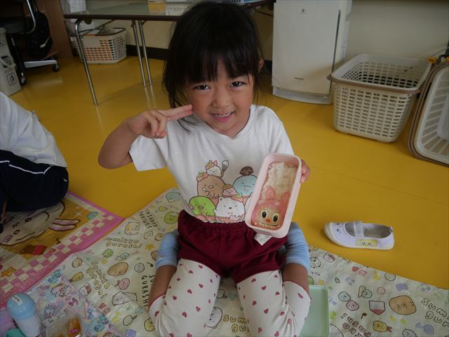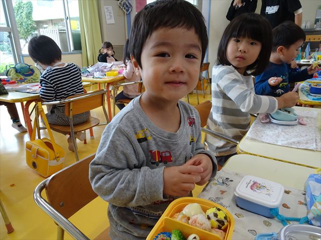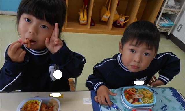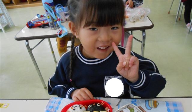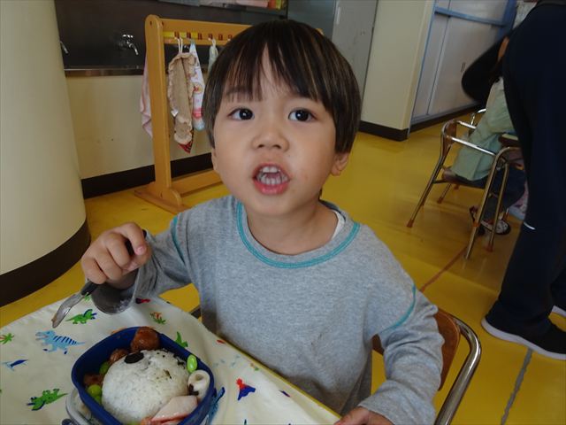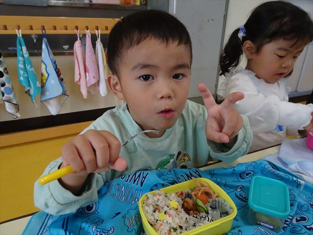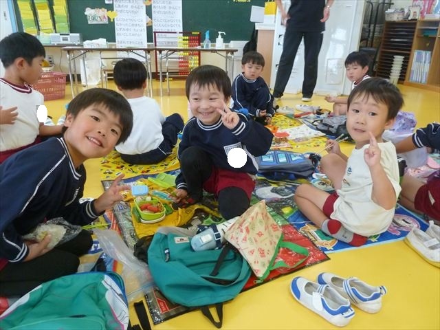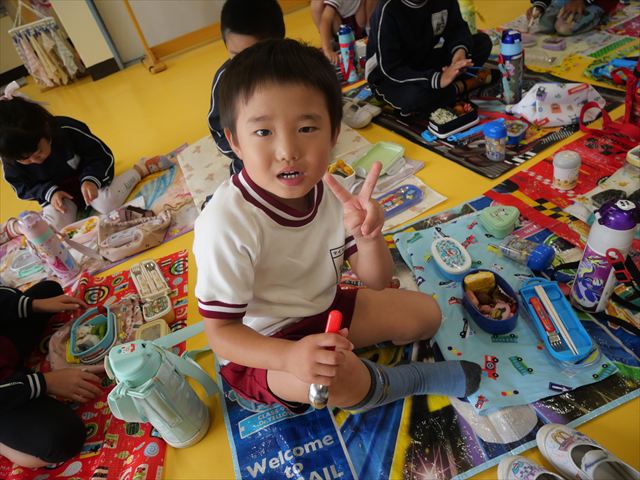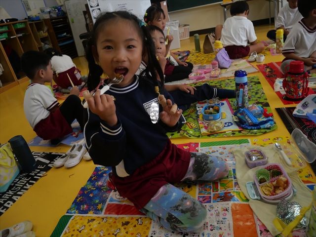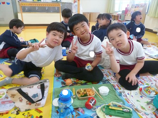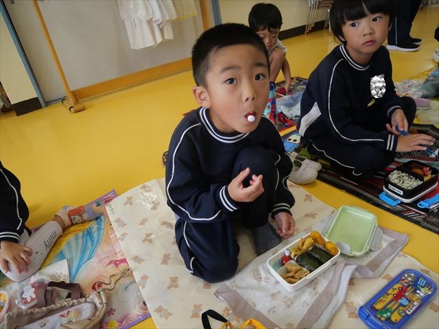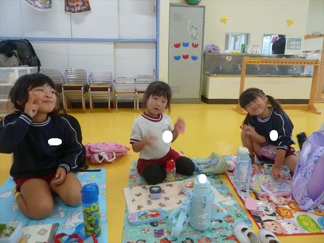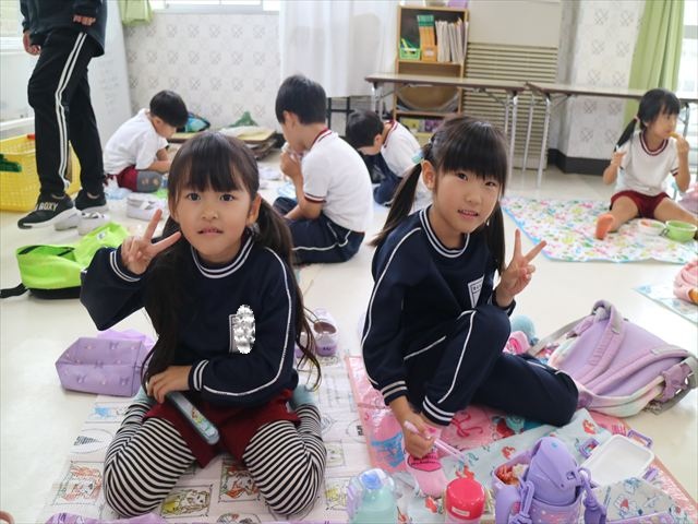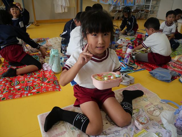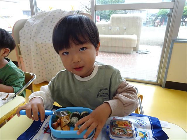 今日はいもほり遠足が延期になったので教室でシートを敷いてお弁当を食べました!愛情たっぷりの手作りお弁当を食べて幸せそうな様子でした!午後は室内遊びを楽しみました!