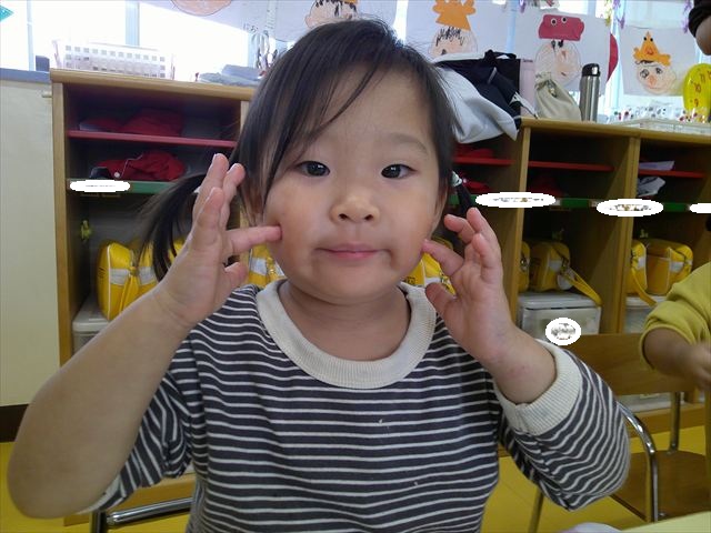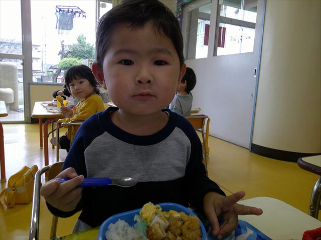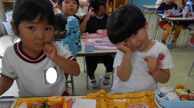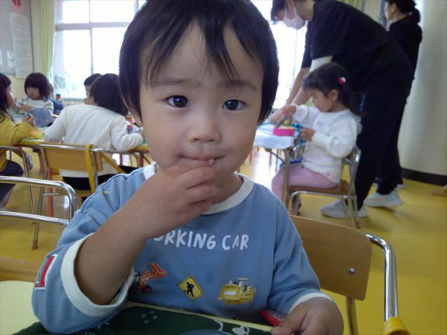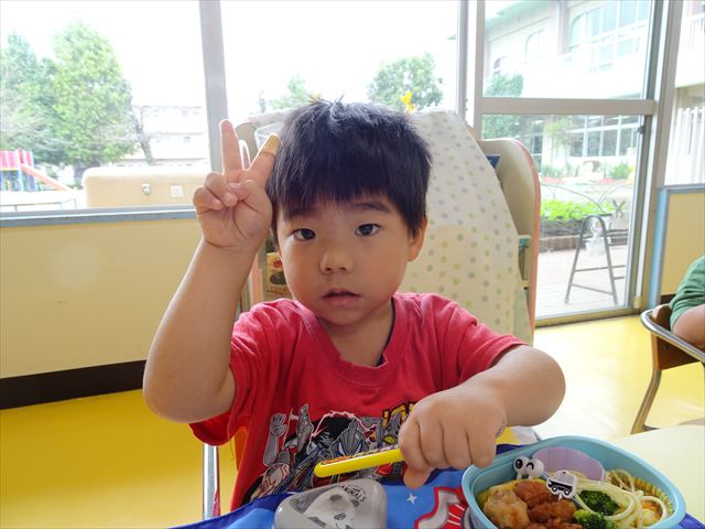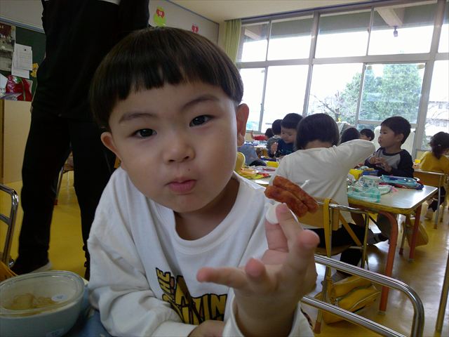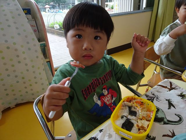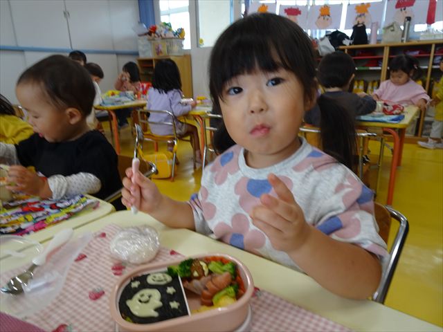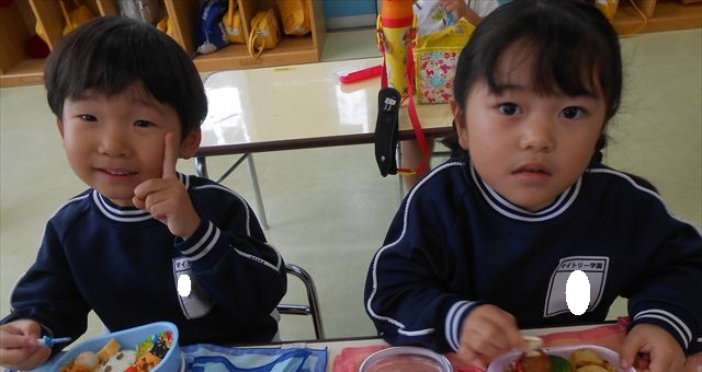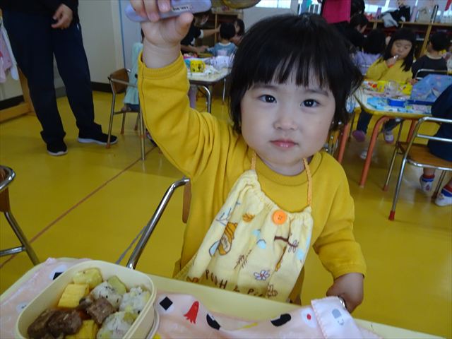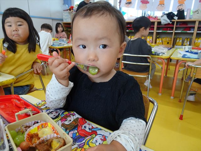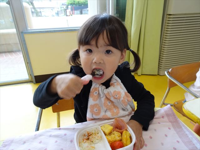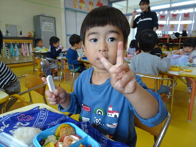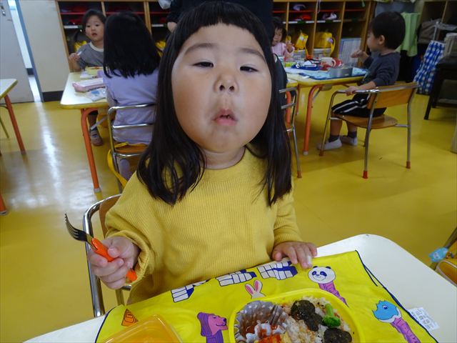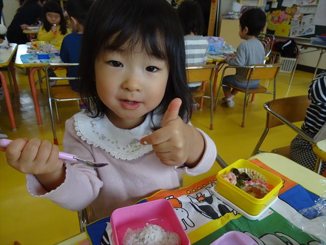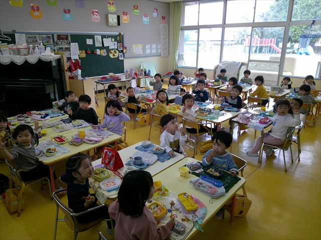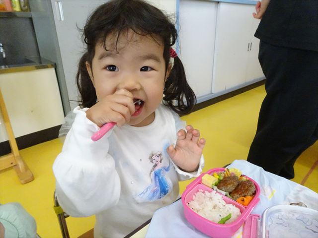 今日はいもほり遠足が延期になったので教室でシートを敷いてお弁当を食べました!愛情たっぷりの手作りお弁当を食べて幸せそうな様子でした!午後は室内遊びを楽しみました!