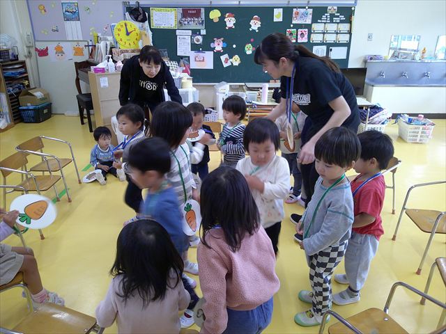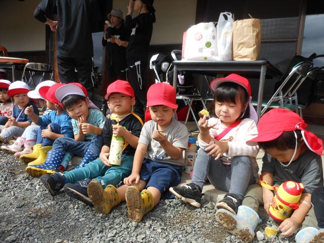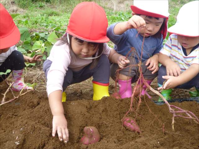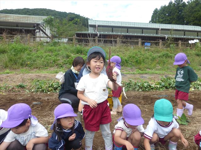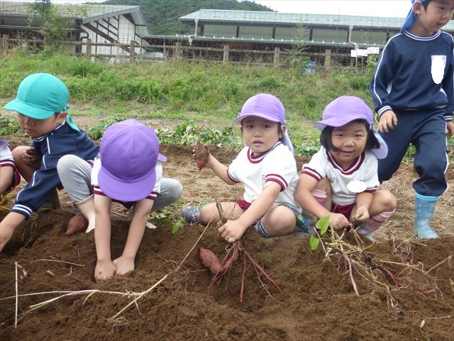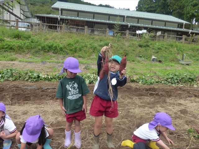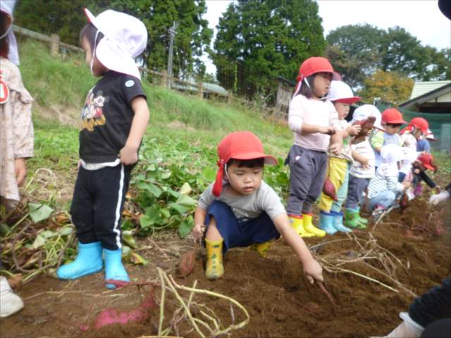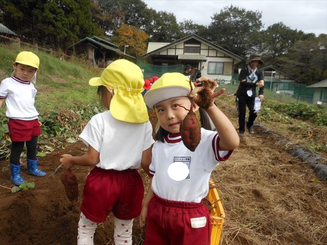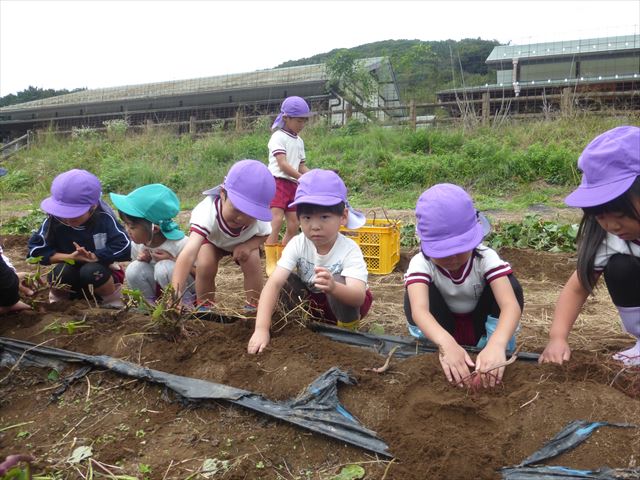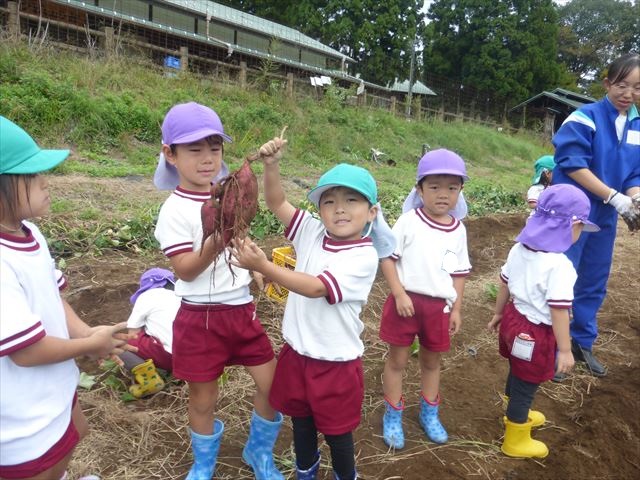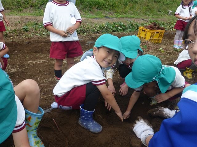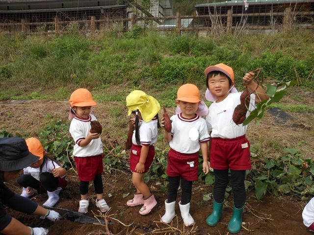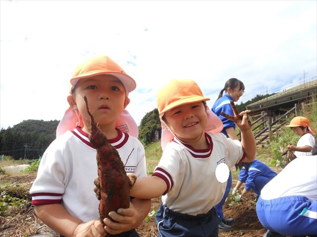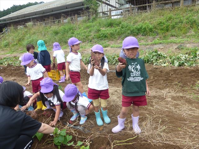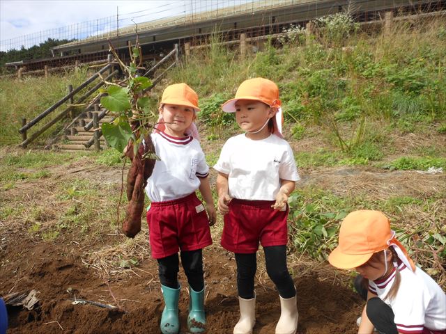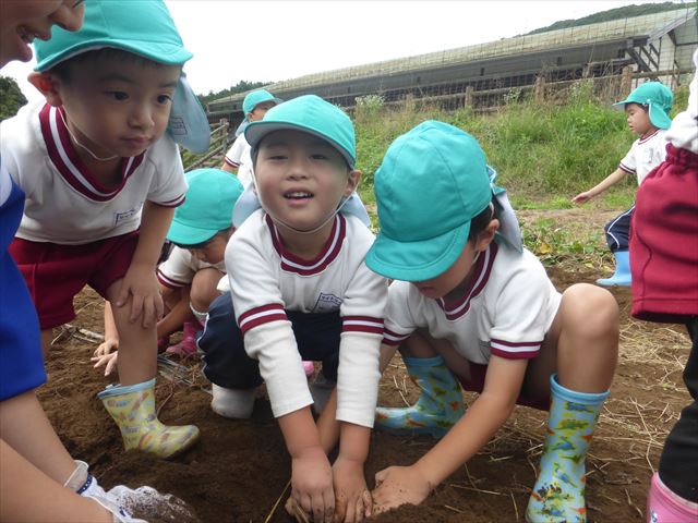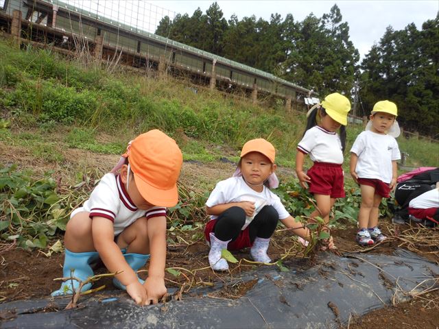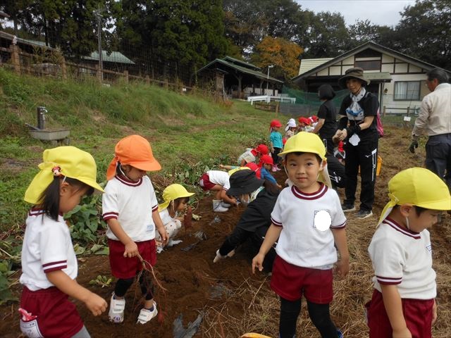 明日は、先発隊のたんぽぽ組・年少組が9時50分に幼稚園を出発し、先に「いも掘り」をしたあと、後発隊の年中組・年長組が10時30分に幼稚園を出発し、「いも掘り」をする予定です。