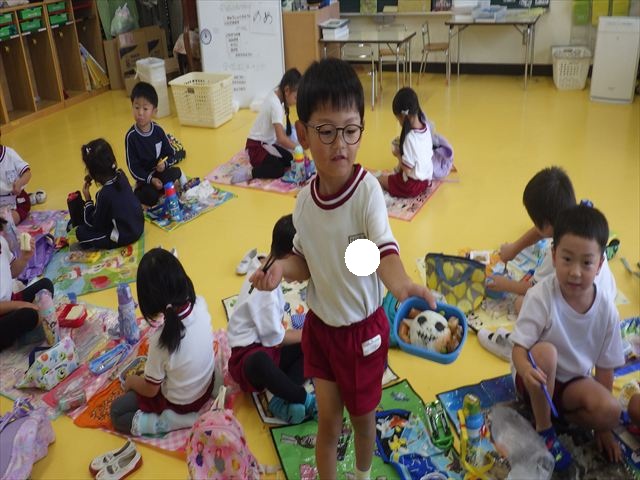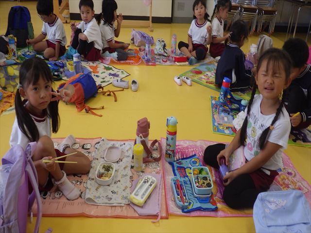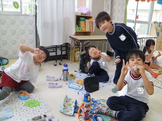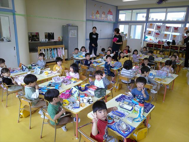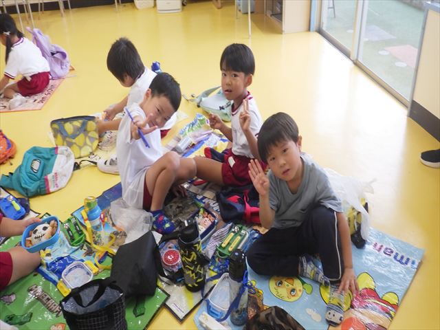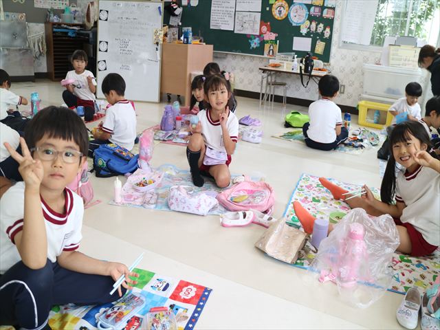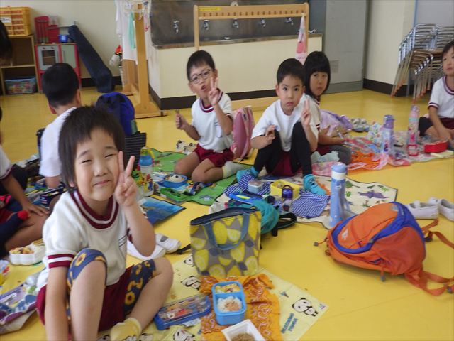 そのほかいつも通り黄色いカバン、はしセット、手提げの中にタオル、コップ歯ブラシを入れて持って来てください。給食は、幼稚園に帰って来てから食べたいと思います。