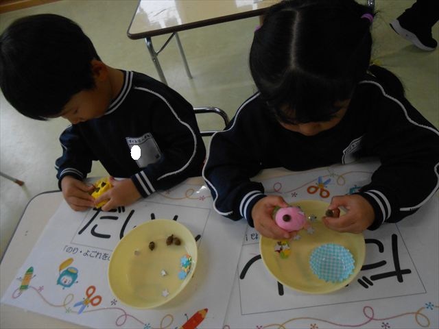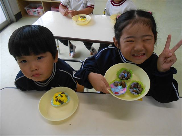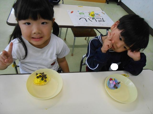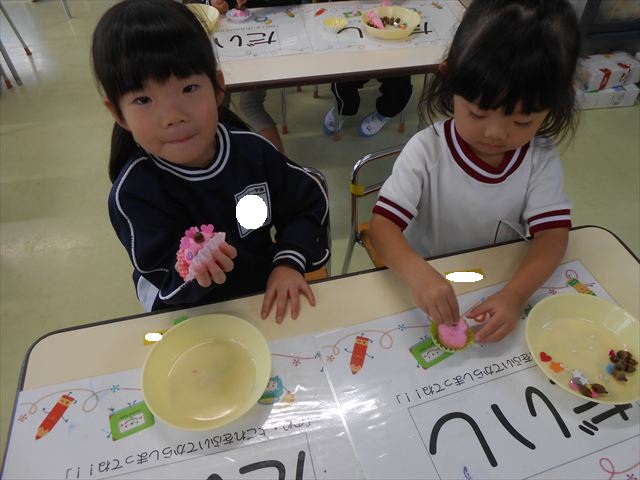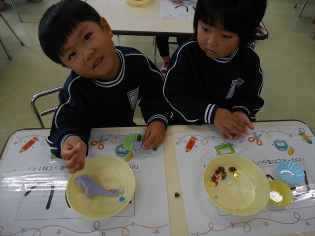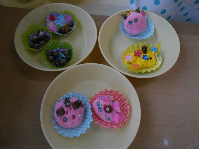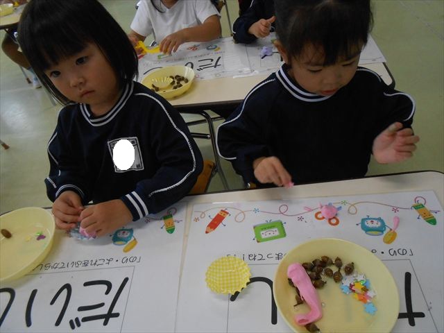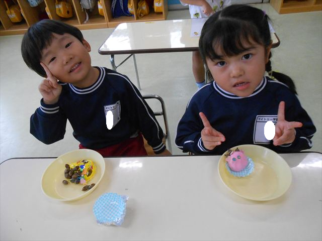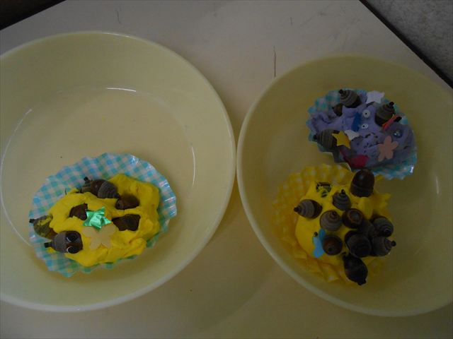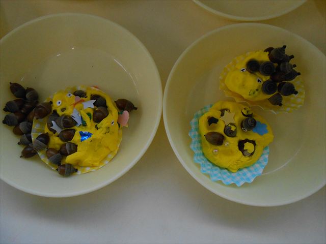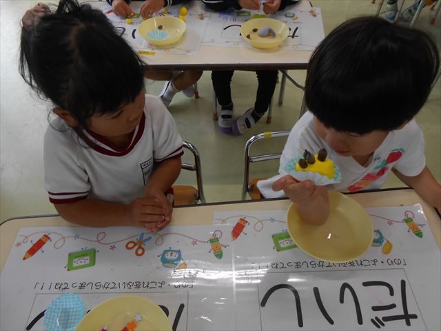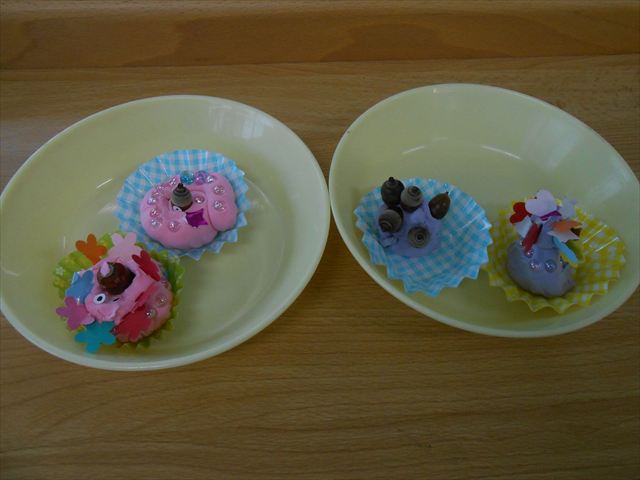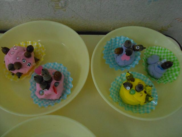 今日は、いもほり遠足に行けなかったので、どんぐり製作をしました(^O^)粘土とどんぐり、ビーズなどを使ってケーキ、飾り、怪獣などなど好きなものを作って楽しみました。どんぐりに目を付けると可愛くなり自分だけのすてきな作品が完成しました(