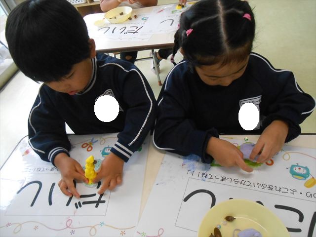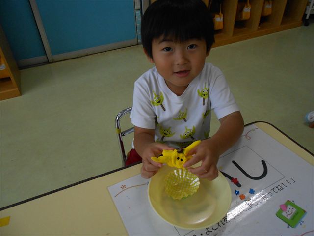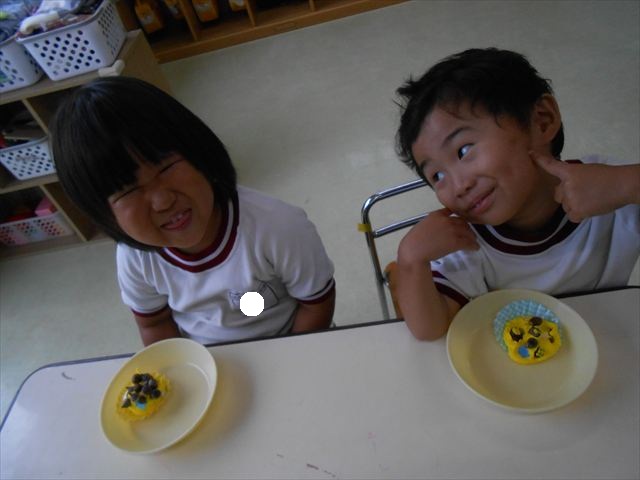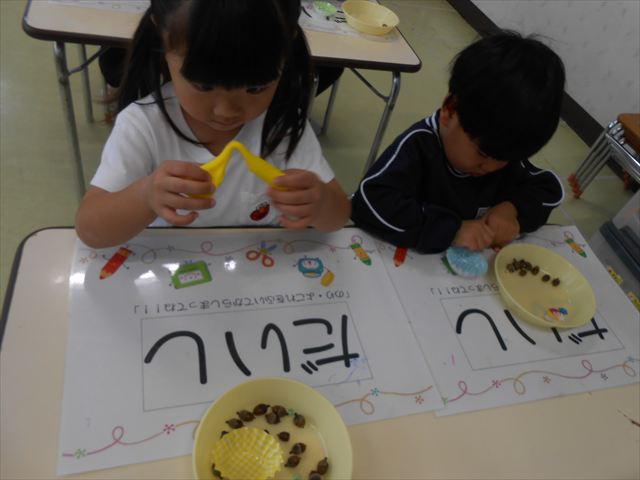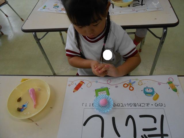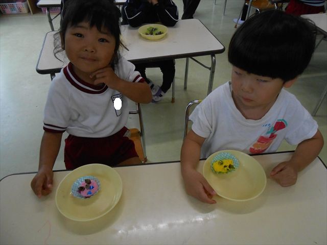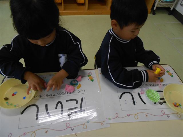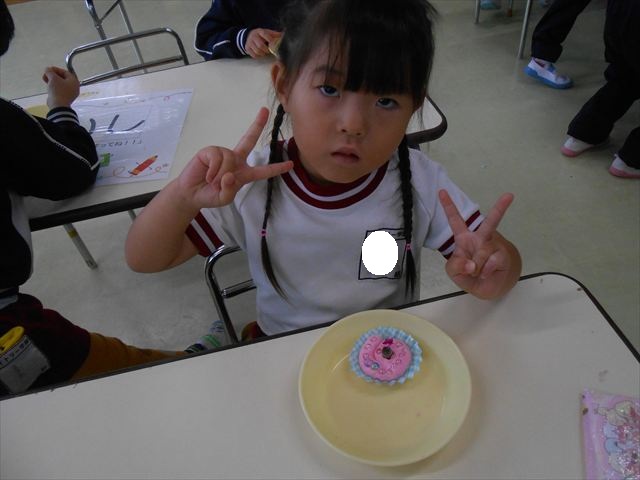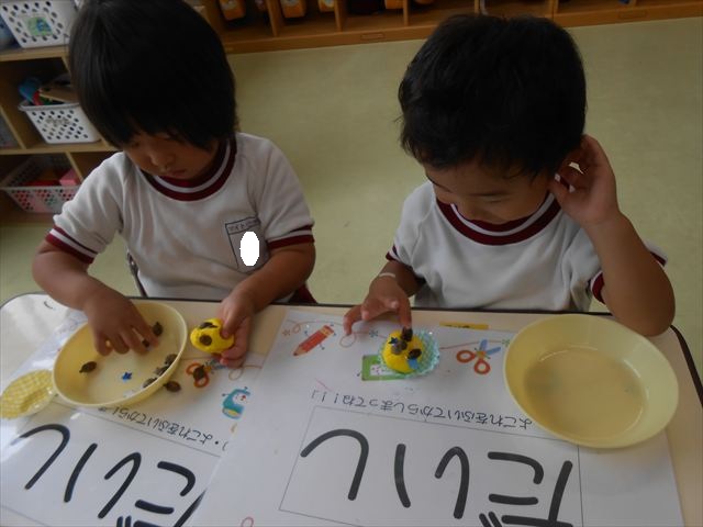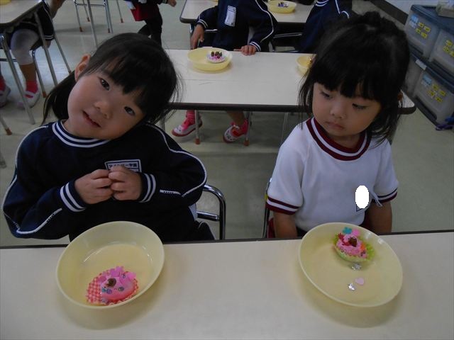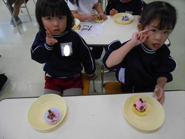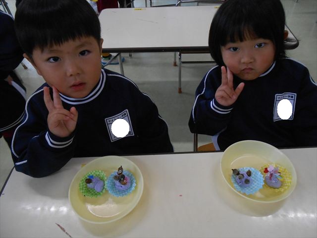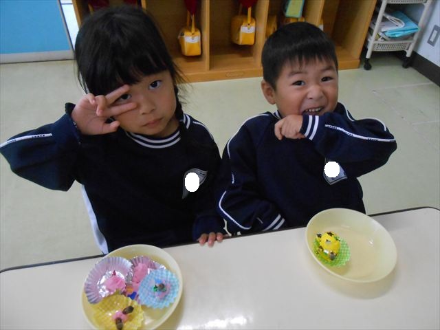 今日は、いもほり遠足に行けなかったので、どんぐり製作をしました(^O^)粘土とどんぐり、ビーズなどを使ってケーキ、飾り、怪獣などなど好きなものを作って楽しみました。どんぐりに目を付けると可愛くなり自分だけのすてきな作品が完成しました(