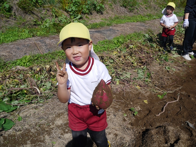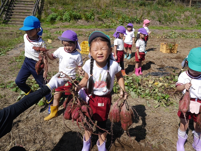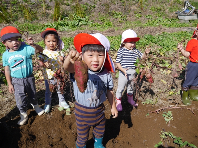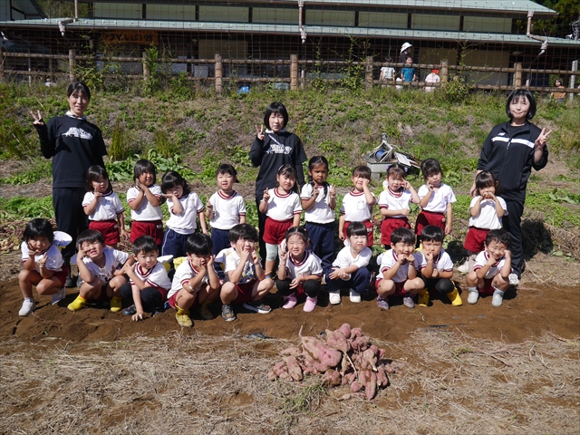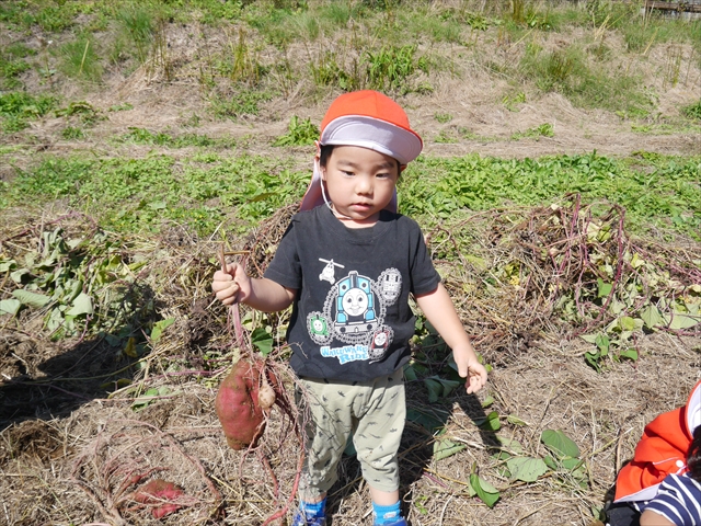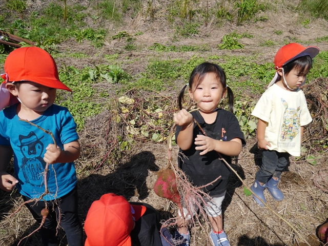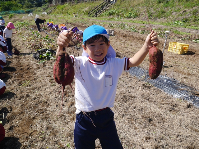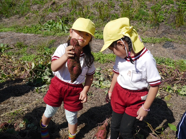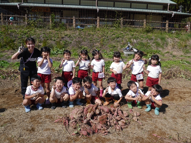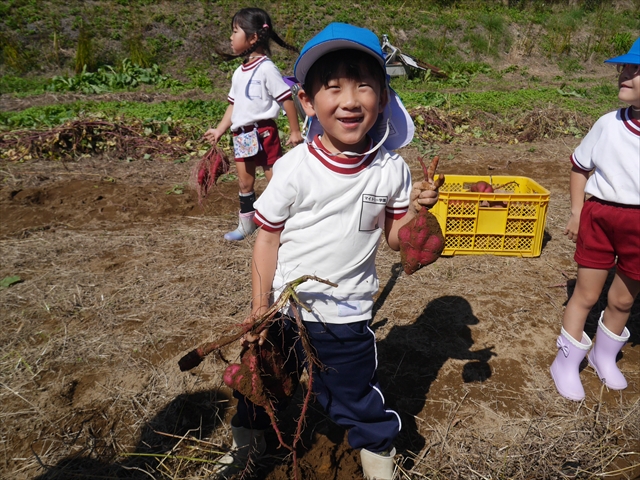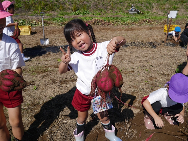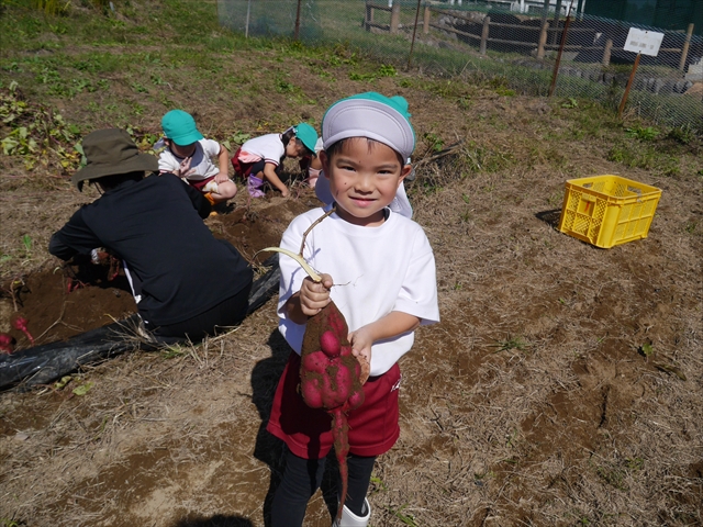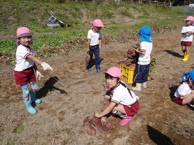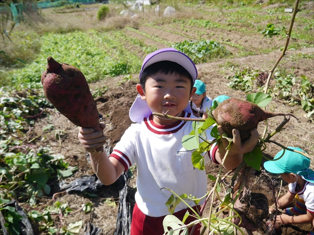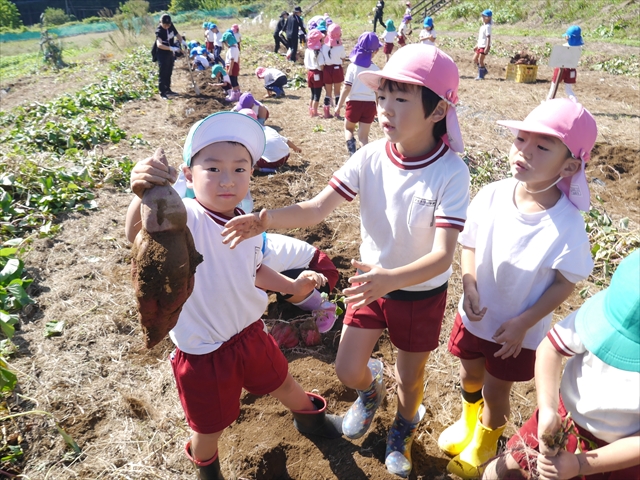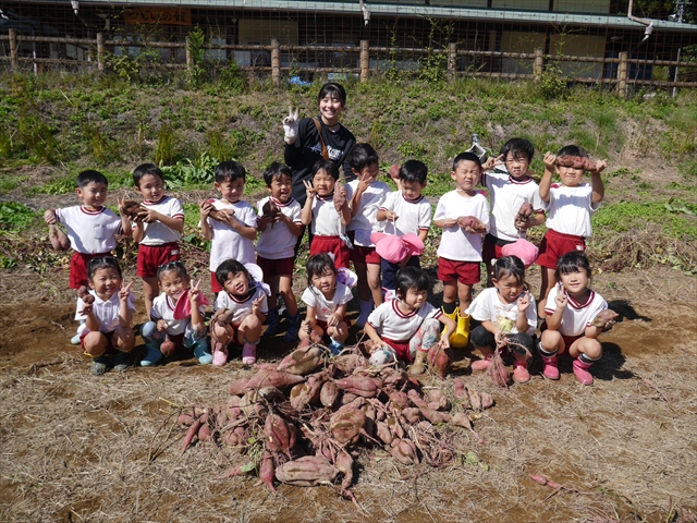 浅原体験村のさつまいも畑は、年少さんたちが5月に植え付けを行い、7月に雑草取りもしたので、成長がよく大きく育ちました。ただ、体験村の方の話だと今年は生育がいまひとつだそうです。しかし、芋の中には子どもたちの顔ぐらいの大きい芋もたくさんありました。とにかくおいしそうな大きい芋がたくさん収穫でて何よりでした。体験村からも購入した以上にたくさんサービスでおいもをいただきました!ヘ(^o^)/ 子どもたちみんな「芋掘り」の楽しい良い体験がいっぱいでき何よりでした。良かったね!(^_^)v 「芋掘り体験」が終わったあとは、体験村からのサービスで蒸かしたお芋をいただきました。みんな疲れてお腹も空いたので、より美味しかったようです!(^_^)b 収穫したさつまいもは来週から全学年で「焼きいも作り・食事会」を行い、おいしい焼きいもをいっぱい食べる予定です。また、年中さんたちは、おじいさん・おばあさんを招待して「さつまいも収穫祭・祖父母交流会」を実施する予定ですし、年長さんたちは「さつまいも料理教室」も行います!楽しみだね~!いっぱい食べてね。 ヘ(^o^)/ (^_^)v