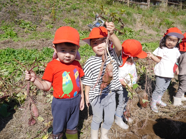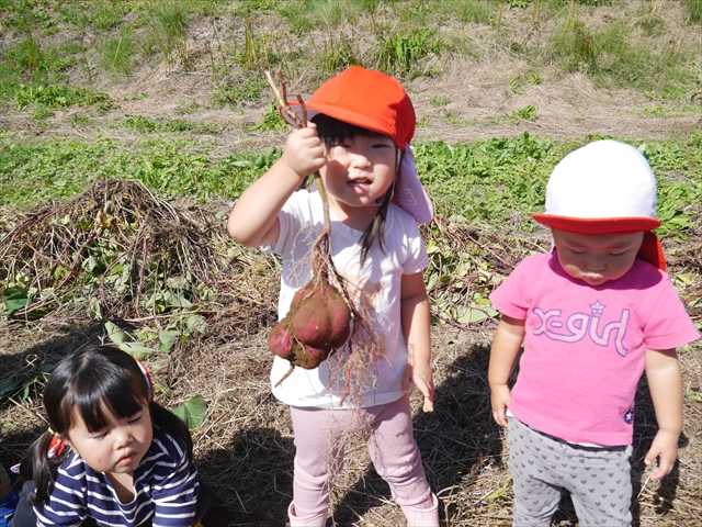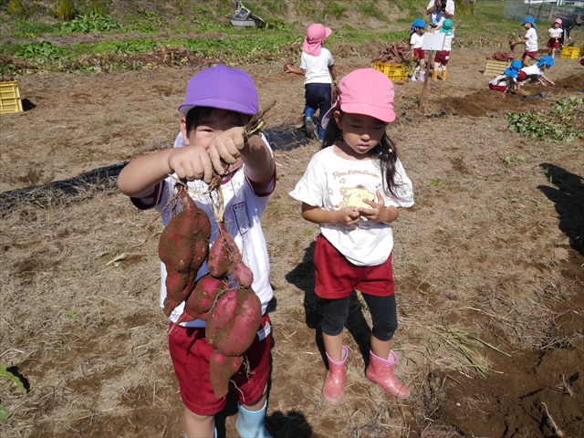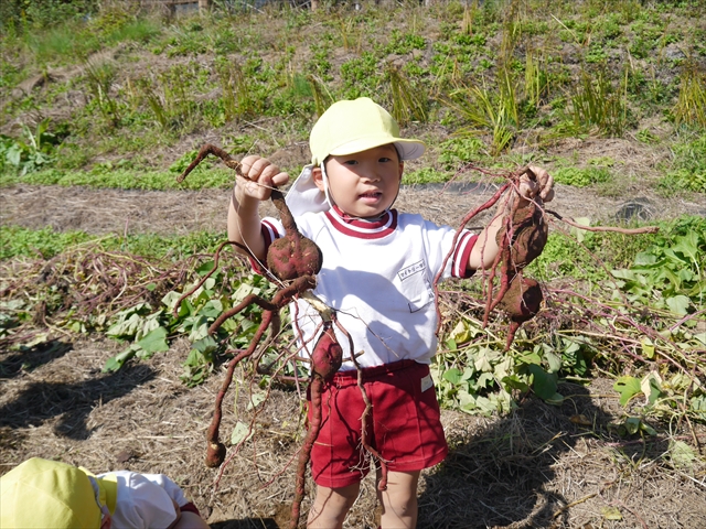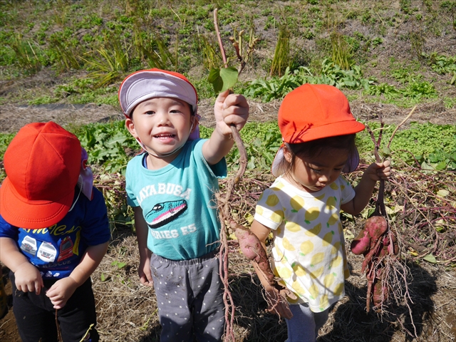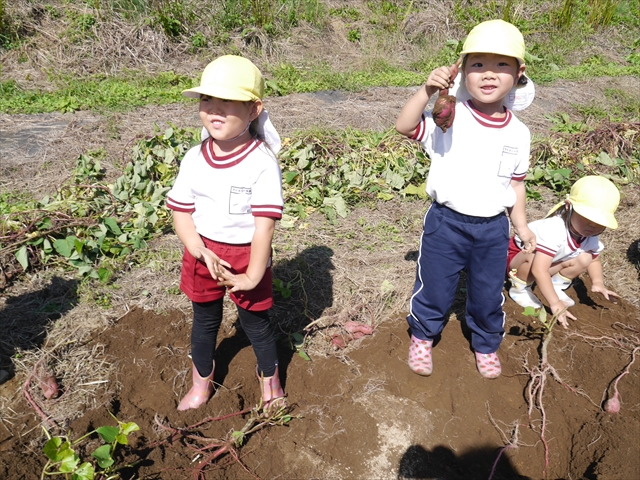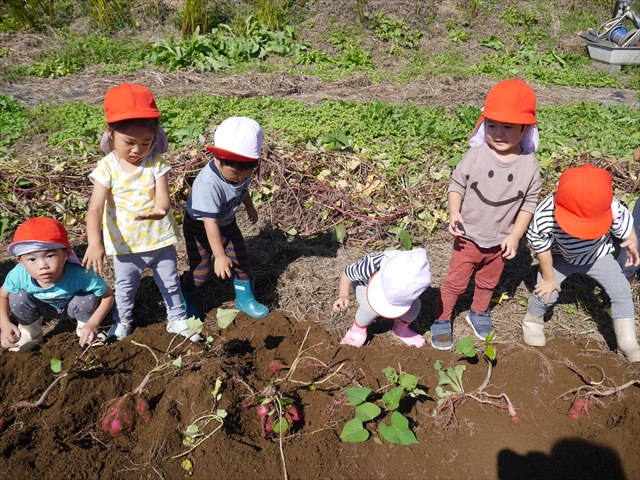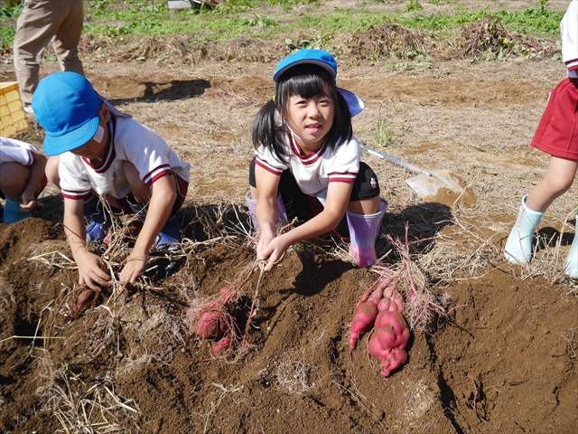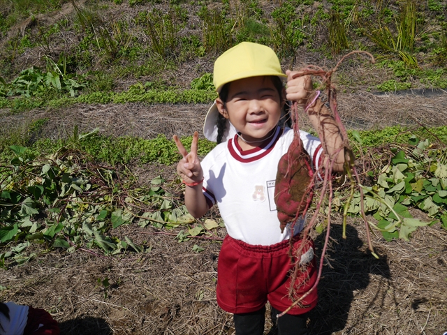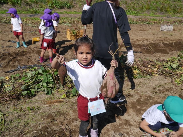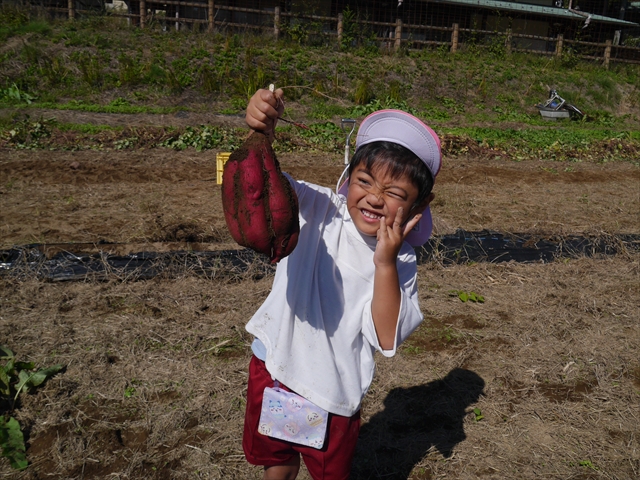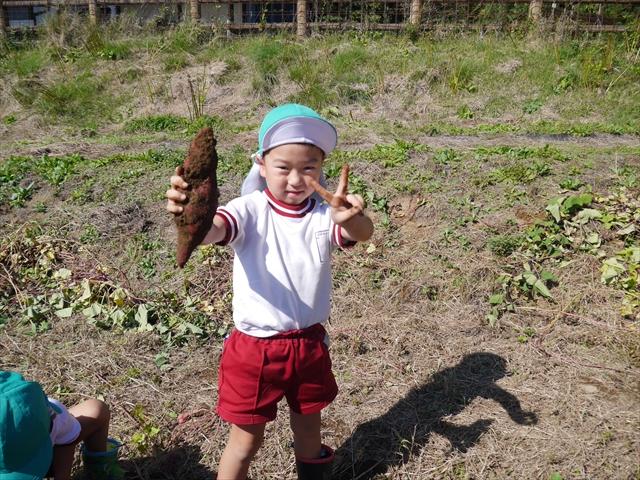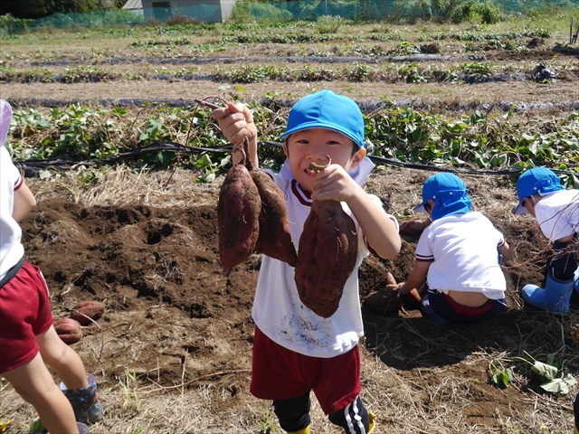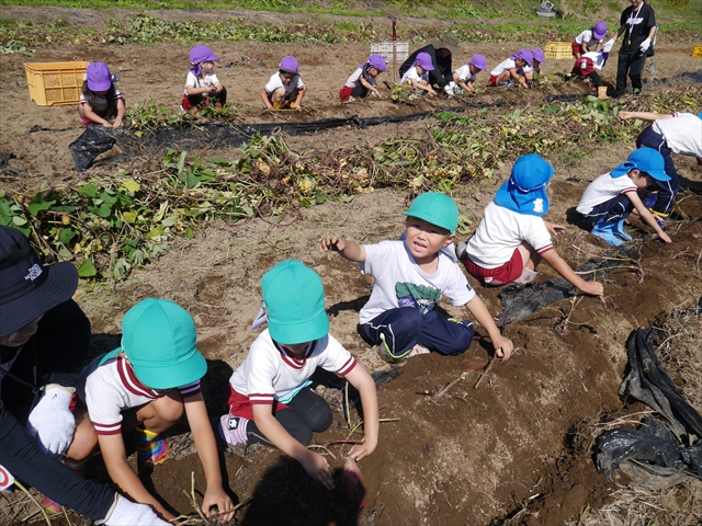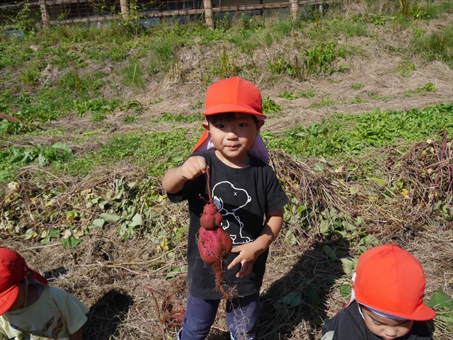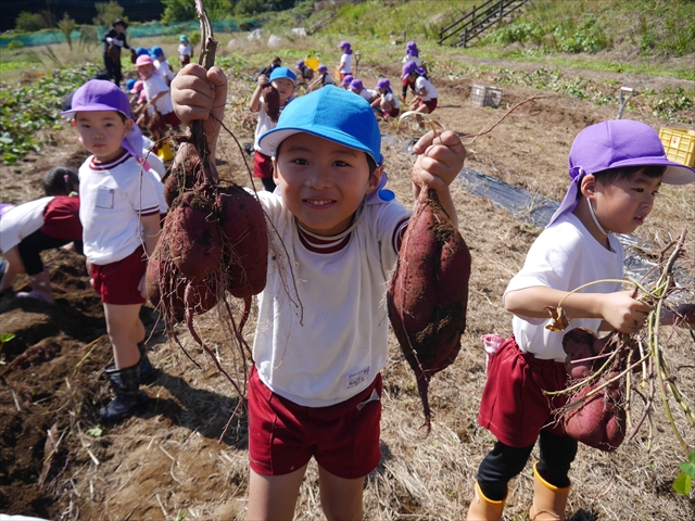 浅原体験村のさつまいも畑は、年少さんたちが5月に植え付けを行い、7月に雑草取りもしたので、成長がよく大きく育ちました。ただ、体験村の方の話だと今年は生育がいまひとつだそうです。しかし、芋の中には子どもたちの顔ぐらいの大きい芋もたくさんありました。とにかくおいしそうな大きい芋がたくさん収穫でて何よりでした。体験村からも購入した以上にたくさんサービスでおいもをいただきました!ヘ(^o^)/ 子どもたちみんな「芋掘り」の楽しい良い体験がいっぱいでき何よりでした。良かったね!(^_^)v 「芋掘り体験」が終わったあとは、体験村からのサービスで蒸かしたお芋をいただきました。みんな疲れてお腹も空いたので、より美味しかったようです!(^_^)b 収穫したさつまいもは来週から全学年で「焼きいも作り・食事会」を行い、おいしい焼きいもをいっぱい食べる予定です。また、年中さんたちは、おじいさん・おばあさんを招待して「さつまいも収穫祭・祖父母交流会」を実施する予定ですし、年長さんたちは「さつまいも料理教室」も行います!楽しみだね~!いっぱい食べてね。 ヘ(^o^)/ (^_^)v