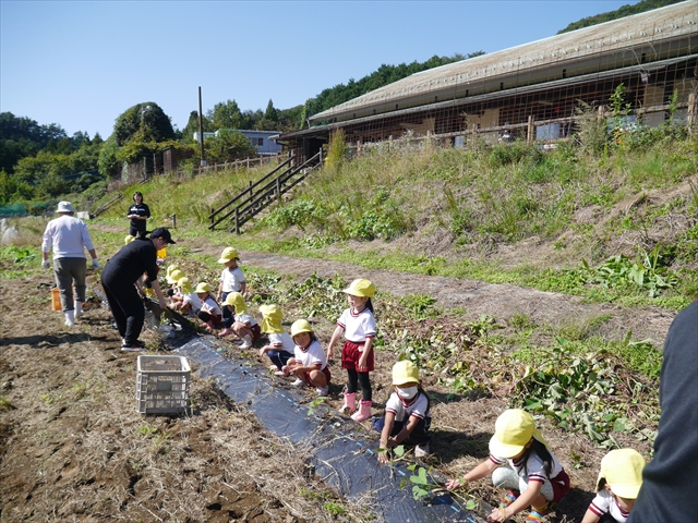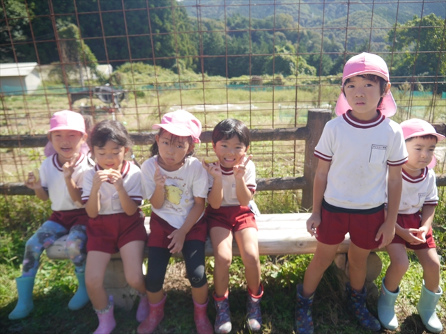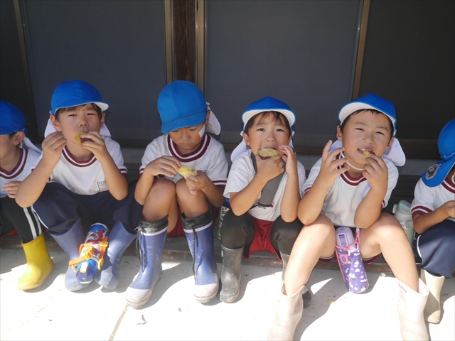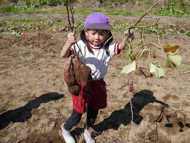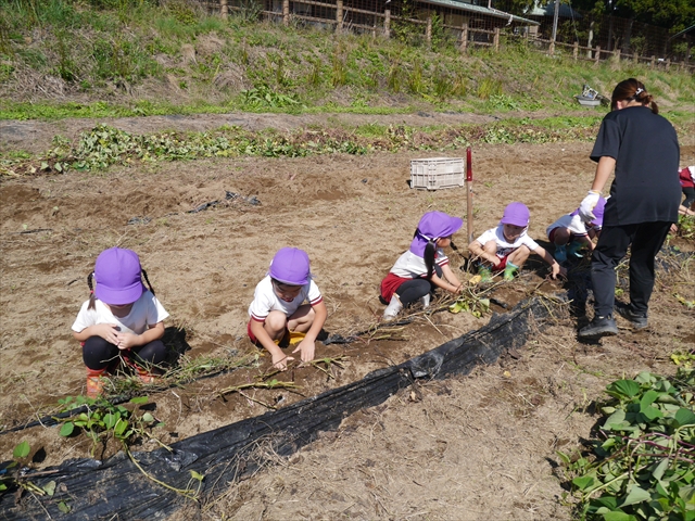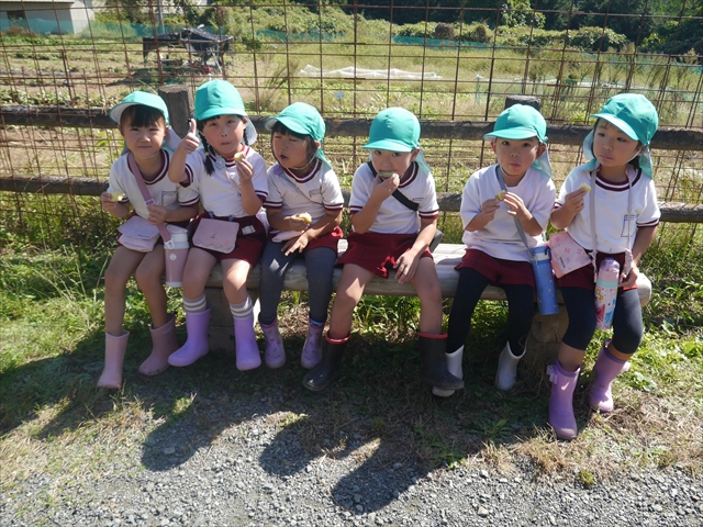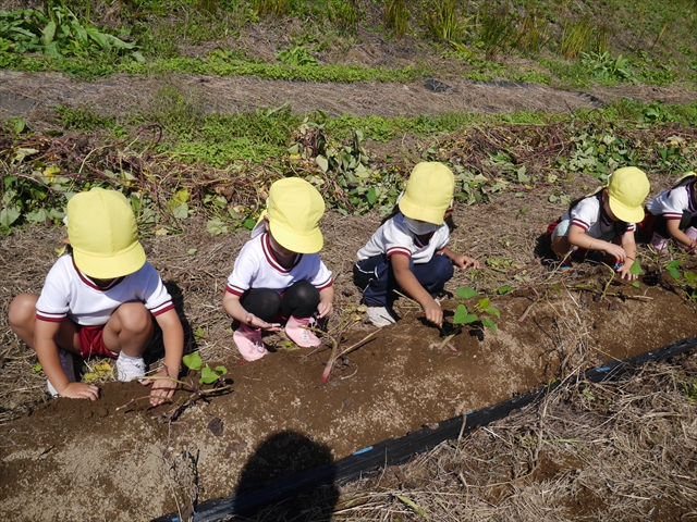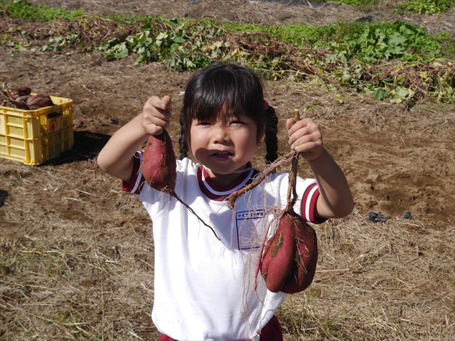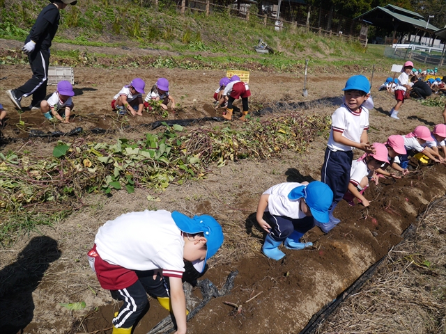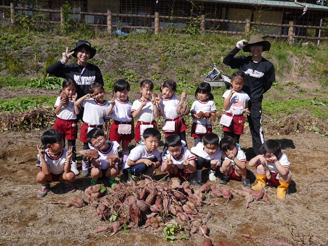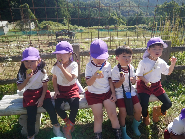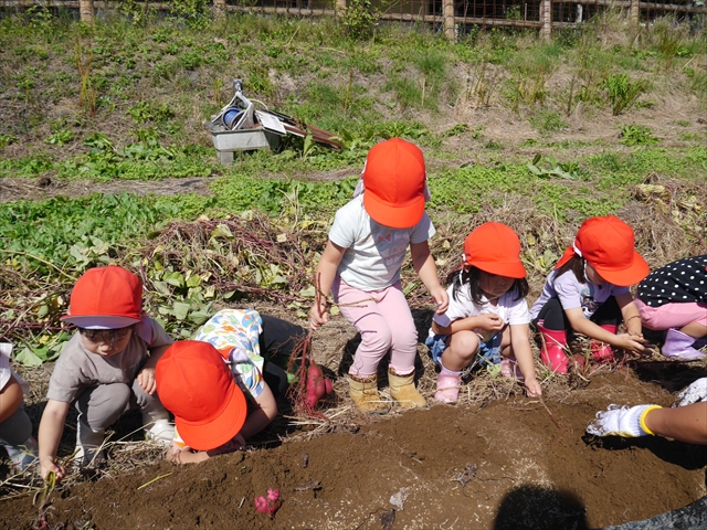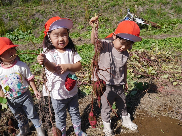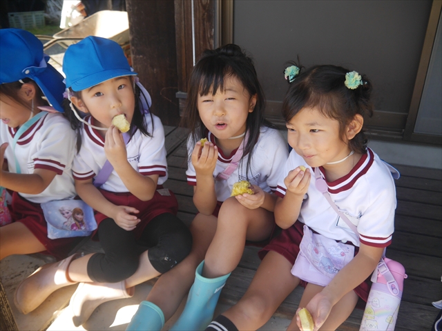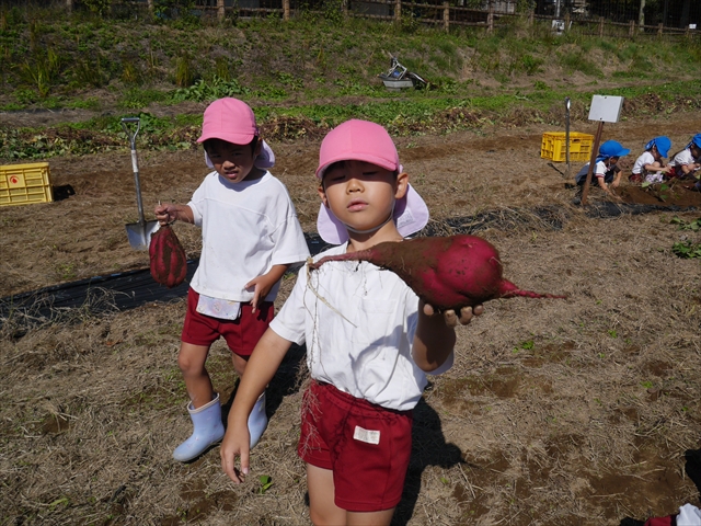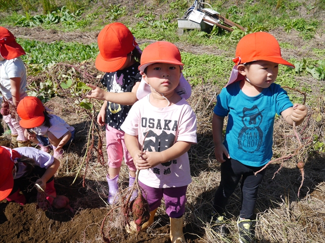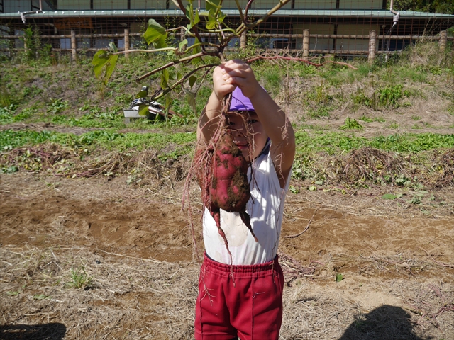 浅原体験村のさつまいも畑は、年少さんたちが5月に植え付けを行い、7月に雑草取りもしたので、成長がよく大きく育ちました。ただ、体験村の方の話だと今年は生育がいまひとつだそうです。しかし、芋の中には子どもたちの顔ぐらいの大きい芋もたくさんありました。とにかくおいしそうな大きい芋がたくさん収穫でて何よりでした。体験村からも購入した以上にたくさんサービスでおいもをいただきました!ヘ(^o^)/ 子どもたちみんな「芋掘り」の楽しい良い体験がいっぱいでき何よりでした。良かったね!(^_^)v 「芋掘り体験」が終わったあとは、体験村からのサービスで蒸かしたお芋をいただきました。みんな疲れてお腹も空いたので、より美味しかったようです!(^_^)b 収穫したさつまいもは来週から全学年で「焼きいも作り・食事会」を行い、おいしい焼きいもをいっぱい食べる予定です。また、年中さんたちは、おじいさん・おばあさんを招待して「さつまいも収穫祭・祖父母交流会」を実施する予定ですし、年長さんたちは「さつまいも料理教室」も行います!楽しみだね~!いっぱい食べてね。 ヘ(^o^)/ (^_^)v