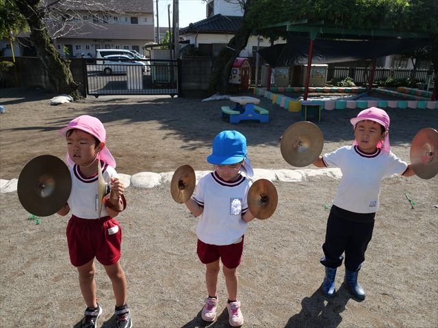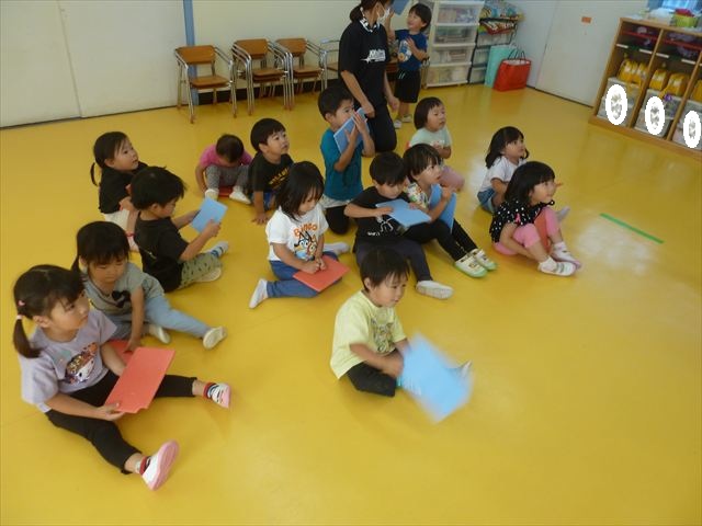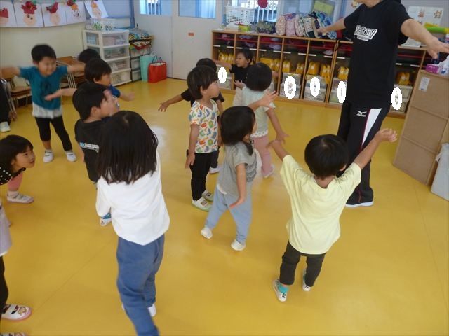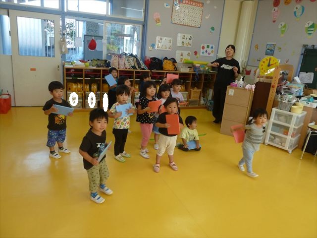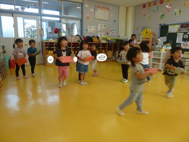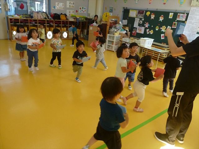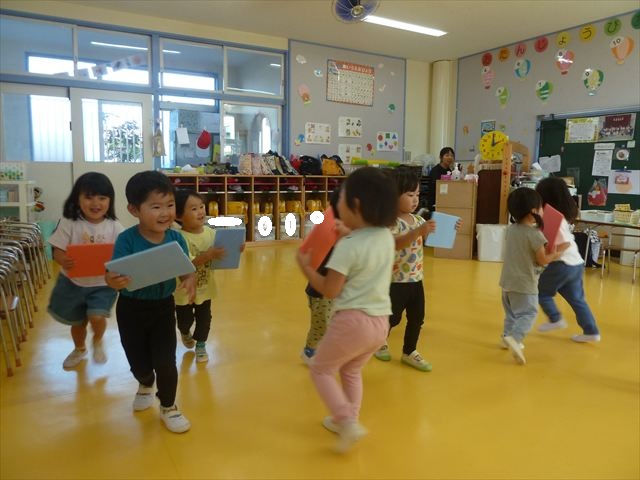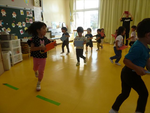 幼稚園に帰ってきて、午後はA組さんがリトミックをしました。おおきく3つのリズムはもう完璧です☆「今日バスに乗ってお出かけしたから、みんなも車運転しちゃおう!」と、ボードを持ってお出かけしました。赤は止まる、青は進むを、先生の信号をよく見て楽しんでいました!(^^)!ウッドブロックの音もよく聴いて、上手にお引越しできました。ともえ先生、ありがとうございました♪