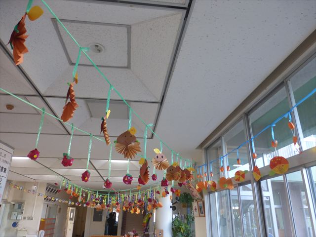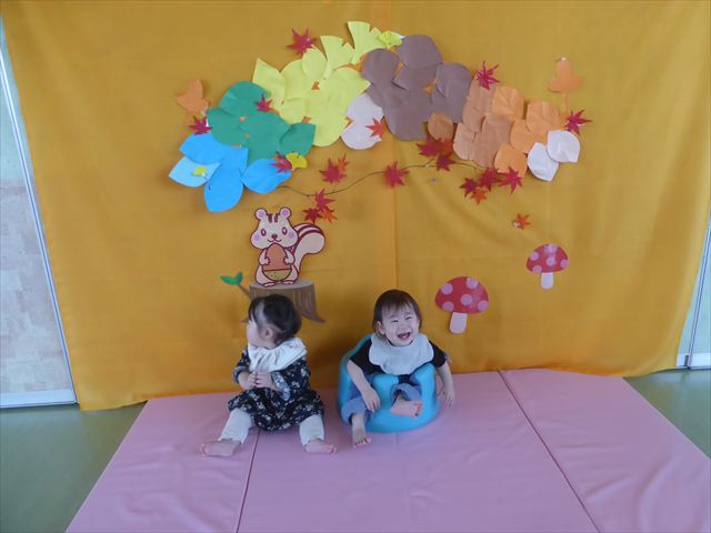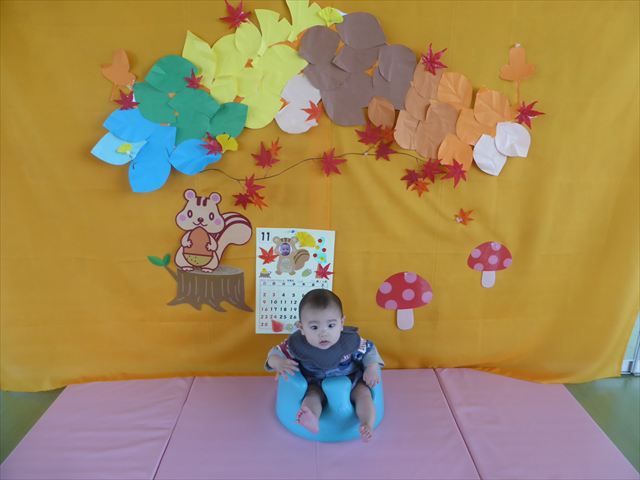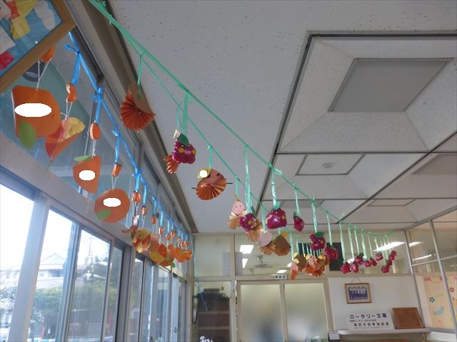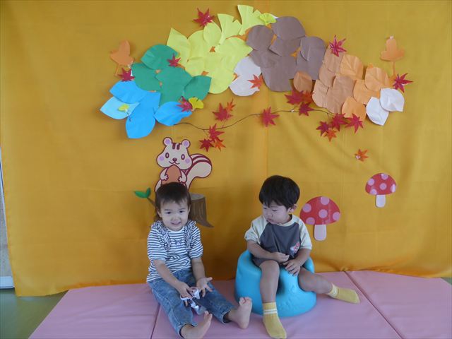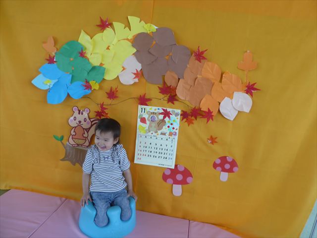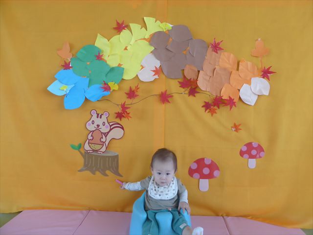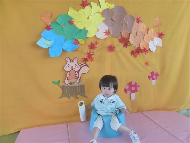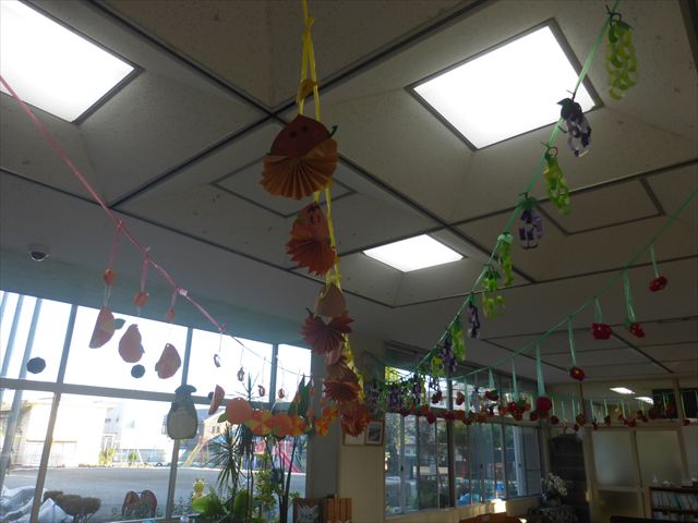 ホール飾りが新しくなりました!テーマは「秋の食べ物」です。年長さんはくり、年中さんはみかん、年少さんはぶどう、たんぽぽさんはりんごを作りました♪来園した際はぜひご覧ください!
