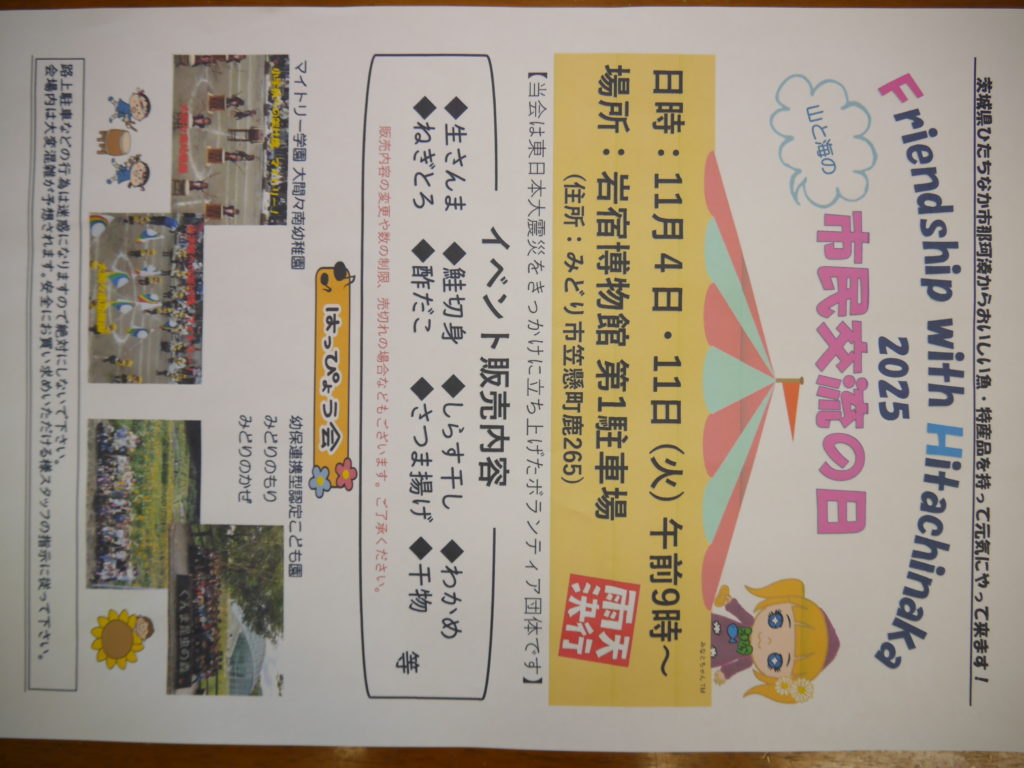 11月4日(火)、11日(火)の「ひたちなか市との市民交流の日」イベントに、年中さん・年長さんが参加します。お買い物がてら、是非応援にいらして下さい!(^_^)v ヘ(^o^)/