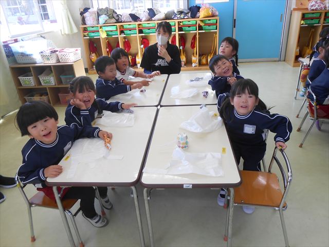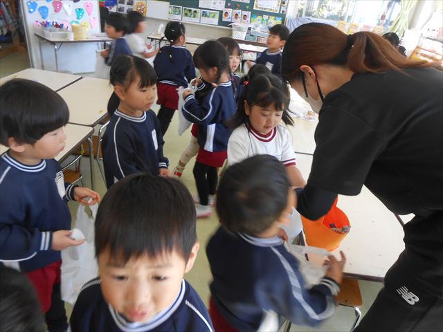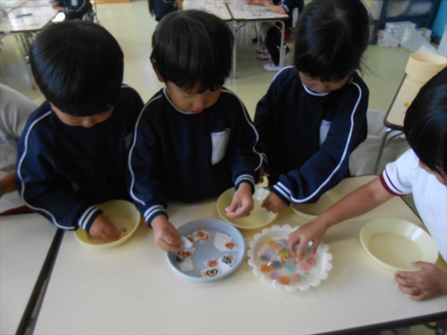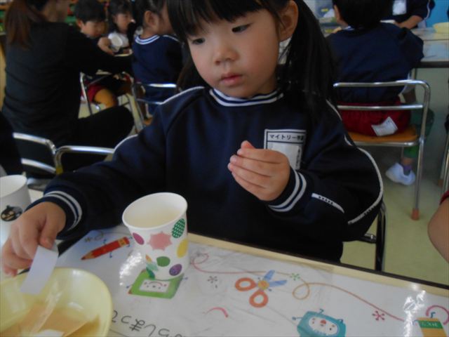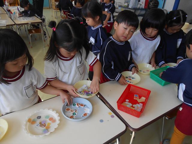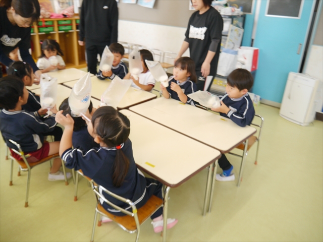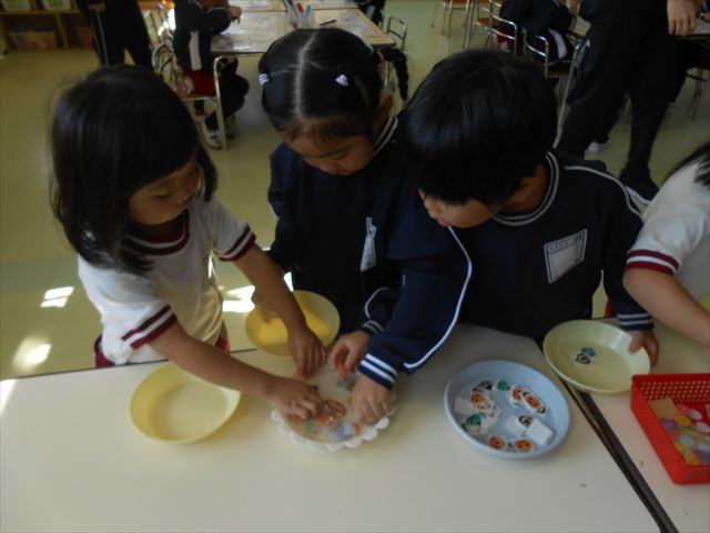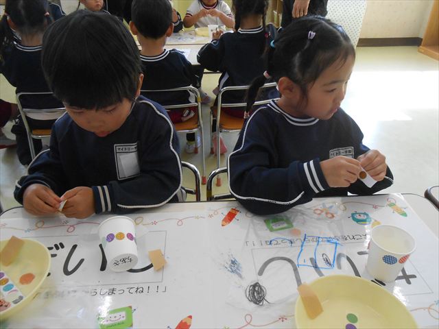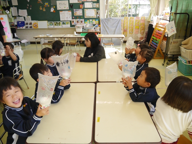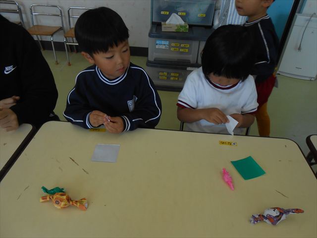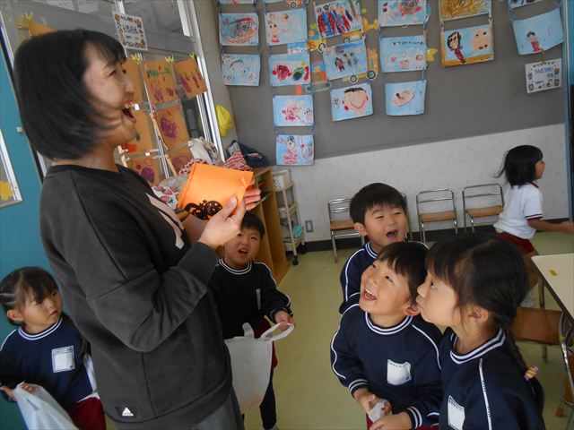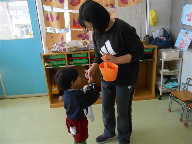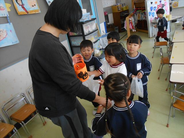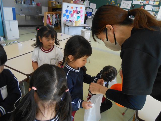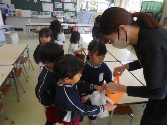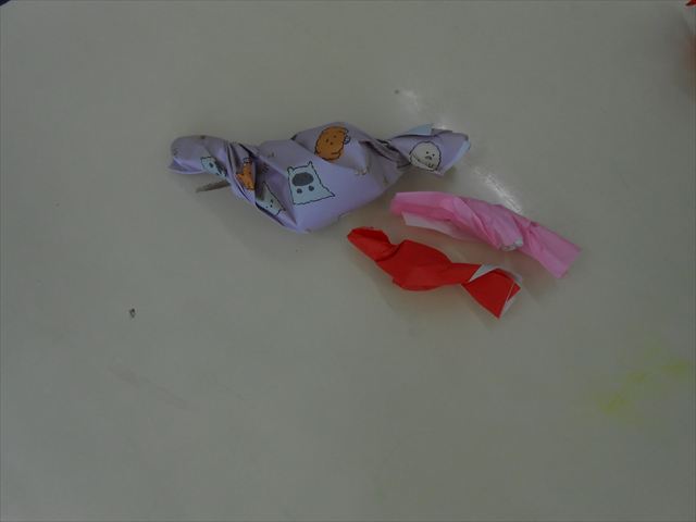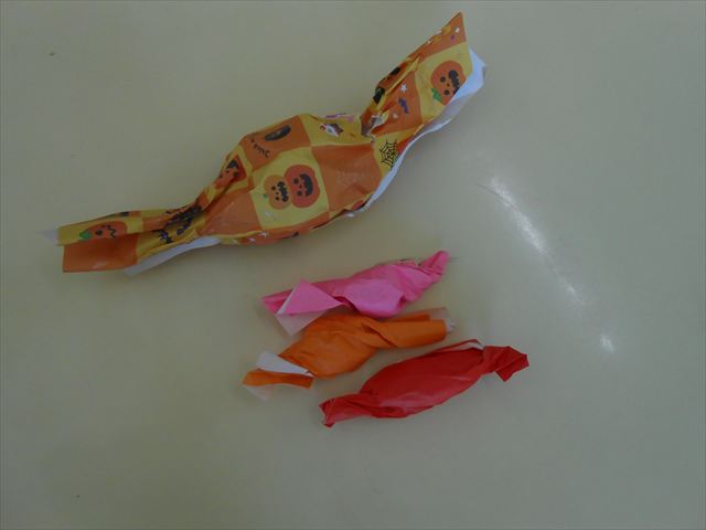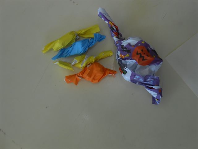 今月は、ハロウィンと言うことでおばけを作ったりキャンディを作ったりしてハロウィンを味わえたらと思い計画しました。まず、紙コップ、ビニール袋、ストローを使って飛び出すおばけを作りました。まず、見せるとうわぁ~と歓声が上がり盛り上がった年少さんでした。実際に作り始めるとお友だちとお話しする子もいれば黙々と作る子もいて楽しく、作ることができました。紙コップには、自分の好きなシールを貼って飾ったので嬉しそうでした。みんなで一斉にストローをふーと吹くともくもくもくとおばけが出てきて大喜びでした。その後は、折り紙を使ってキャンディ作りをしました。たくさん作ったキャンディを先生たちに「トリックオアトリート」と言ってもらってハロウィンを味わいました(^^)本日持ち帰りましたのでご家庭でも遊んでいただけると嬉しいです\(^o^)/