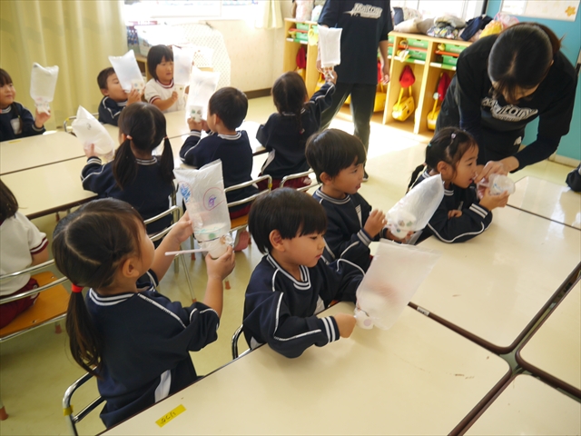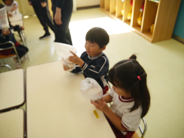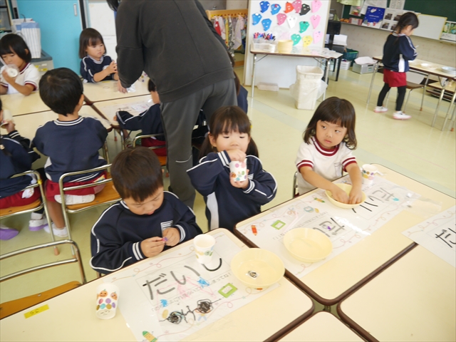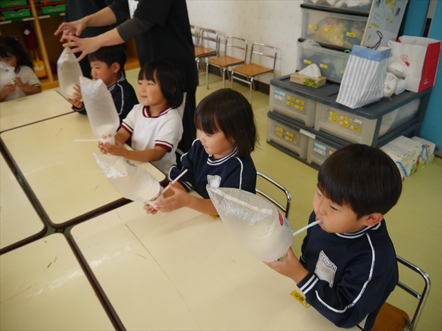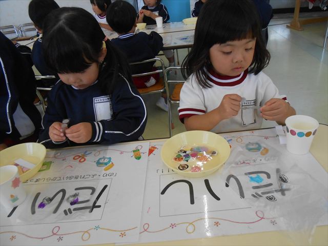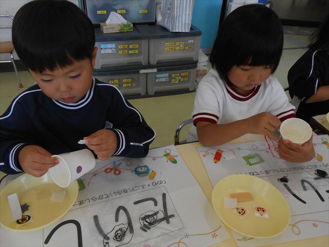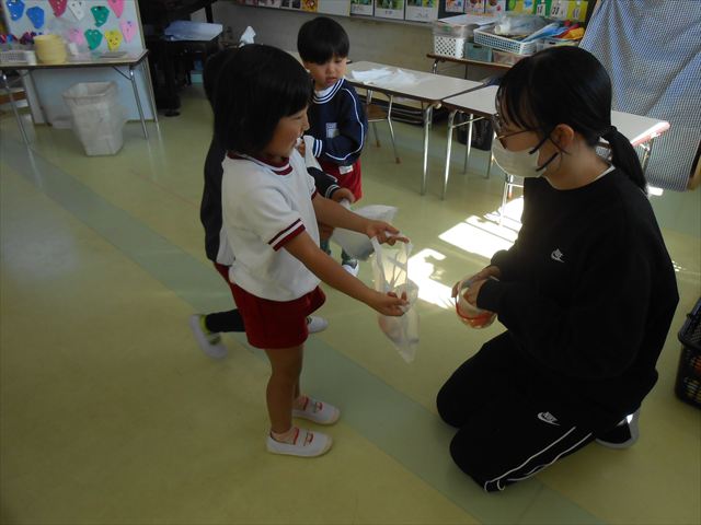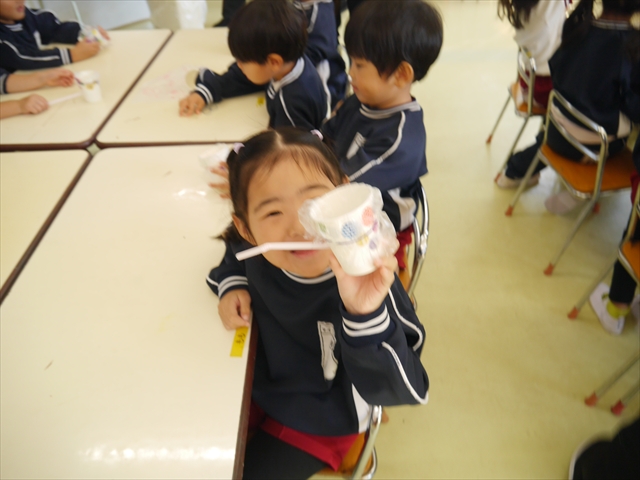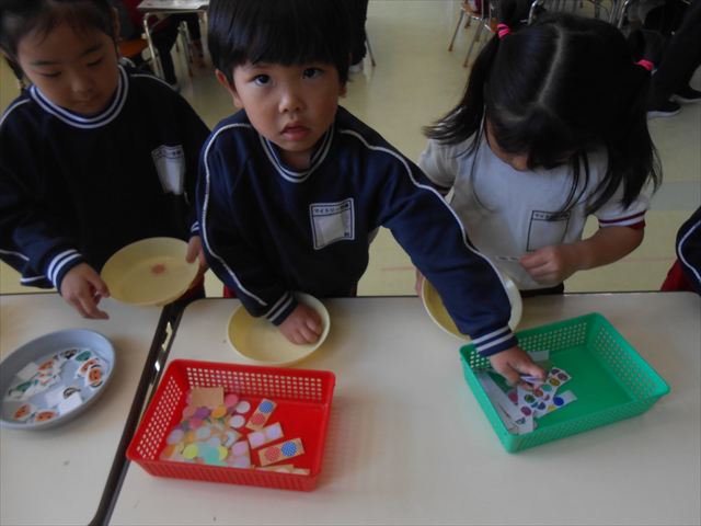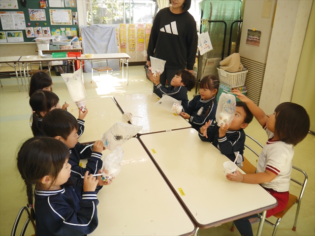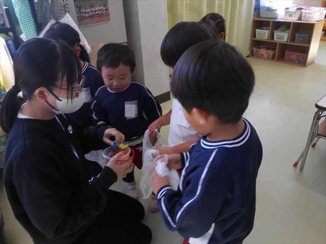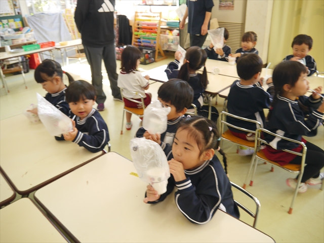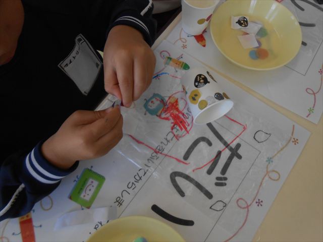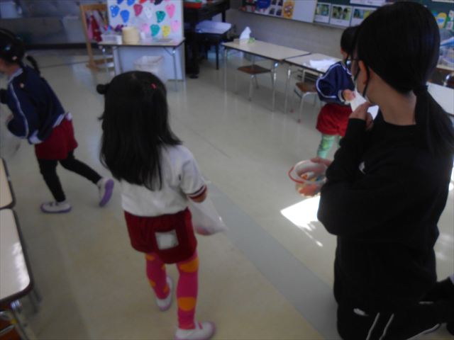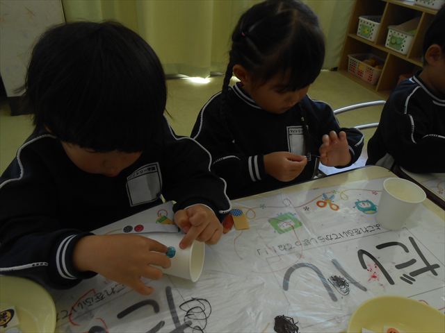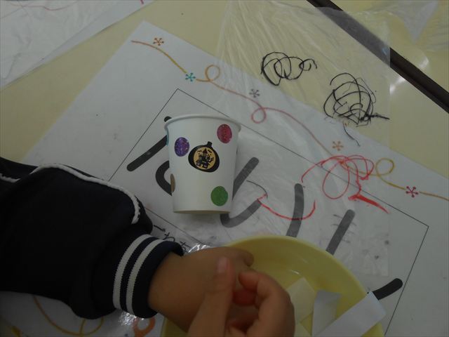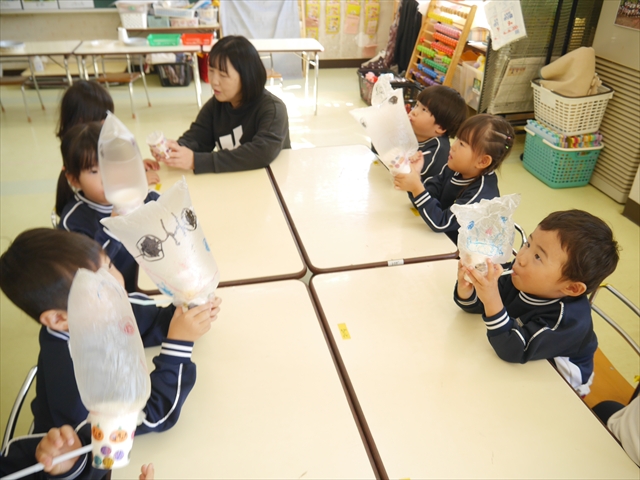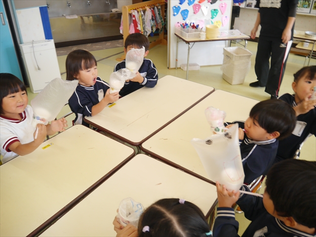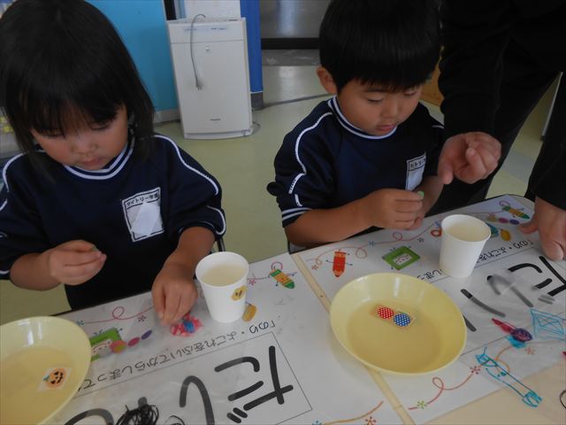 今月は、ハロウィンと言うことでおばけを作ったりキャンディを作ったりしてハロウィンを味わえたらと思い計画しました。まず、紙コップ、ビニール袋、ストローを使って飛び出すおばけを作りました。まず、見せるとうわぁ~と歓声が上がり盛り上がった年少さんでした。実際に作り始めるとお友だちとお話しする子もいれば黙々と作る子もいて楽しく、作ることができました。紙コップには、自分の好きなシールを貼って飾ったので嬉しそうでした。みんなで一斉にストローをふーと吹くともくもくもくとおばけが出てきて大喜びでした。その後は、折り紙を使ってキャンディ作りをしました。たくさん作ったキャンディを先生たちに「トリックオアトリート」と言ってもらってハロウィンを味わいました(^^)本日持ち帰りましたのでご家庭でも遊んでいただけると嬉しいです\(^o^)/