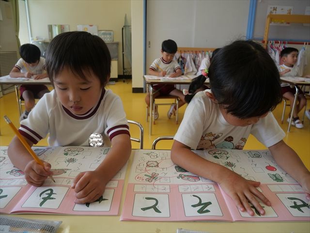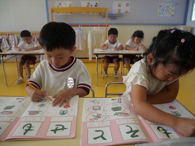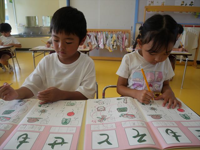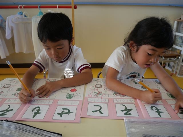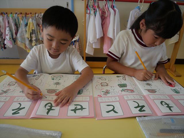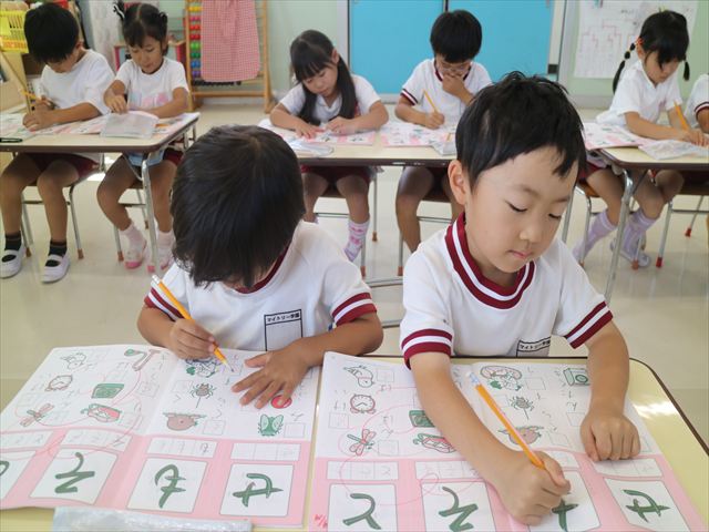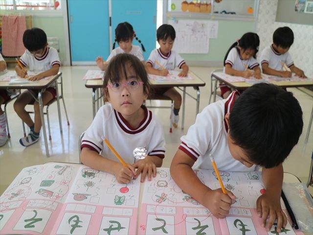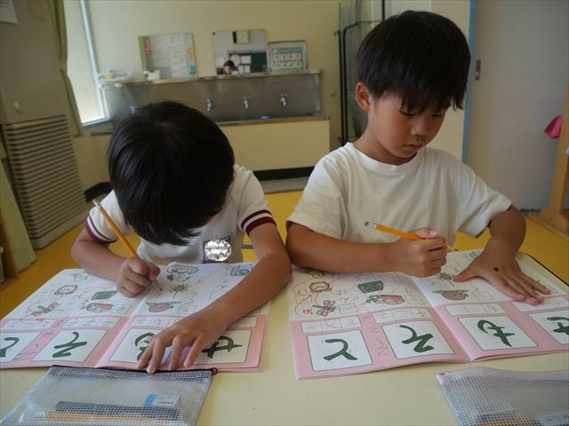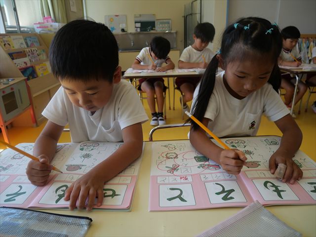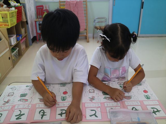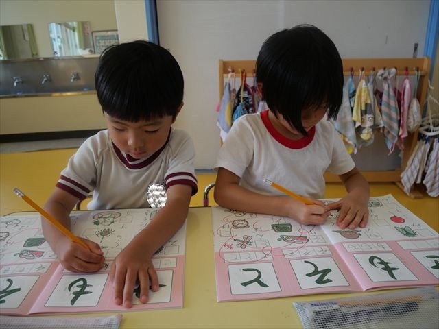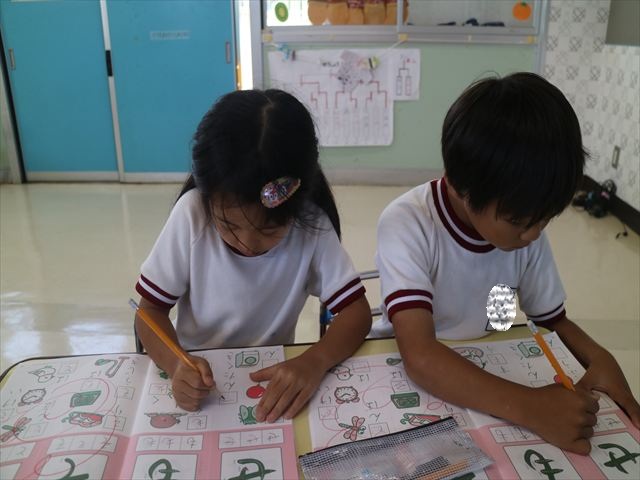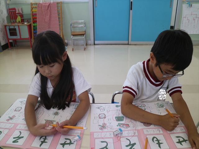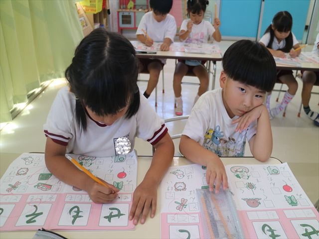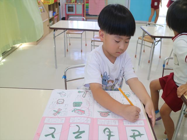 国語の時間でワークをしました。今日は「も」と「せ」を練習しました。はねる所や左右どちらにはらうのかなどポイントを意識しながら取り組めました。
