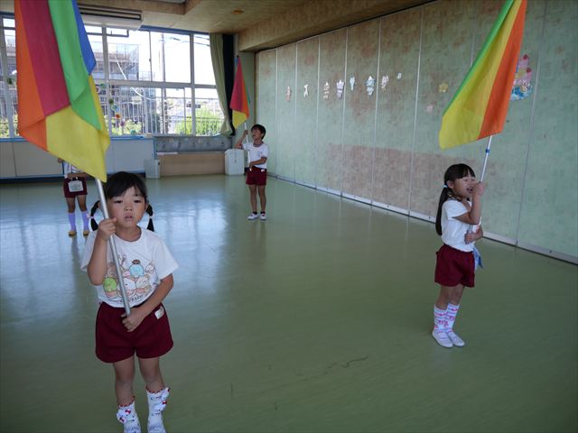 今日も元気に運動会の練習です!暑い中でしたが、ぐずらず最後までよく頑張りました!(^^)!エビカニクスは、本番と同じようにお面をかぶって練習してみました。お面があるとやる気もアップしていたお友だちでした!その後はかけっこの練習。「よーい」のときに園長先生が「たんぽぽさん!かまえて!」と言ってくれたので、いい姿勢からスタートできました!いよいよ明日は最後の練習です。土曜日はおうちの人にかっこいい姿をお見せできるよう、明日も練習頑張ります☆