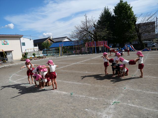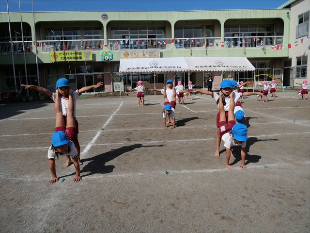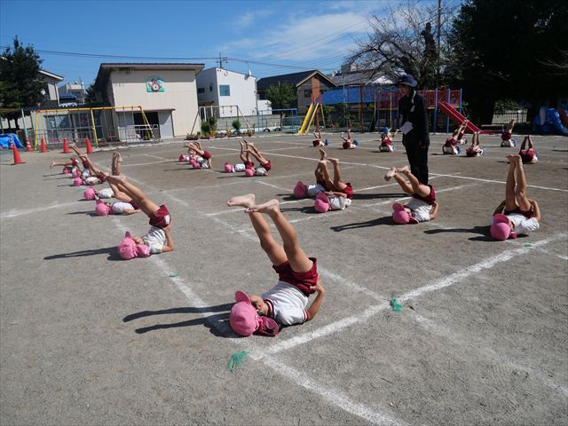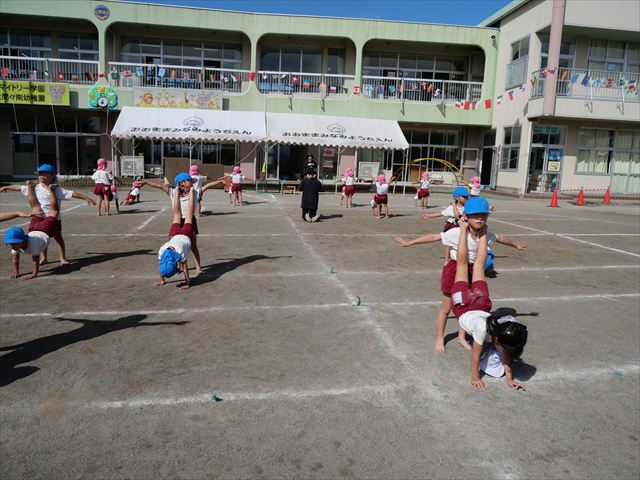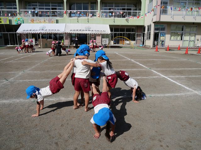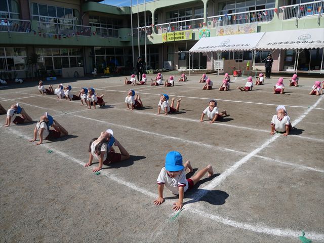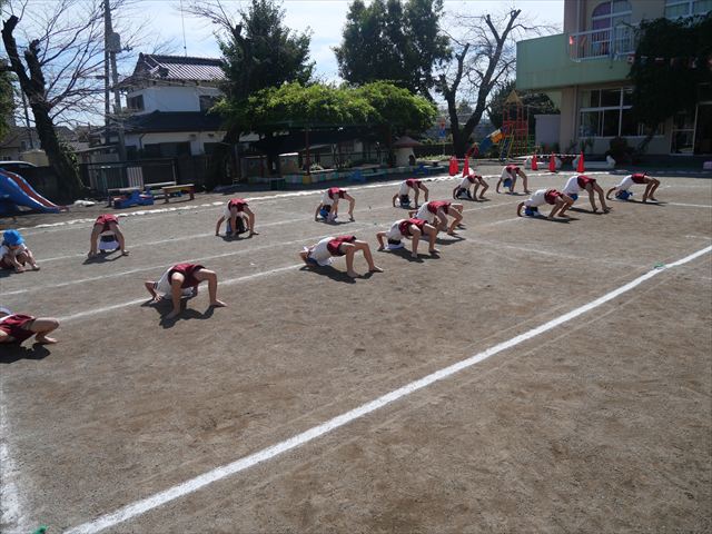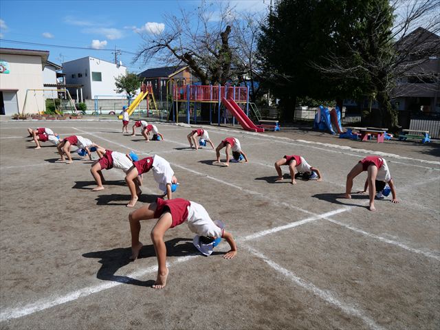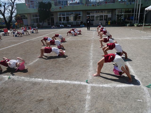 今日の運動教室は戸外で運動会の練習を行う予定でしたが、雨が降っていたため遊戯室で行いました。跳び箱と、倒立をクラスごとに分かれて何度も練習していきました。両方ともだいぶ上手になってきました。次に障害物競争の様にコースを作ってさくら組vsつつじ組で競争して楽しみました。最後の氷鬼もとても楽しそうに遊んでいました。
