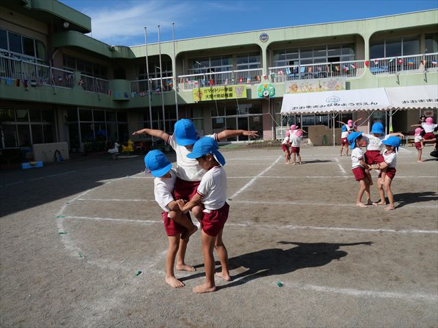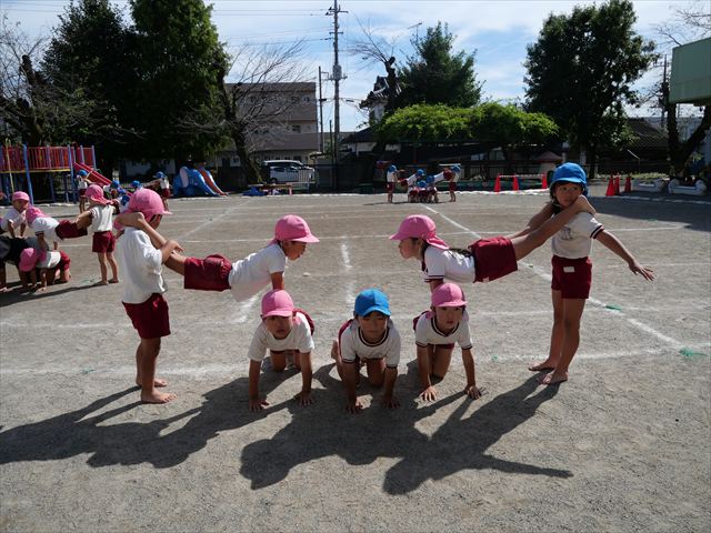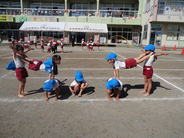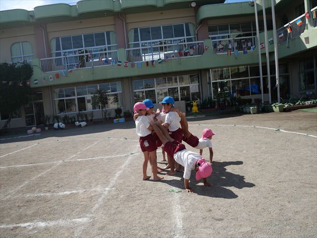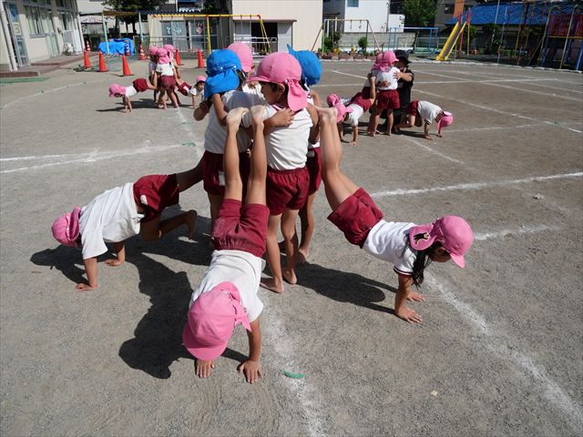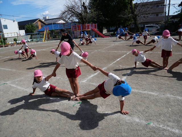 組体操をしました。立ち位置、タイミングを確認しながら行いました。初めより確実に上手になってきています!暑さに負けず今日もよく頑張りました!