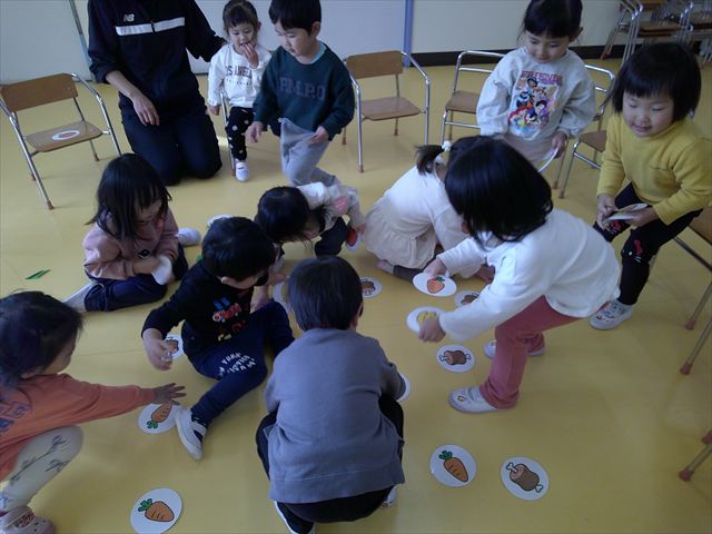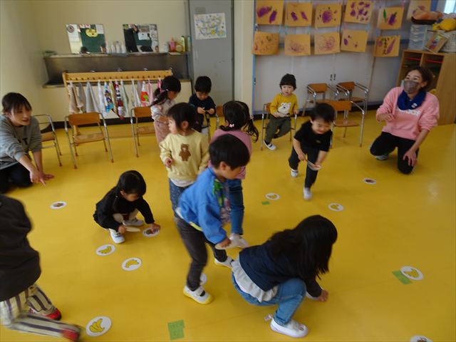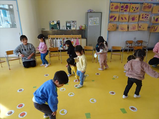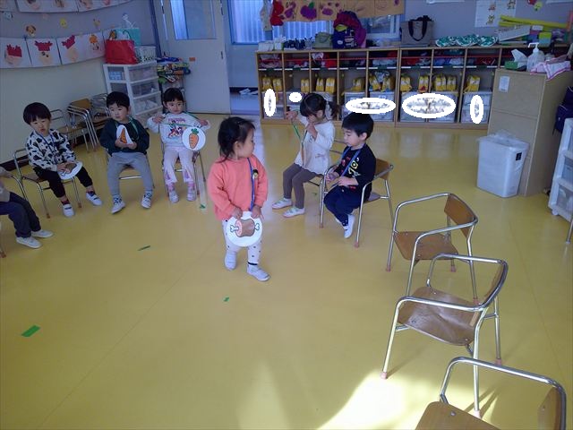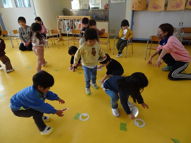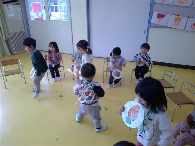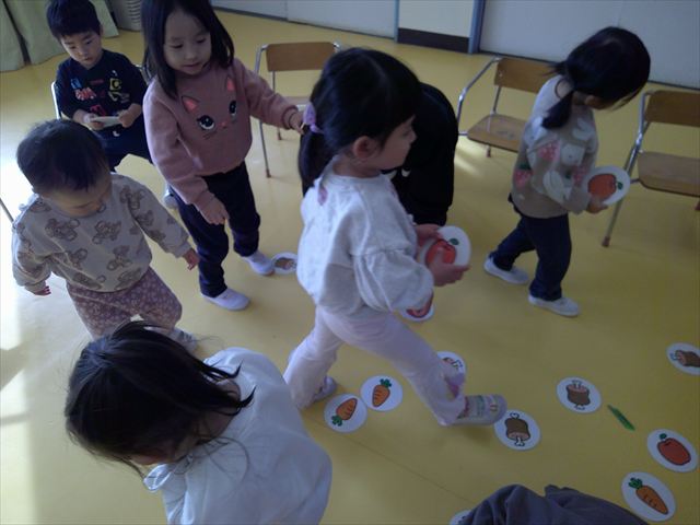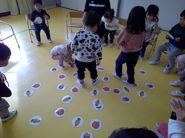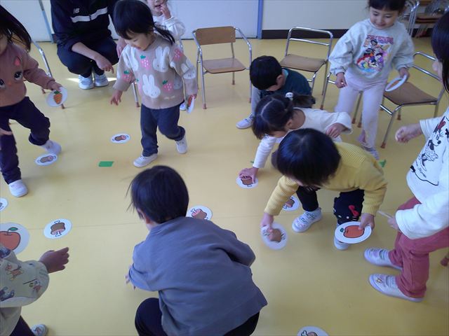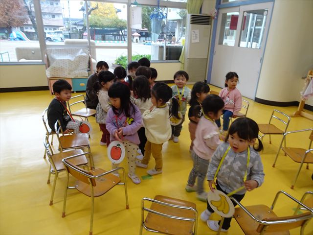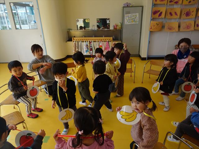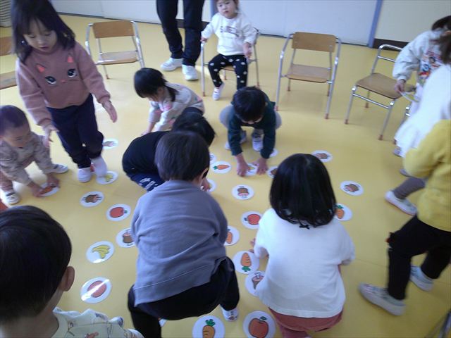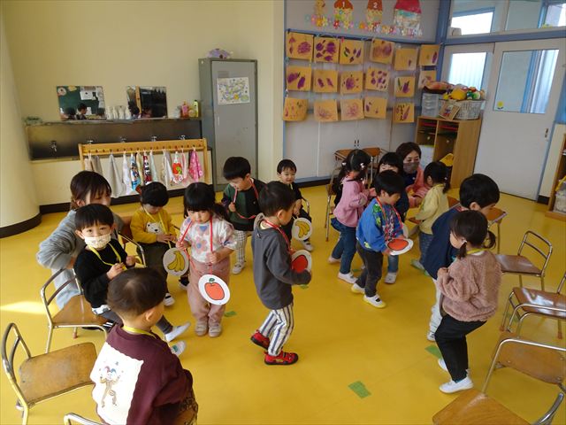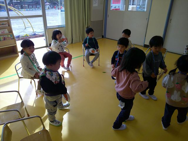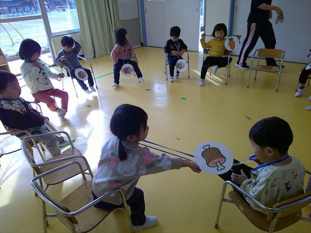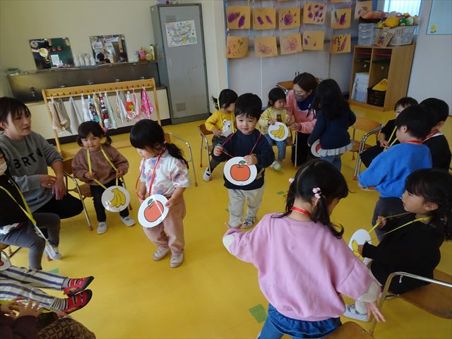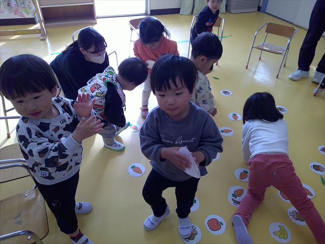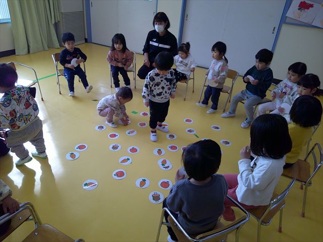 ^-^)また、以前取り組んだフルーツバスケットでも遊んでみました。内容をよく覚えている子が多く、ルールもすぐに思い出して楽しく遊んでいました!(^^)!今度は違う食べ物でも取り組んでみたいと思います。そして、フルーツバスケットで使ったペンダントは、運動会の親子競技で使う予定だったものですので、今日ご褒美として持ち帰りました!ぜひご家庭でご活用ください☆