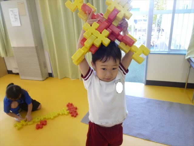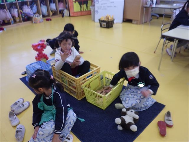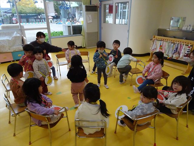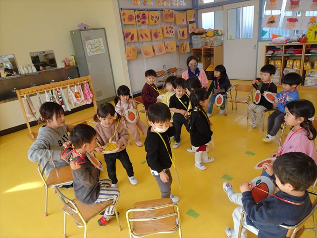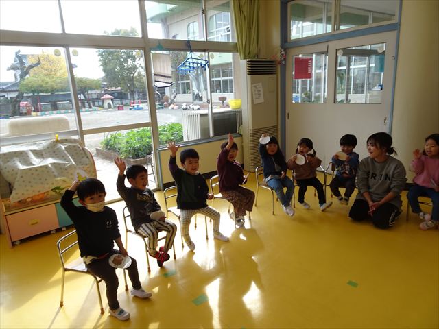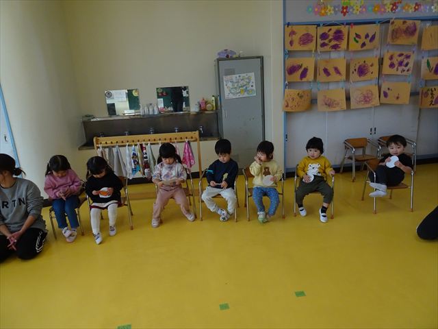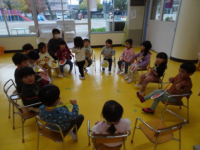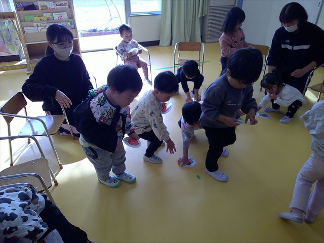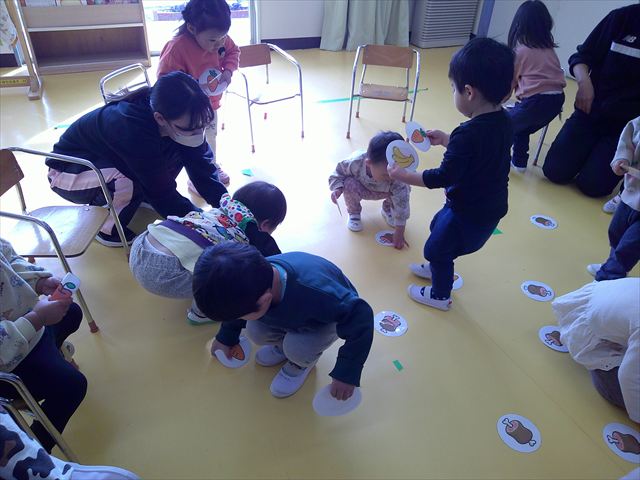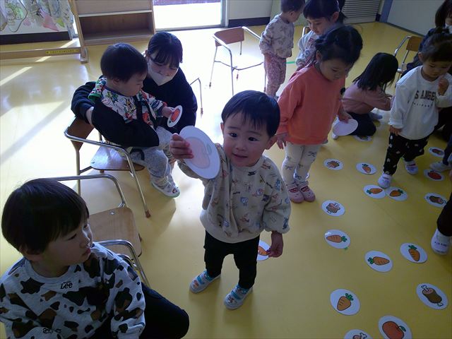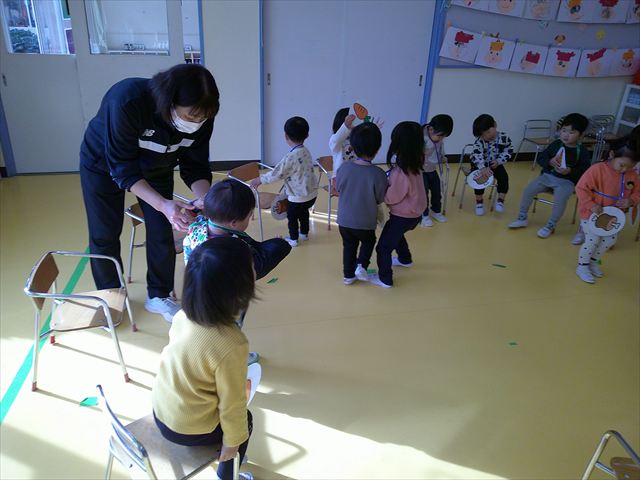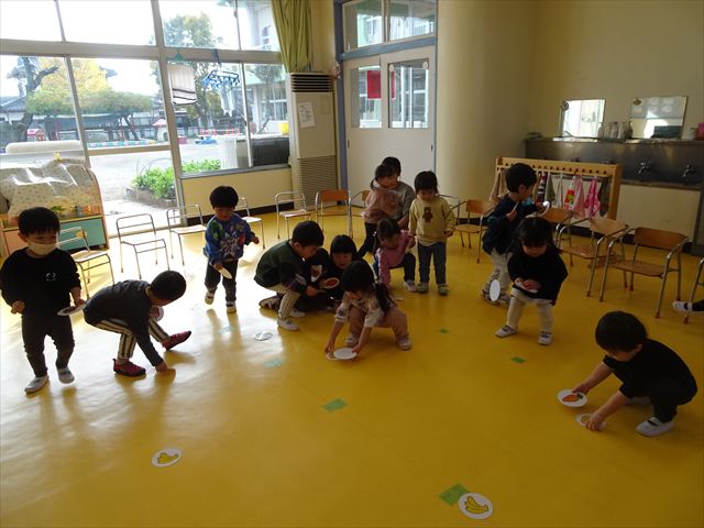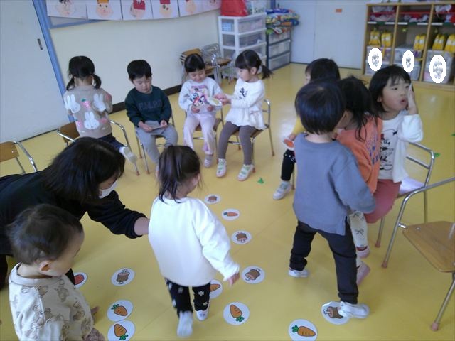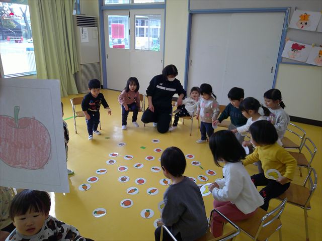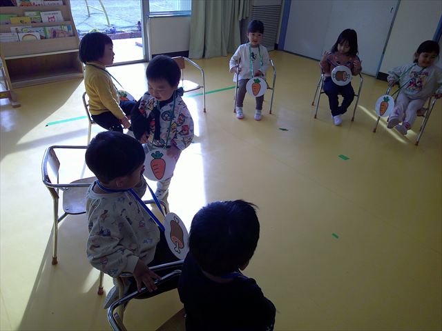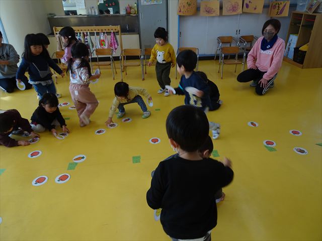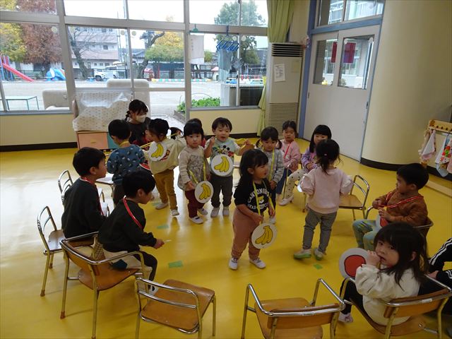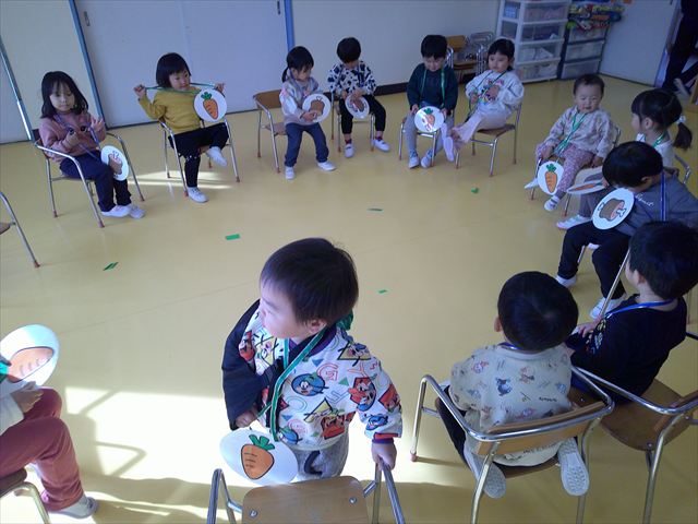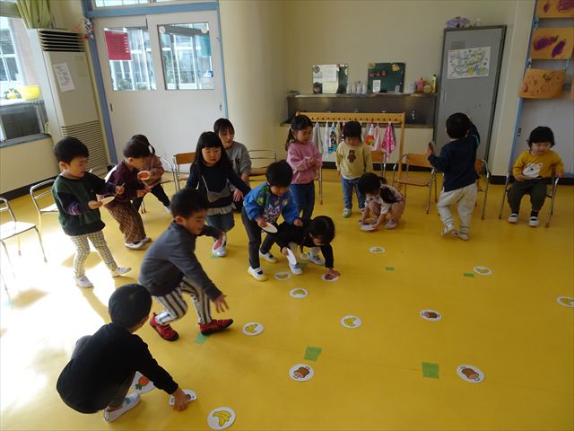 ^-^)また、以前取り組んだフルーツバスケットでも遊んでみました。内容をよく覚えている子が多く、ルールもすぐに思い出して楽しく遊んでいました!(^^)!今度は違う食べ物でも取り組んでみたいと思います。そして、フルーツバスケットで使ったペンダントは、運動会の親子競技で使う予定だったものですので、今日ご褒美として持ち帰りました!ぜひご家庭でご活用ください☆